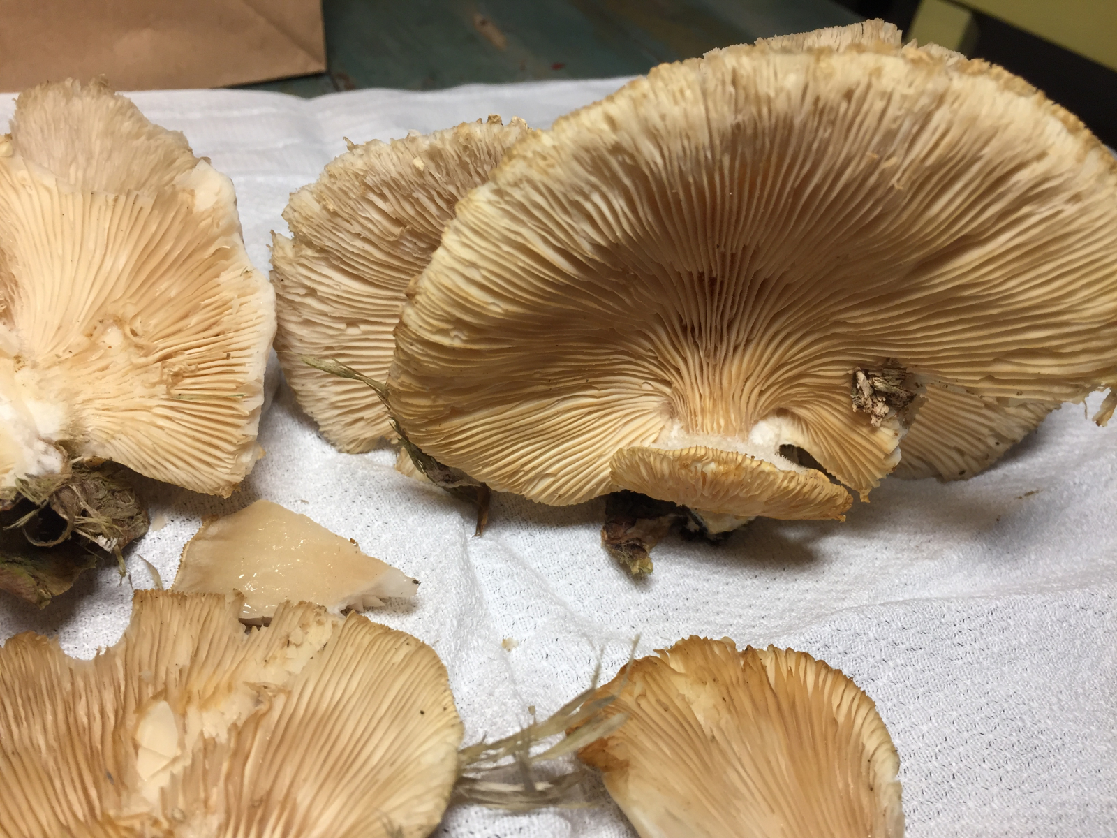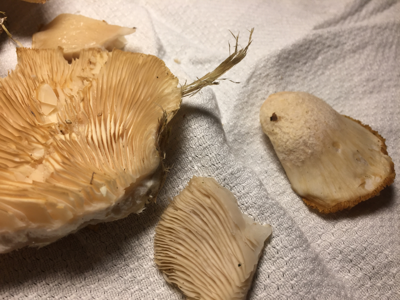 Die Lamellen sehen sehr ähnlich aus aber etwas gelblicher. Sie hatten keinen gelben Stiel und riechen wie Austernseitlinge eher unaufregend pilzig. Am Hutansatz findet sich auf einigen ein weißer Pelz.