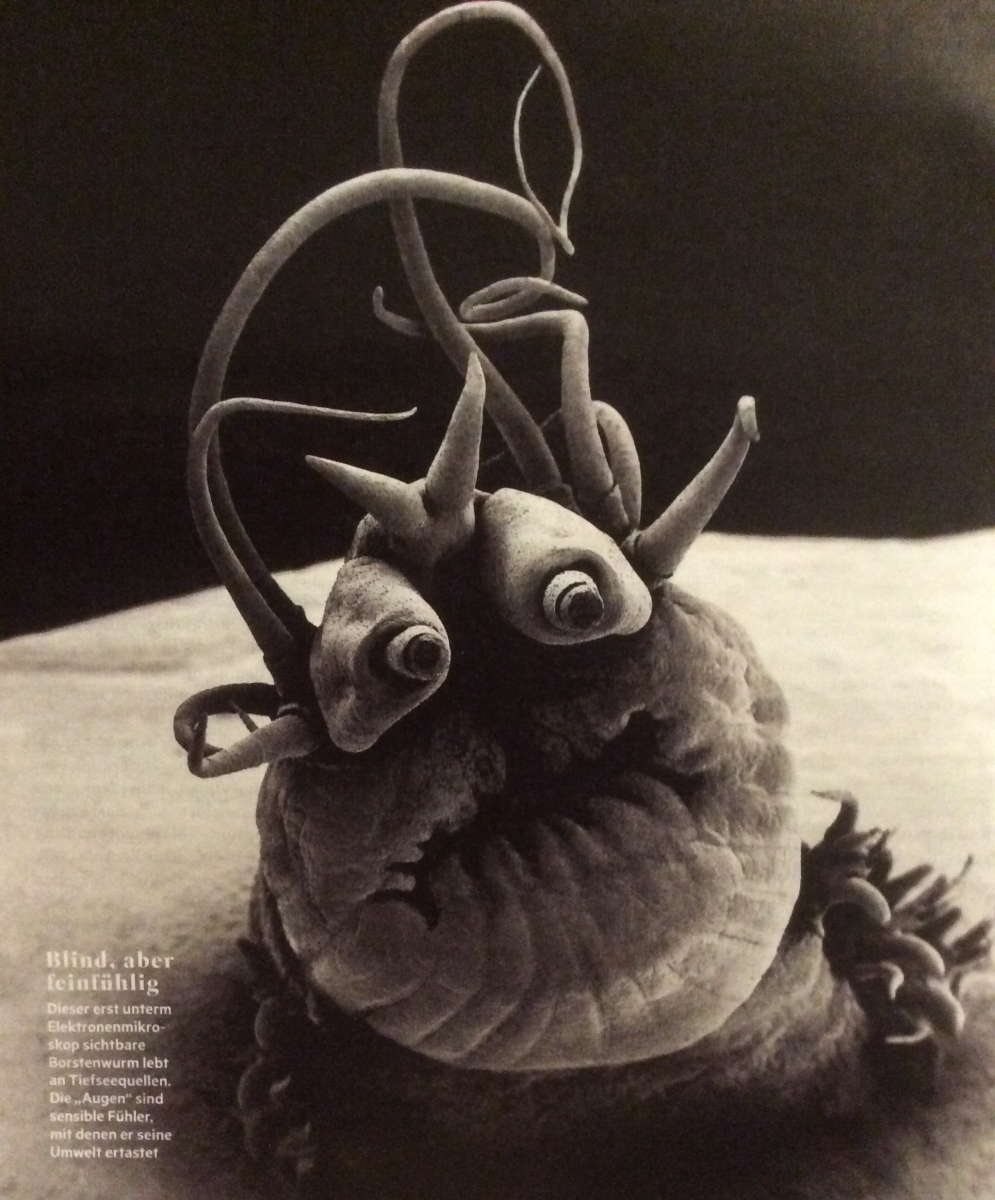 Die Organismen, die da so leben sind z.B. Muscheln, Schnecken, Krebse, Krabben, Anemonen, Seesterne etc. Den größten Anteil bilden aber eigentlich fast immer die Polychäten - Vielborsterwürmer. Verwandt mit den deutlich bekannteren Regenwürmern (das sind Oligochäten - Wenigborster). Beide Gruppen zeichnen sich dadurch aus, dass sie einen in Segmente unterteilten Körper haben (heißen auch Ringelwürmer). Polychäten haben an jedem Segment ein mehr oder weniger dichtes Bündel an Borsten, Wenigborster oft nur ein bis drei Härchen. Polychäten sind aber deutlich variabler in Form und Funktion - es gibt sehr mobile, große räuberische Würmer, welche die in einer festen Röhre wohnen und mit einer Tentakelkrone das Wasser nach Futter filtern, wieder andere - z.B. die Wattwürmer - leben im Sediment und bauen dort Wohngänge, die wiederum Sauerstoff in tiefere Schichten des Sediments bringen. Einige sind auch komplett planktonisch, leben also nur im Freiwasser der Ozeane und haben mit dem Meeresboden nichts zu tun.