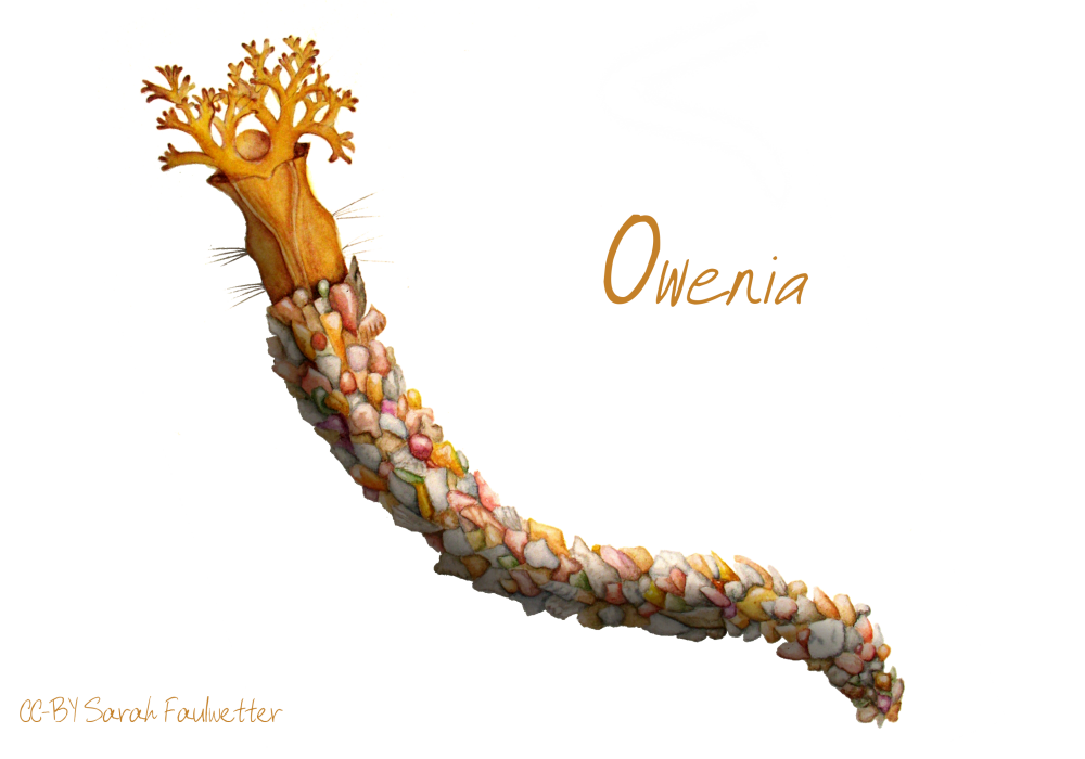 Die Organismen, die da so leben sind z.B. Muscheln, Schnecken, Krebse, Krabben, Anemonen, Seesterne etc. Den größten Anteil bilden aber eigentlich fast immer die Polychäten - Vielborsterwürmer. Verwandt mit den deutlich bekannteren Regenwürmern (das sind Oligochäten - Wenigborster). Beide Gruppen zeichnen sich dadurch aus, dass sie einen in Segmente unterteilten Körper haben (heißen auch Ringelwürmer). Polychäten haben an jedem Segment ein mehr oder weniger dichtes Bündel an Borsten, Wenigborster oft nur ein bis drei Härchen. Polychäten sind aber deutlich variabler in Form und Funktion - es gibt sehr mobile, große räuberische Würmer, welche die in einer festen Röhre wohnen und mit einer Tentakelkrone das Wasser nach Futter filtern, wieder andere - z.B. die Wattwürmer - leben im Sediment und bauen dort Wohngänge, die wiederum Sauerstoff in tiefere Schichten des Sediments bringen. Einige sind auch komplett planktonisch, leben also nur im Freiwasser der Ozeane und haben mit dem Meeresboden nichts zu tun.