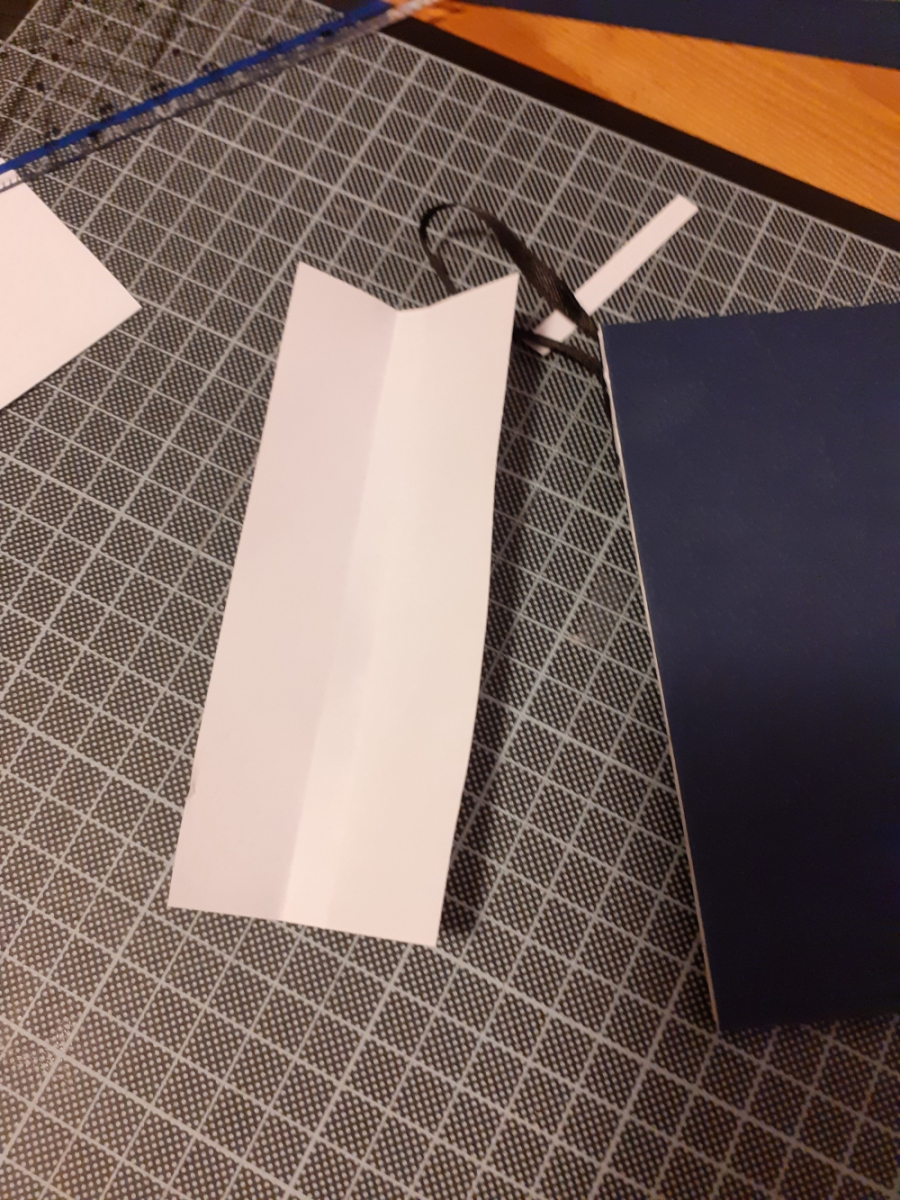 Einen Mittelstreifen für den Buchrücken ausschneiden, der sollte so breit sein wie der Textblock. Ich habe den aus dem festen Karton ausgeschnitten, aber aus dünnerer Pappe ist besser, damit er sich etwas biegen kann später, wenn man das Buch aufmacht. Also kleiner Fehler hier, nicht nachmachen.