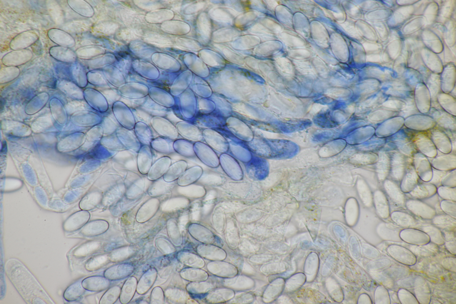 Basidien sind 4-sporig, die Sporen messen (14.7+.0.7) µm x (7.9+-0.5) µm, Q=1.9+-0.1, bzw. (13.5-15.7) µm x (7.3-9.0) µm, Q=1.7-2.0