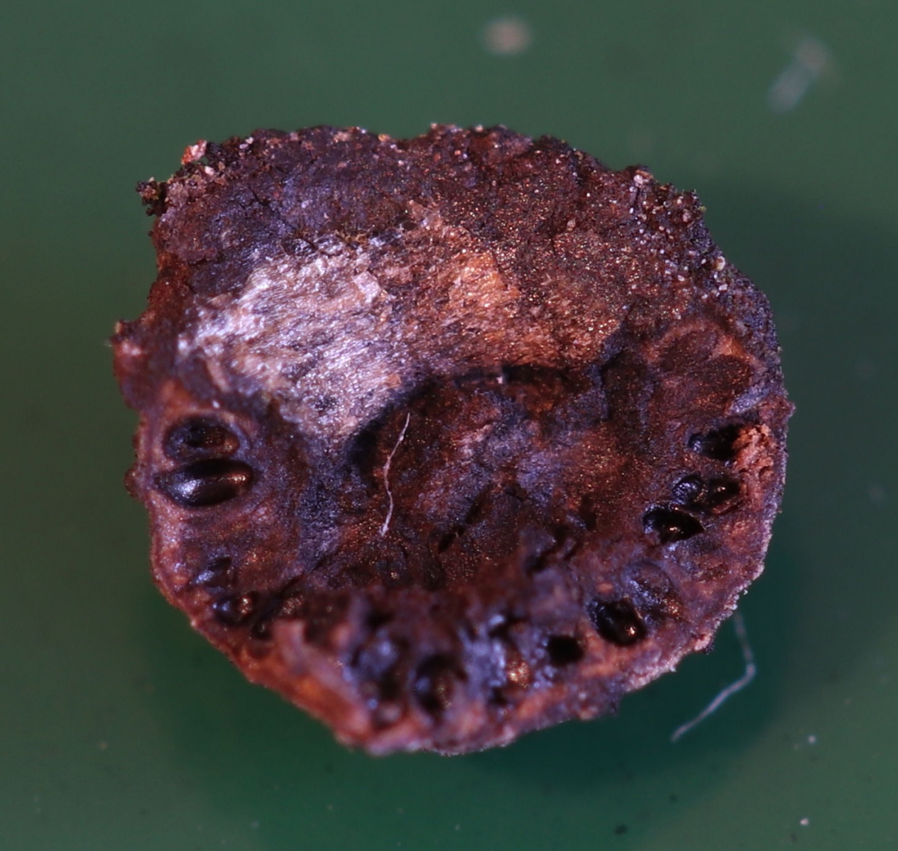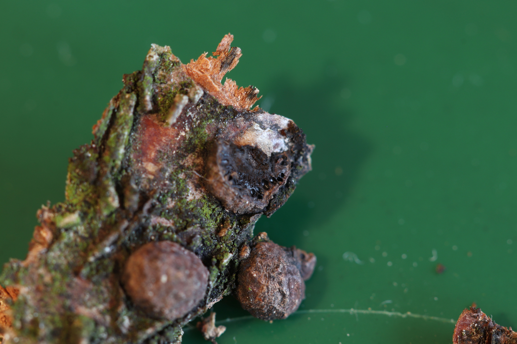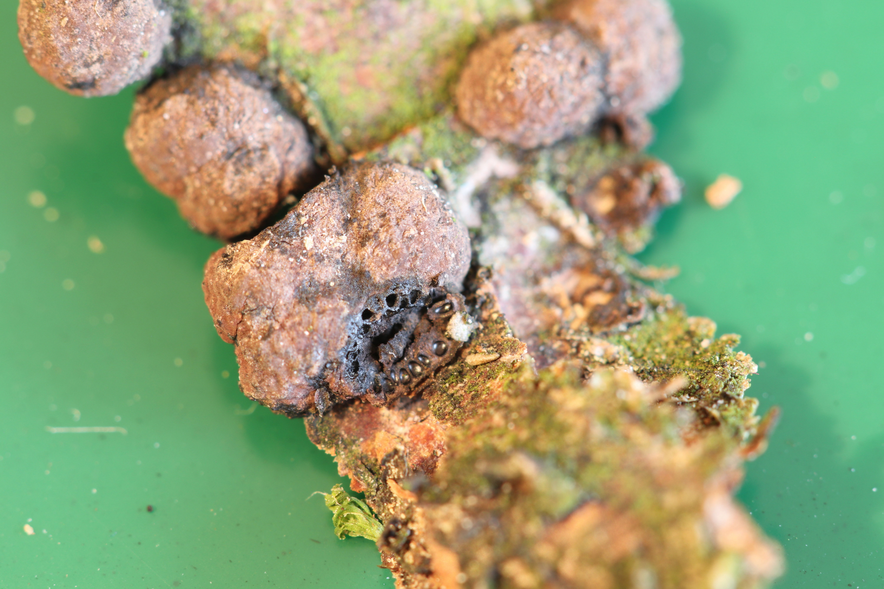 ich habe diesen Pilz am 18.1. auf einem toten Haselzweig in Ostwestfalen gefunden, der Durchmesser der einzelnen Fruchtkörper beträgt etwa 2-3mm. Ich vermute eine Diatrype-Art, oder könnte es noch etwas anderes sein?