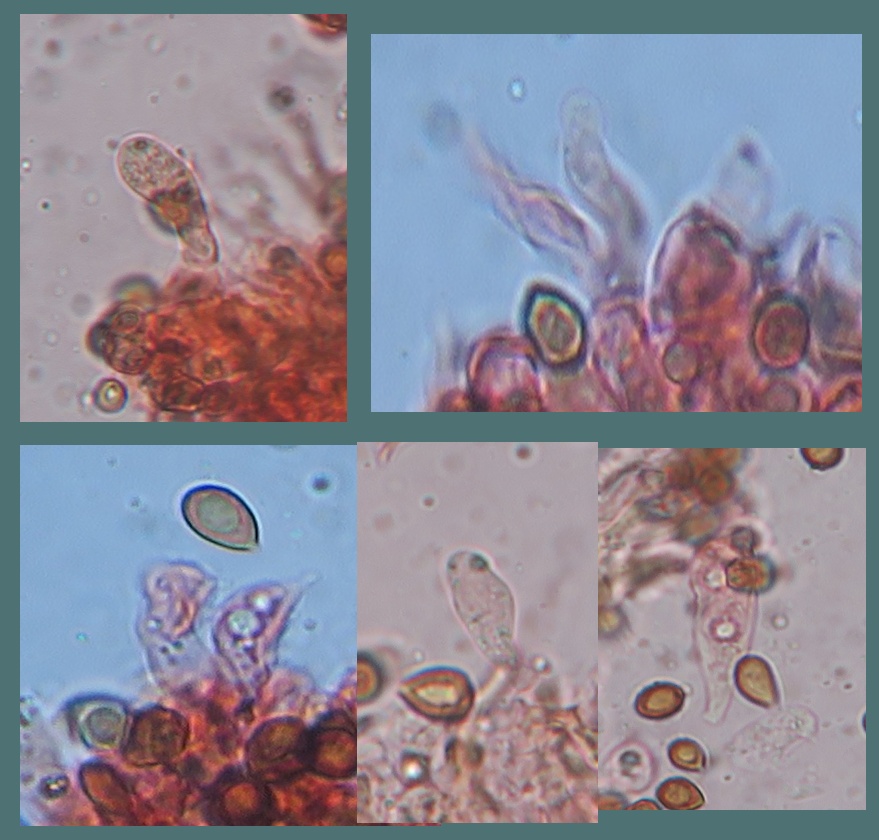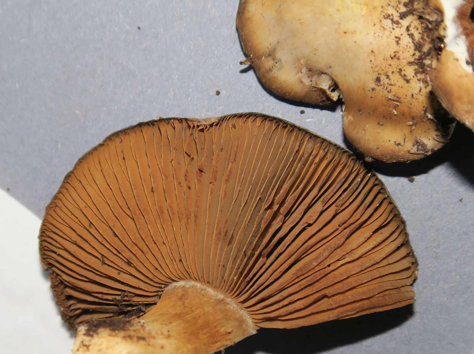 Three specimens under Cistus and Thymus. Pileus 5-6cm, pale yellow, dry, though, glabrous-polished (when cleaned from debris), very bitter taste, no volva or ring or veil (at least not distinct), spore print light cinnamon brown, lamella adnate, stem shiny pale brown. Spores pip-shaped, surface rough (bumpy). IKI inamyloid (cell wall appears dextroid?!).