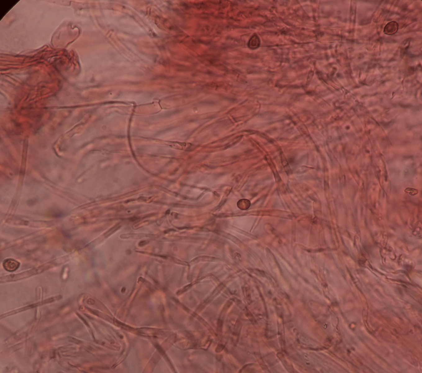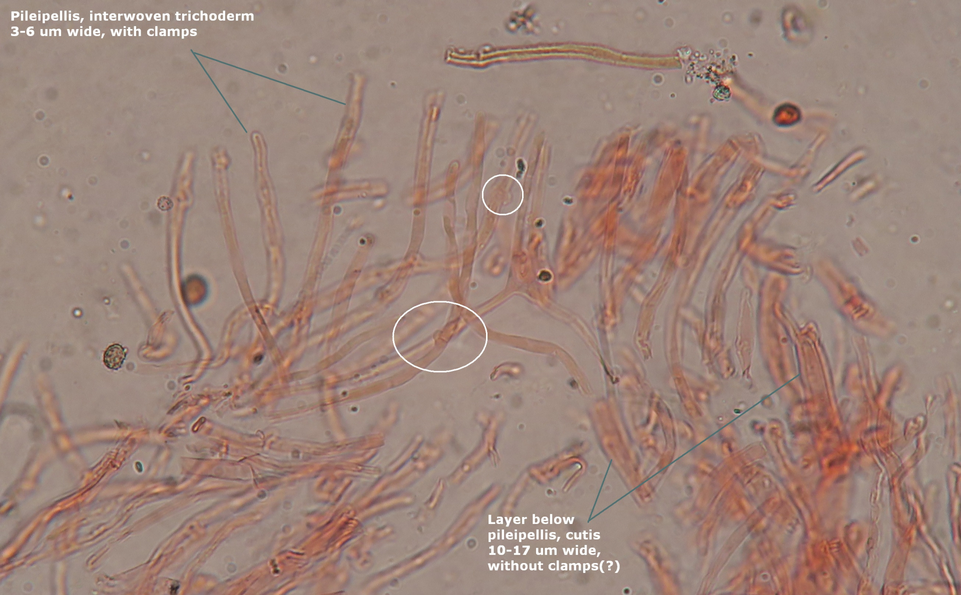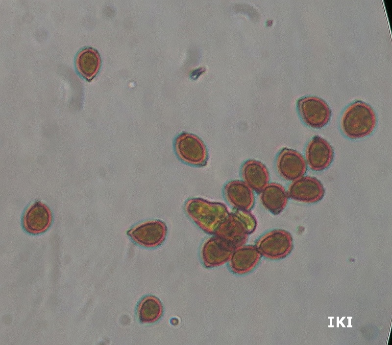 Three specimens under Cistus and Thymus. Pileus 5-6cm, pale yellow, dry, though, glabrous-polished (when cleaned from debris), very bitter taste, no volva or ring or veil (at least not distinct), spore print light cinnamon brown, lamella adnate, stem shiny pale brown. Spores pip-shaped, surface rough (bumpy). IKI inamyloid (cell wall appears dextroid?!).