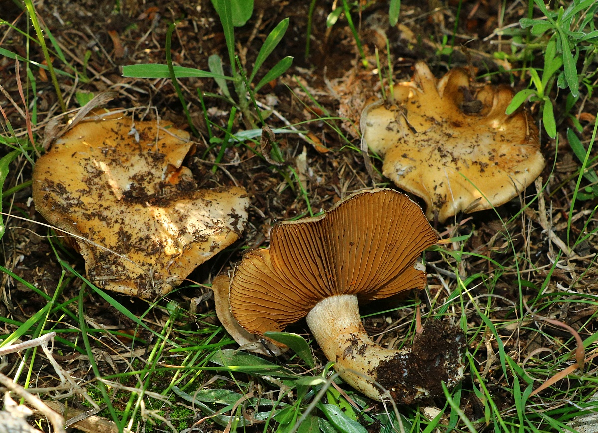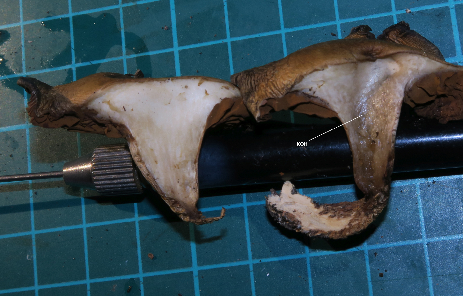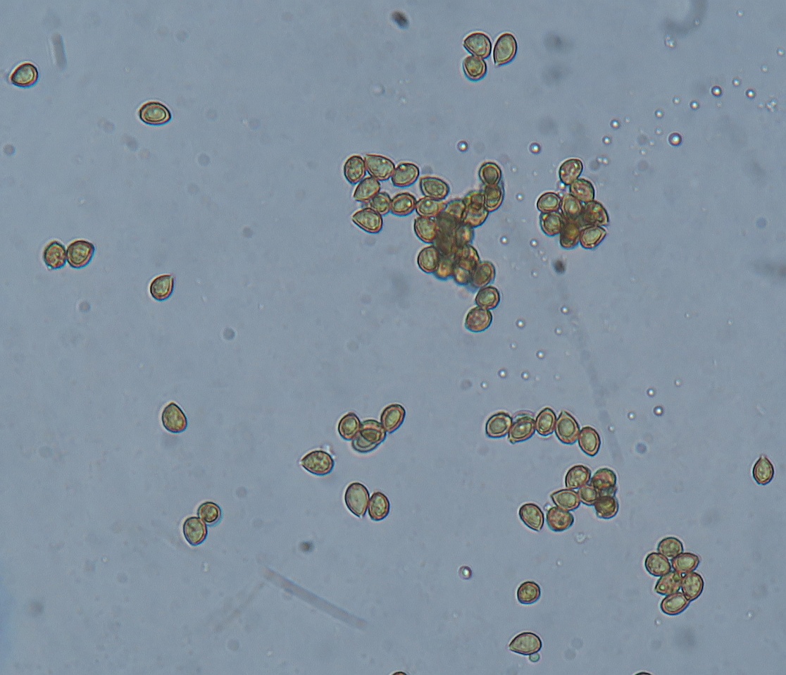 Three specimens under Cistus and Thymus. Pileus 5-6cm, pale yellow, dry, though, glabrous-polished (when cleaned from debris), very bitter taste, no volva or ring or veil (at least not distinct), spore print light cinnamon brown, lamella adnate, stem shiny pale brown. Spores pip-shaped, surface rough (bumpy). IKI inamyloid (cell wall appears dextroid?!).