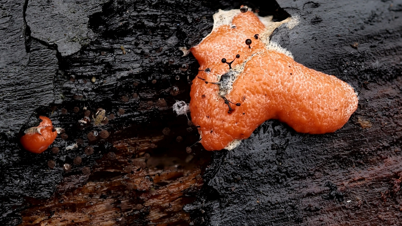 Schleimpilze mit Hintergrund verkohltes Holz hat auch etwas. Dictydiaethalium plumbeum + Comatricha nigra