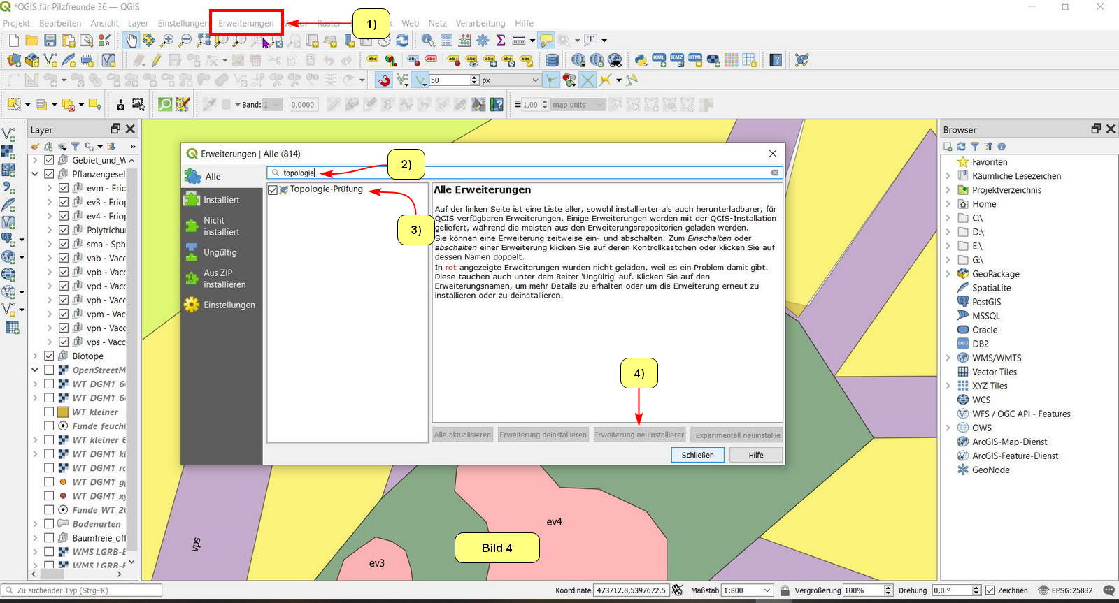 Die Installation zeigt Bild 4: Man clickt also auf Erweiterungen (1), gibt im sich öffnenden Menü im Suchfenster topologie ein und übernimmt das Plugin via (3) und (4):