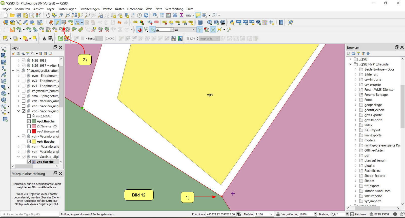 Bewegt man den Mauszeiger im Bereich der vps_flaeche, werden sämtliche Knoten dieses Polygons als Punkte hervorgehoben. Wir sehen die Reaktion, wenn man den Mauszeiger in den Bereich des unteren Segnments von vps_flaeche hineinbewegt (4).