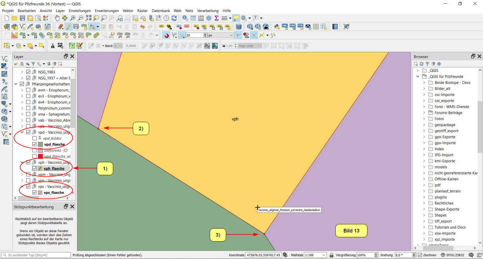 Nun wird das Polygon vph_flaeche editiert: Im Layerfenster bleiben die relevanten drei Polygone weiterhin sichtbar geschaltet, d.h. angehakt. Wir selektieren vph_flaeche durch Anclicken (1). Dann platzieren wir Knoten 2 auf die Position von Knoten 0 (2) und Knoten 5 auf die Position von Knoten 3 (3). Bild 13 zeigt das Ergebnis: