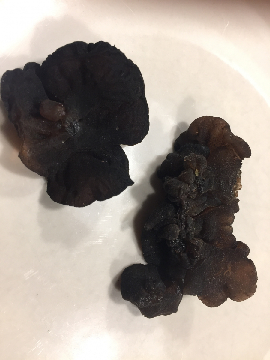 Nr.1 ist eine Exidia, wenn eine Seite richtig rauh und trocken war, würde ich mit E. glandulosa vergleichen; ansonsten mit E. nigricans. So richtig erkenne ich das bei der Bildlage nicht.