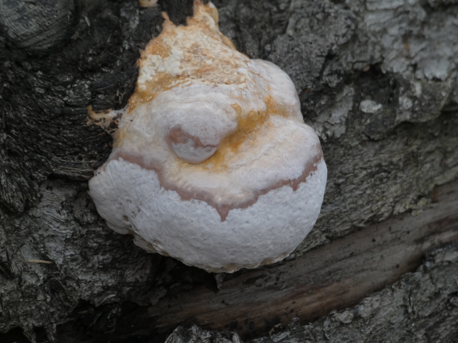 Auf unserer Tour konnten wir unter anderem den folgenden Fund machen - Orangeroter Kammpilz, Phlebia radiata - auf dem wir schon auf den ersten Blick ein Gesicht erkennen konnten: