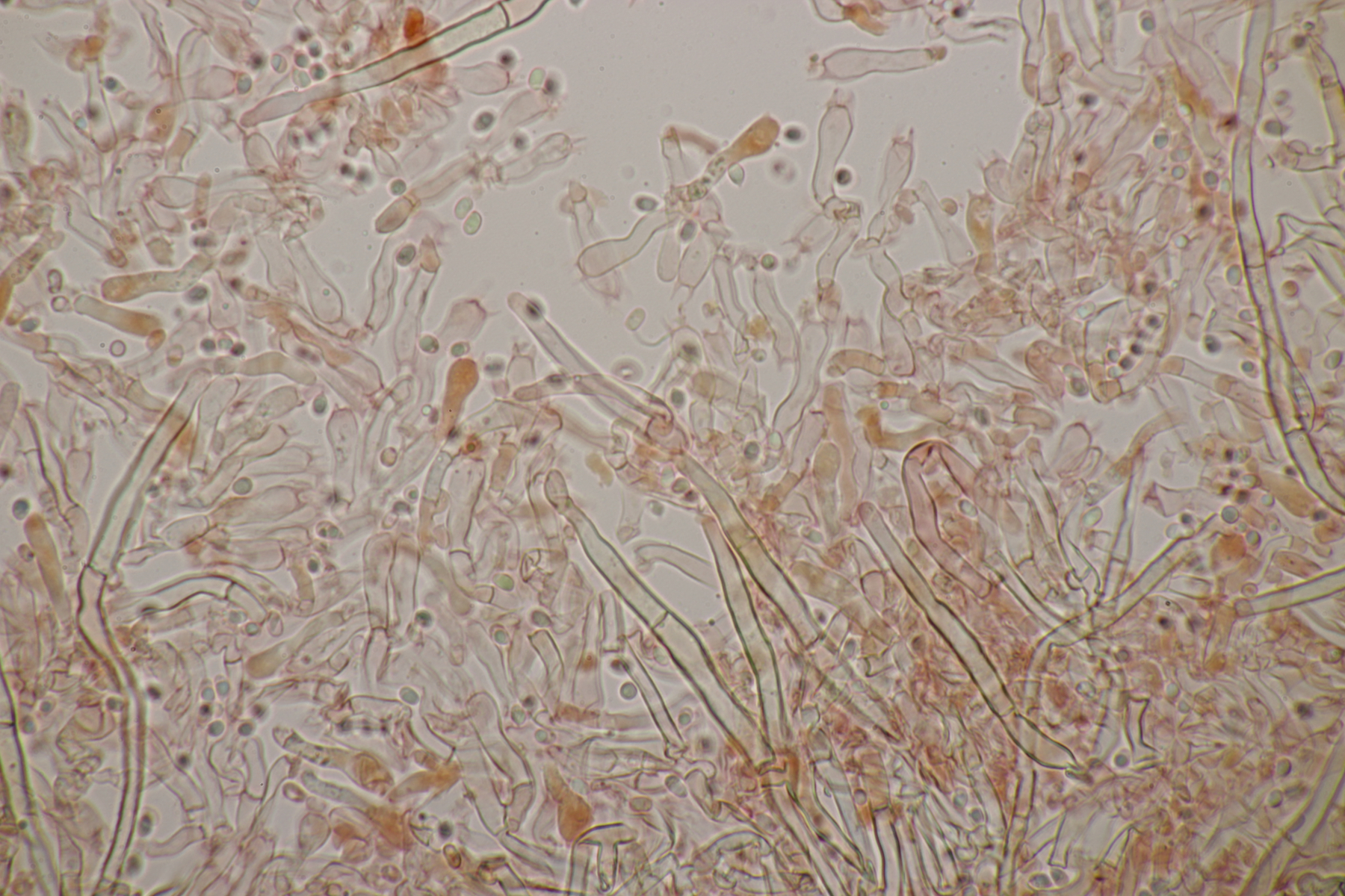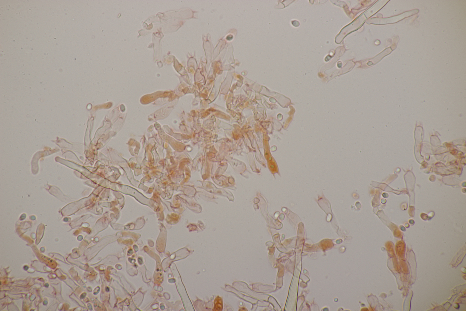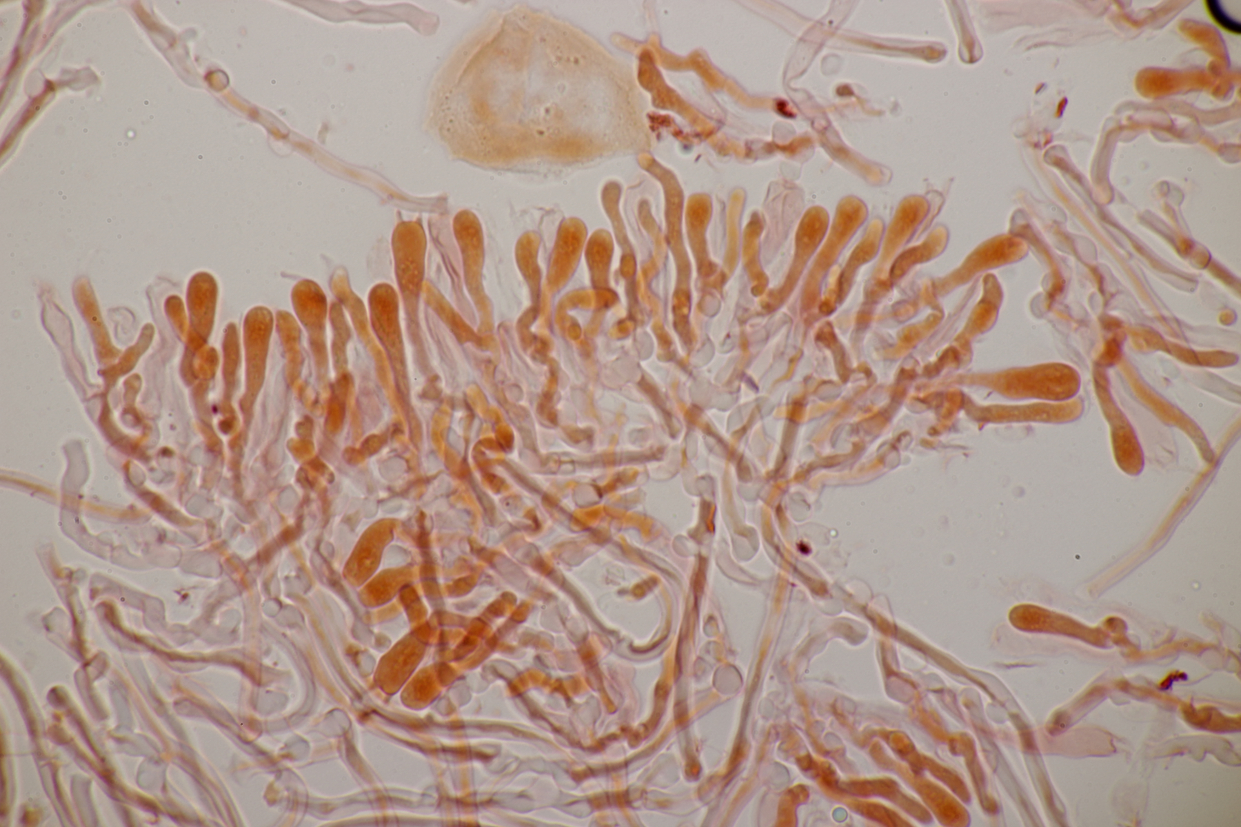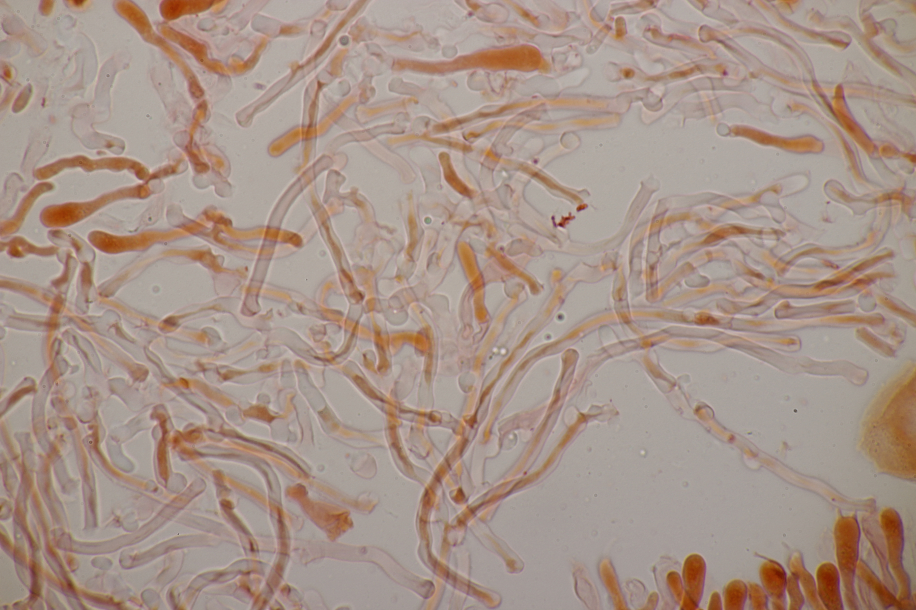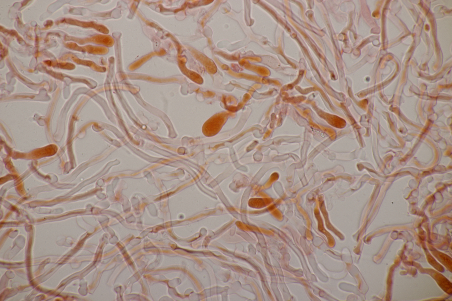 2. An Laubholz, vermutlich Erle fand sich dieser Porling. Schnallen sind vorhanden, Basidien 4-sporig mit Basalschnalle, Zystiden habe ich keine beobachten können. Das Hyphensystem wirkte auf mich monomitisch. Auffallend waren die extrem dicken Wände der generativen Hyphen, die schon fast an Skeletthyphen anderer Porlinge erinnerten. Die Sporen sind auffallend groß (8.7+-0.5) µm x (3.4+-0.2) µm, Q=2.5+-0.2, (7.7-9.7) µm x (3.2-4.1) µm, Q=2.2-2.9. Gibt es da Ideen?