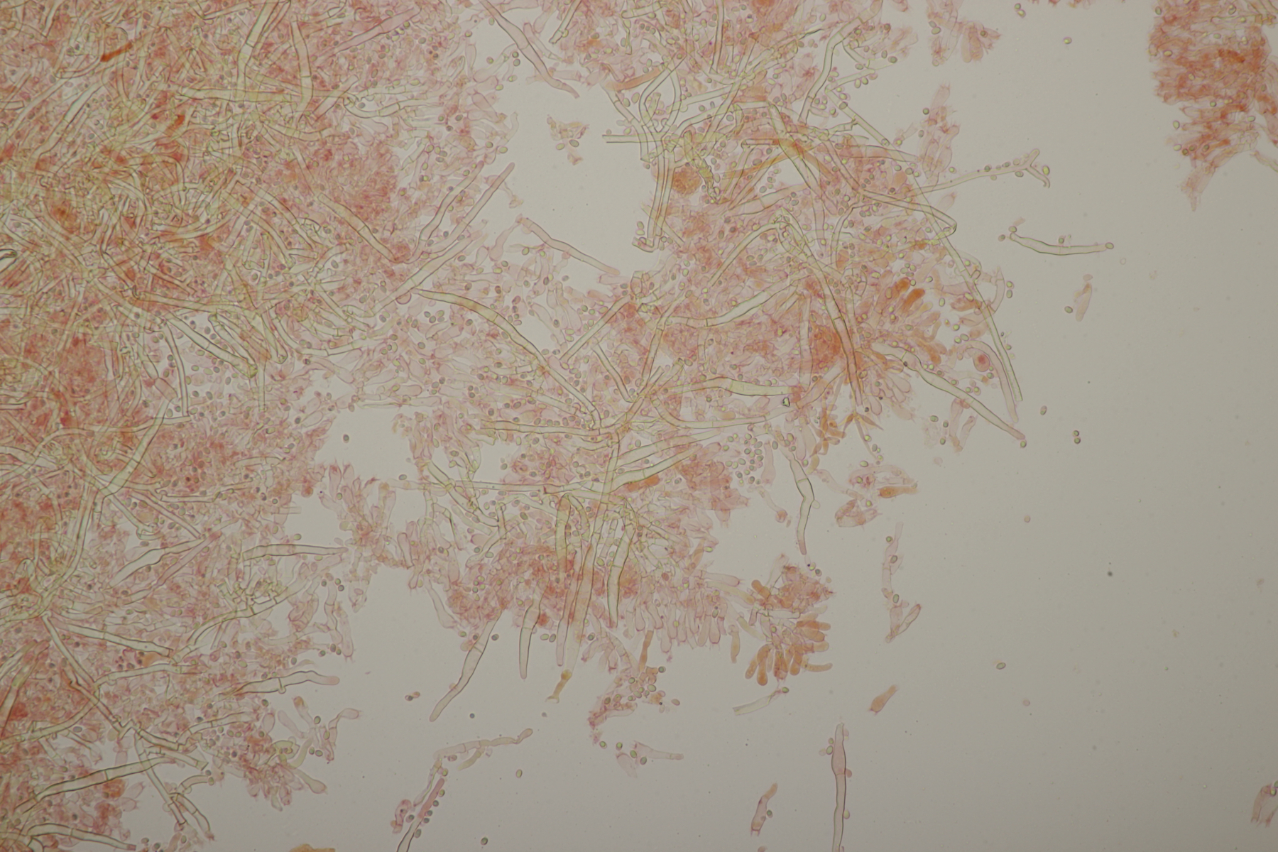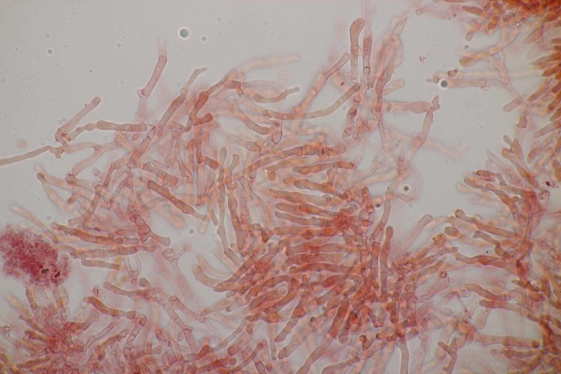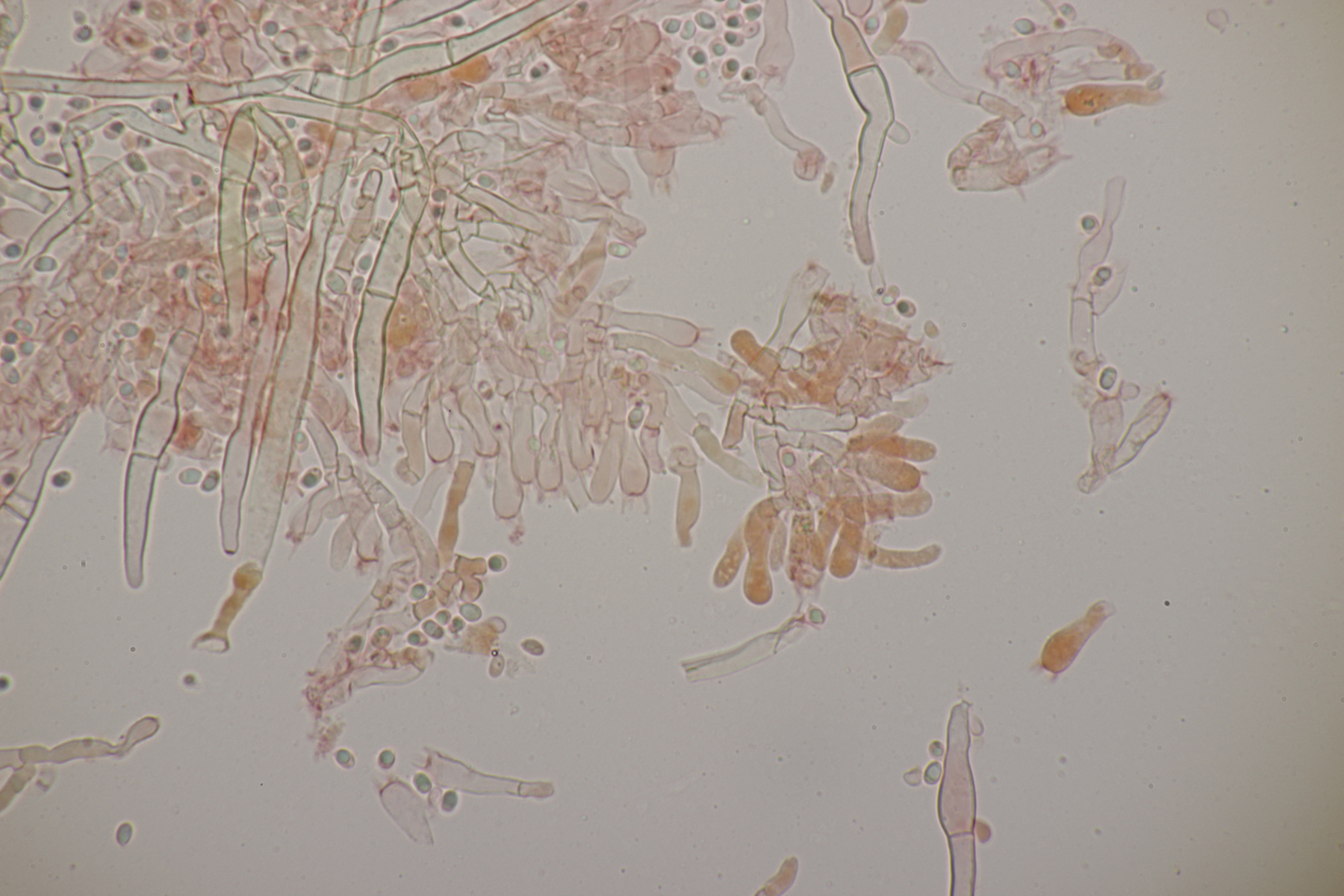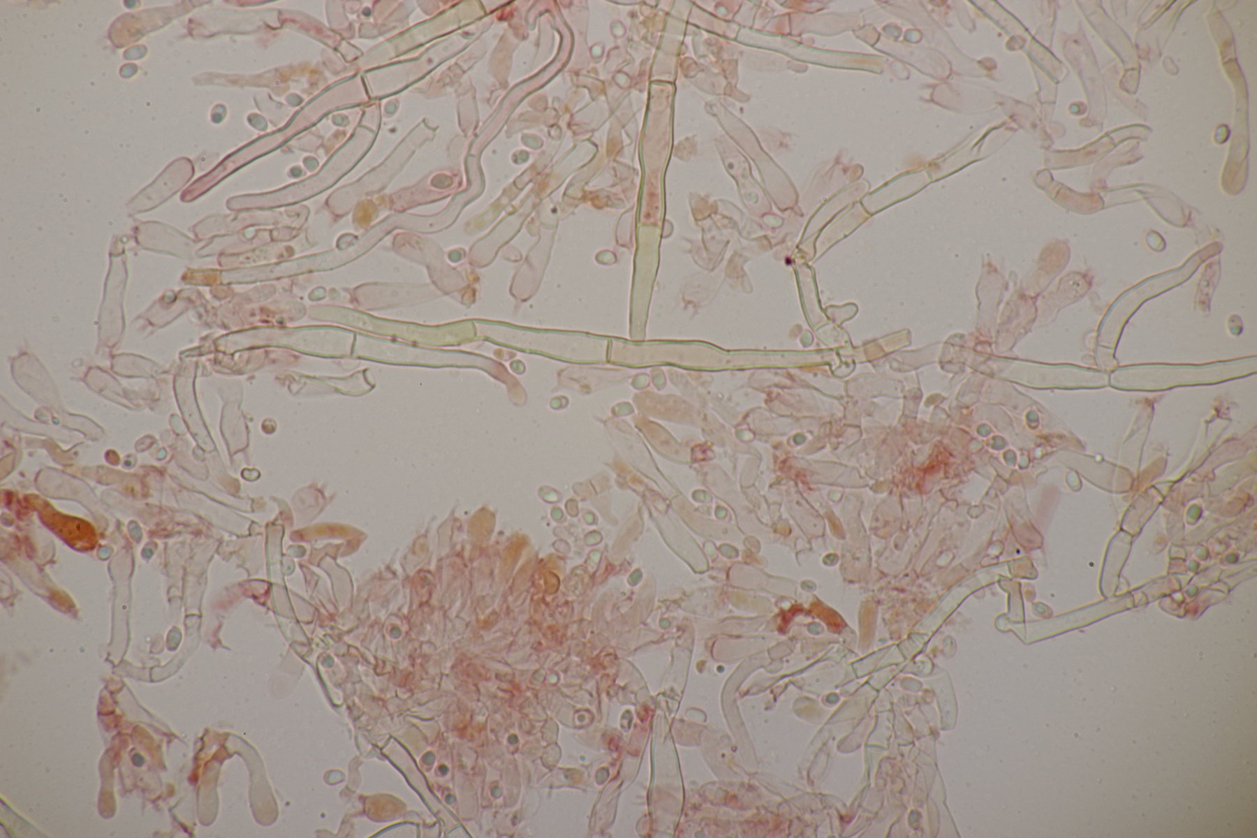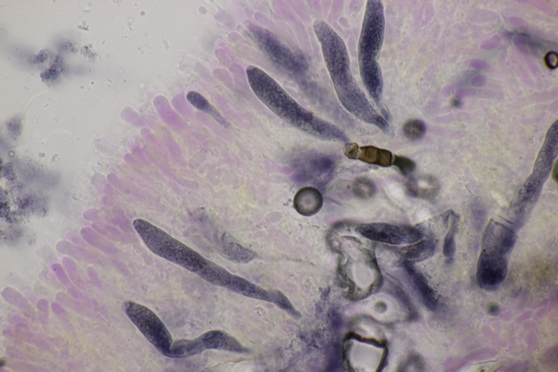 2. An Laubholz, vermutlich Erle fand sich dieser Porling. Schnallen sind vorhanden, Basidien 4-sporig mit Basalschnalle, Zystiden habe ich keine beobachten können. Das Hyphensystem wirkte auf mich monomitisch. Auffallend waren die extrem dicken Wände der generativen Hyphen, die schon fast an Skeletthyphen anderer Porlinge erinnerten. Die Sporen sind auffallend groß (8.7+-0.5) µm x (3.4+-0.2) µm, Q=2.5+-0.2, (7.7-9.7) µm x (3.2-4.1) µm, Q=2.2-2.9. Gibt es da Ideen?