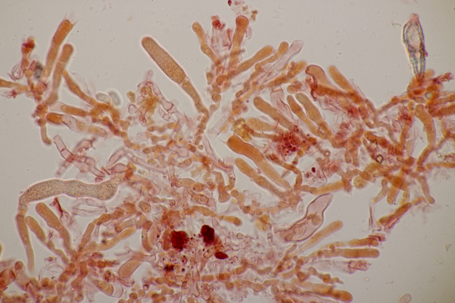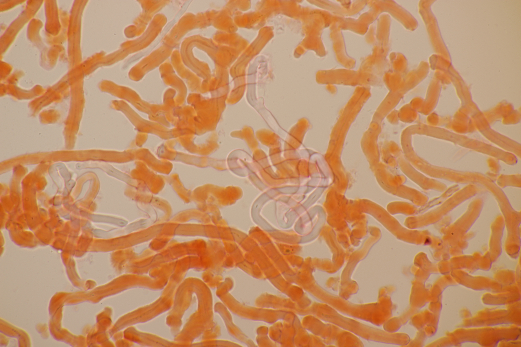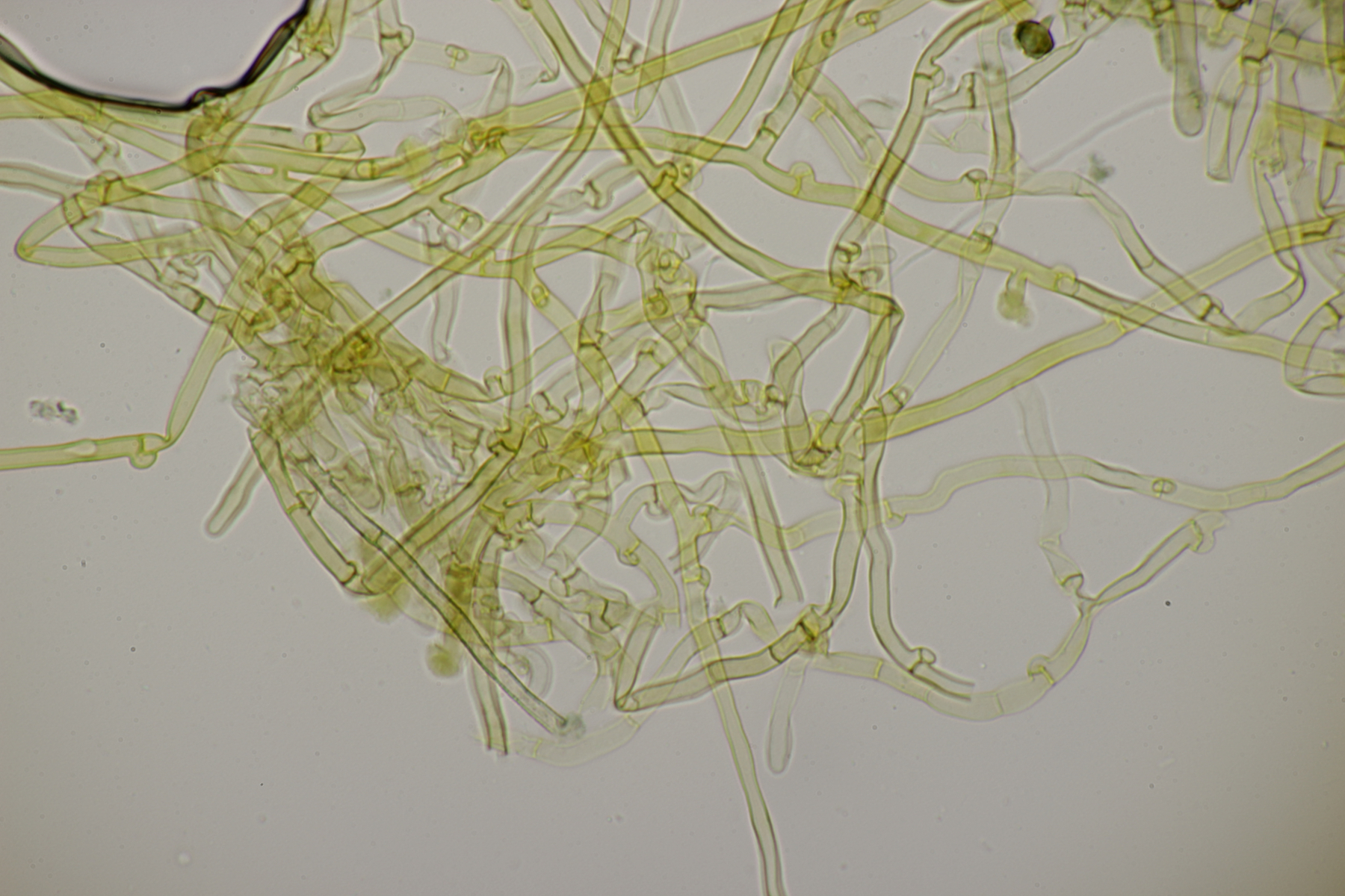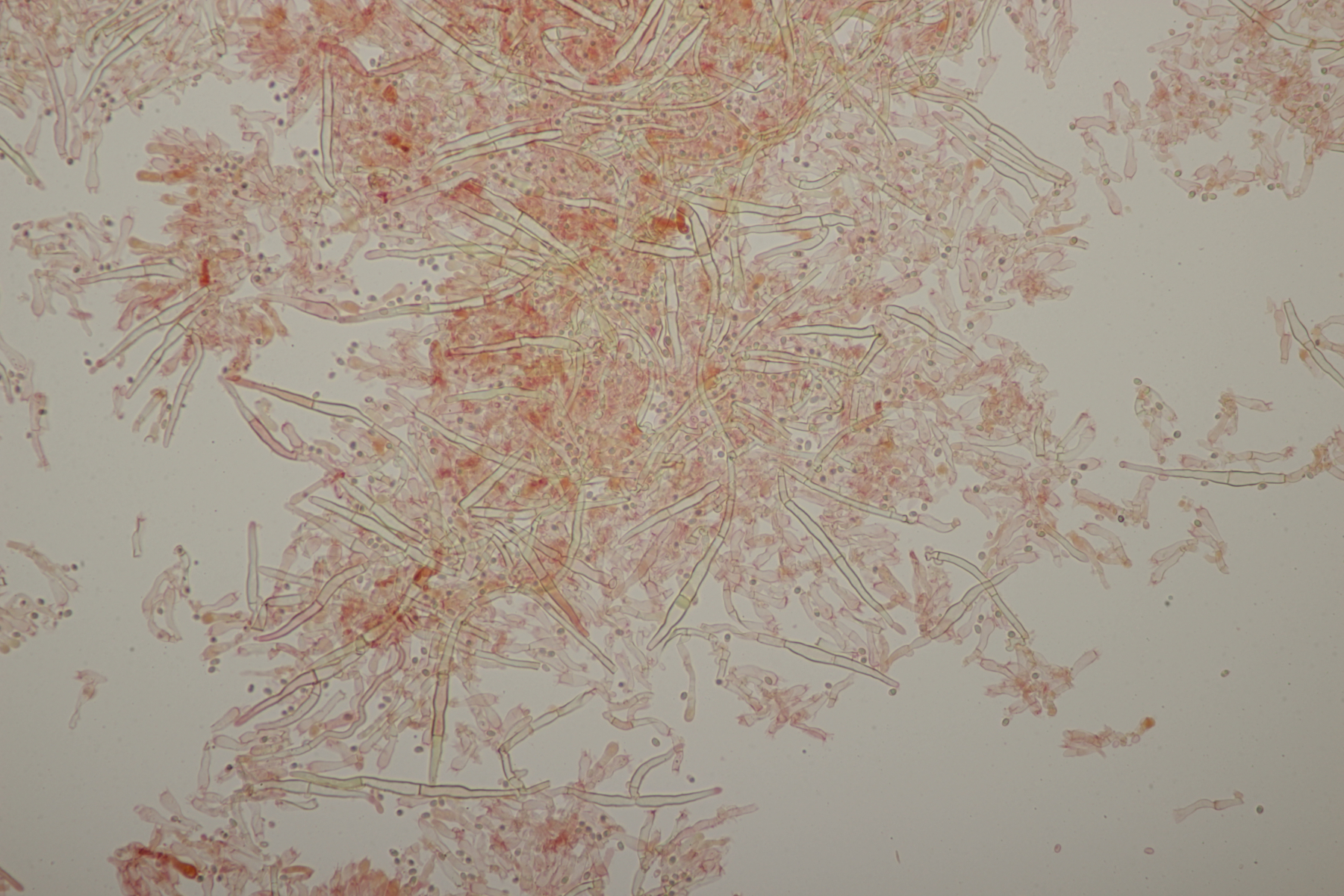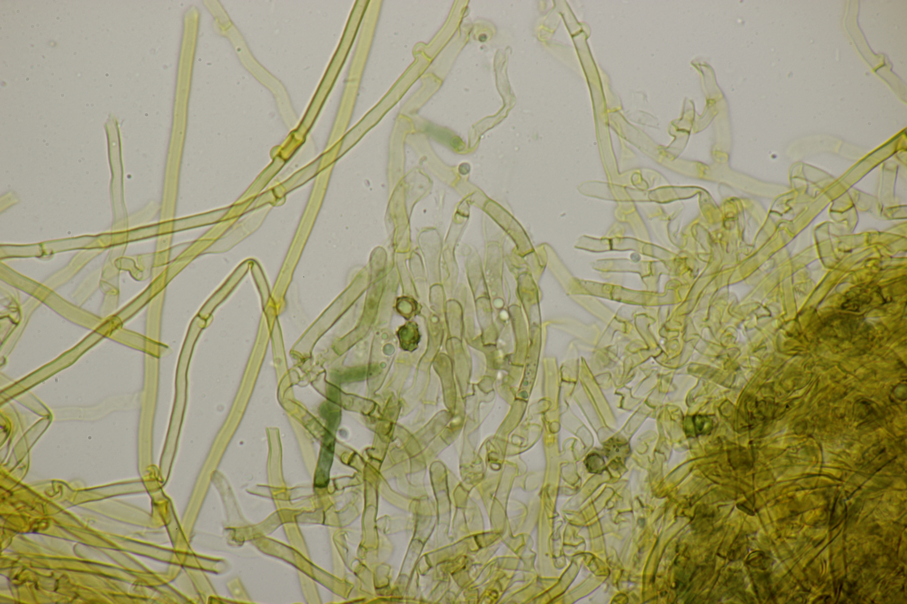 2. An Laubholz, vermutlich Erle fand sich dieser Porling. Schnallen sind vorhanden, Basidien 4-sporig mit Basalschnalle, Zystiden habe ich keine beobachten können. Das Hyphensystem wirkte auf mich monomitisch. Auffallend waren die extrem dicken Wände der generativen Hyphen, die schon fast an Skeletthyphen anderer Porlinge erinnerten. Die Sporen sind auffallend groß (8.7+-0.5) µm x (3.4+-0.2) µm, Q=2.5+-0.2, (7.7-9.7) µm x (3.2-4.1) µm, Q=2.2-2.9. Gibt es da Ideen?