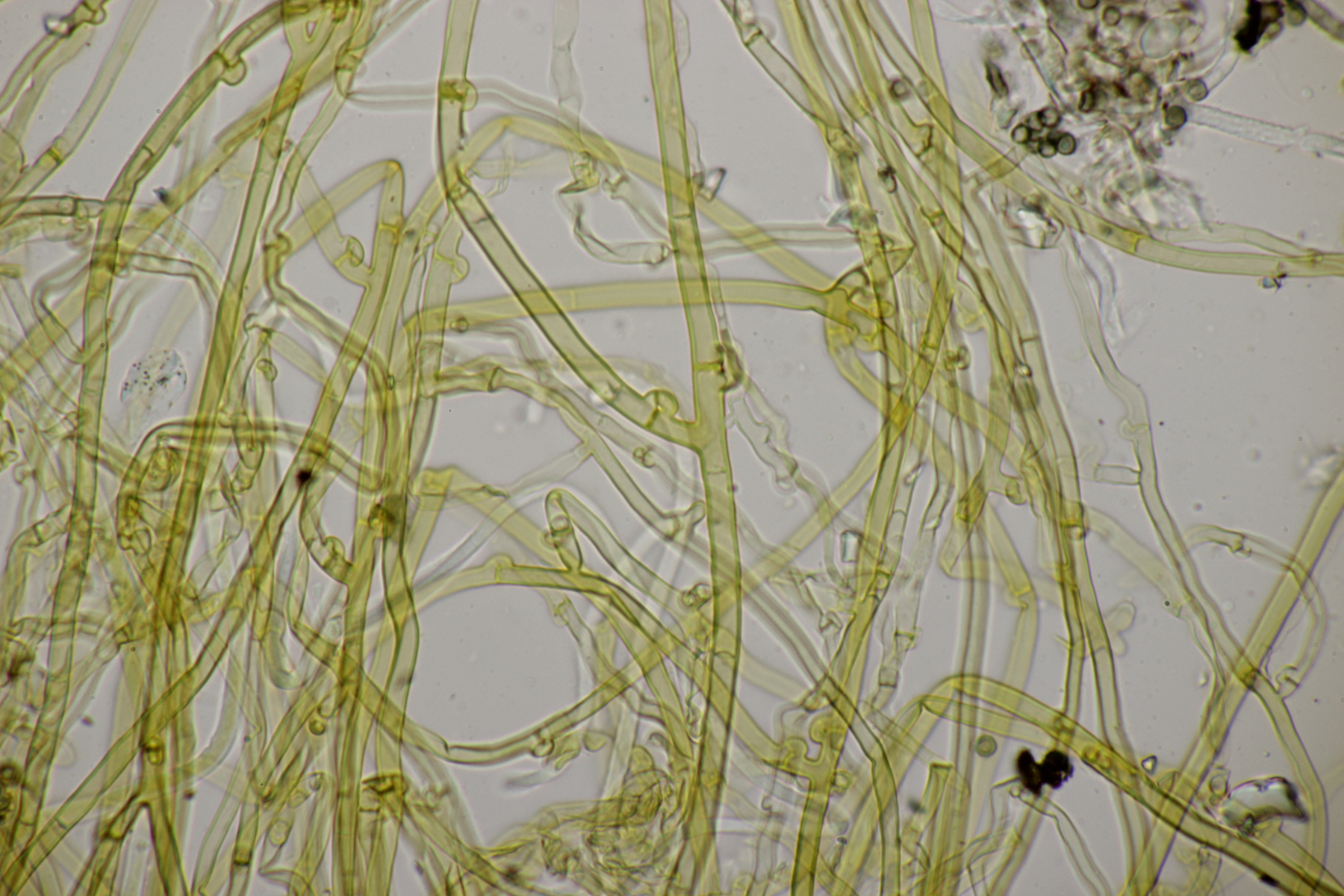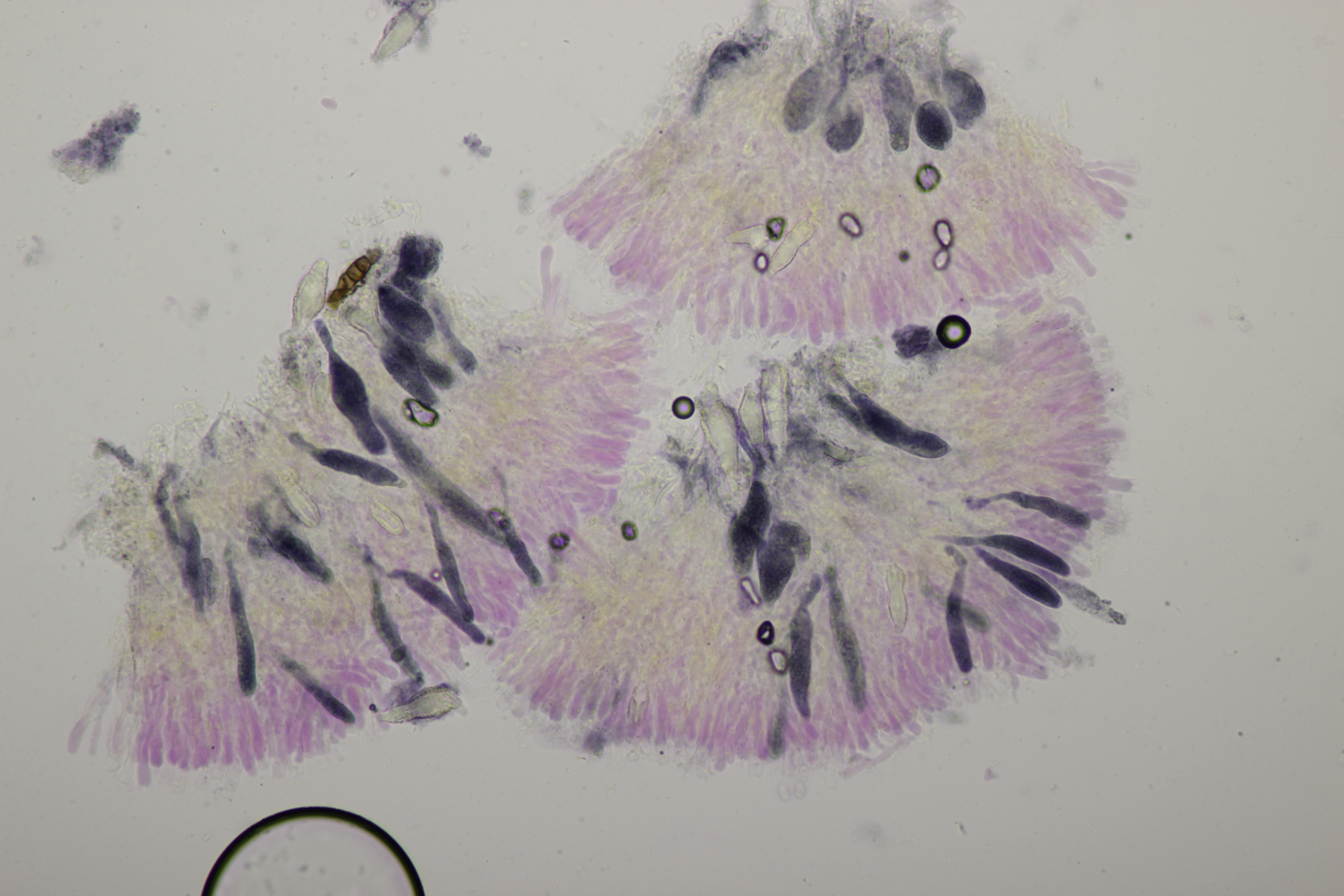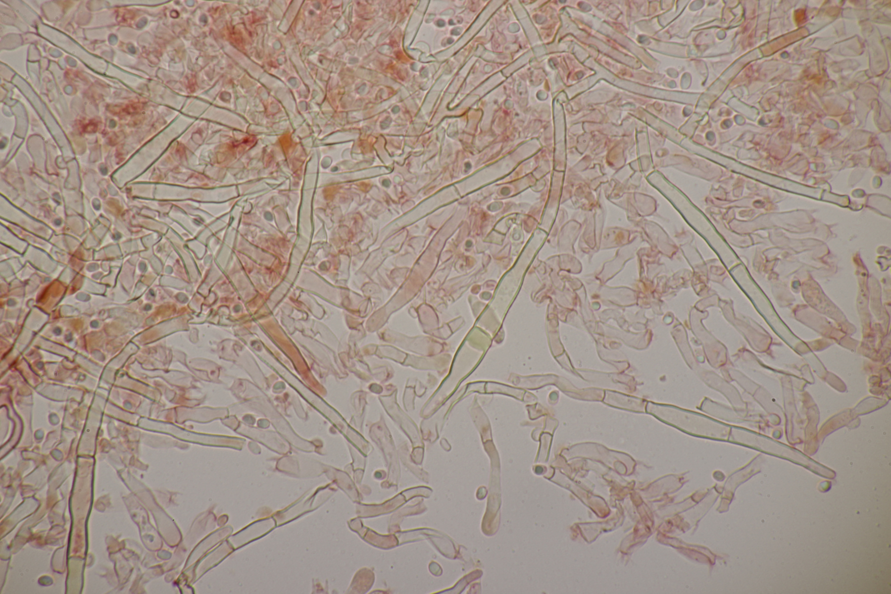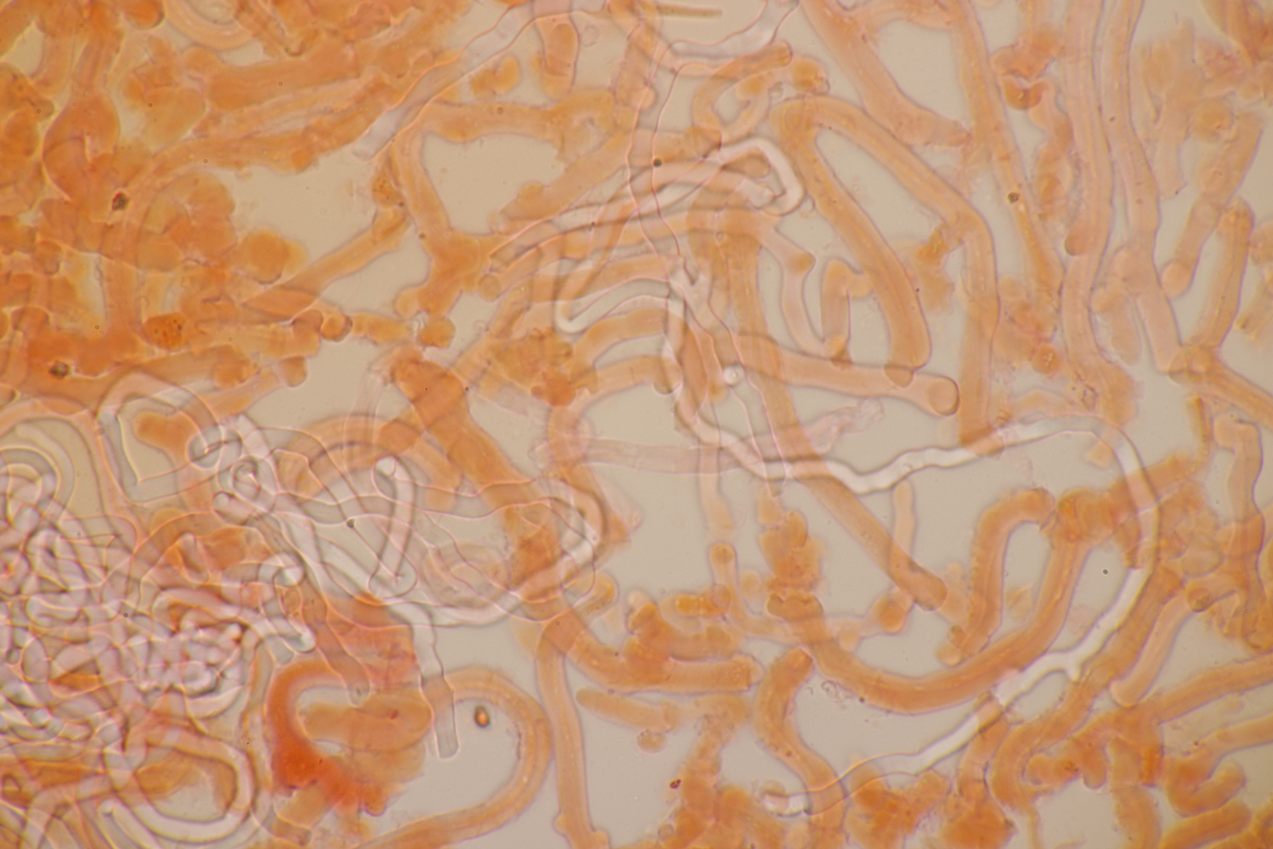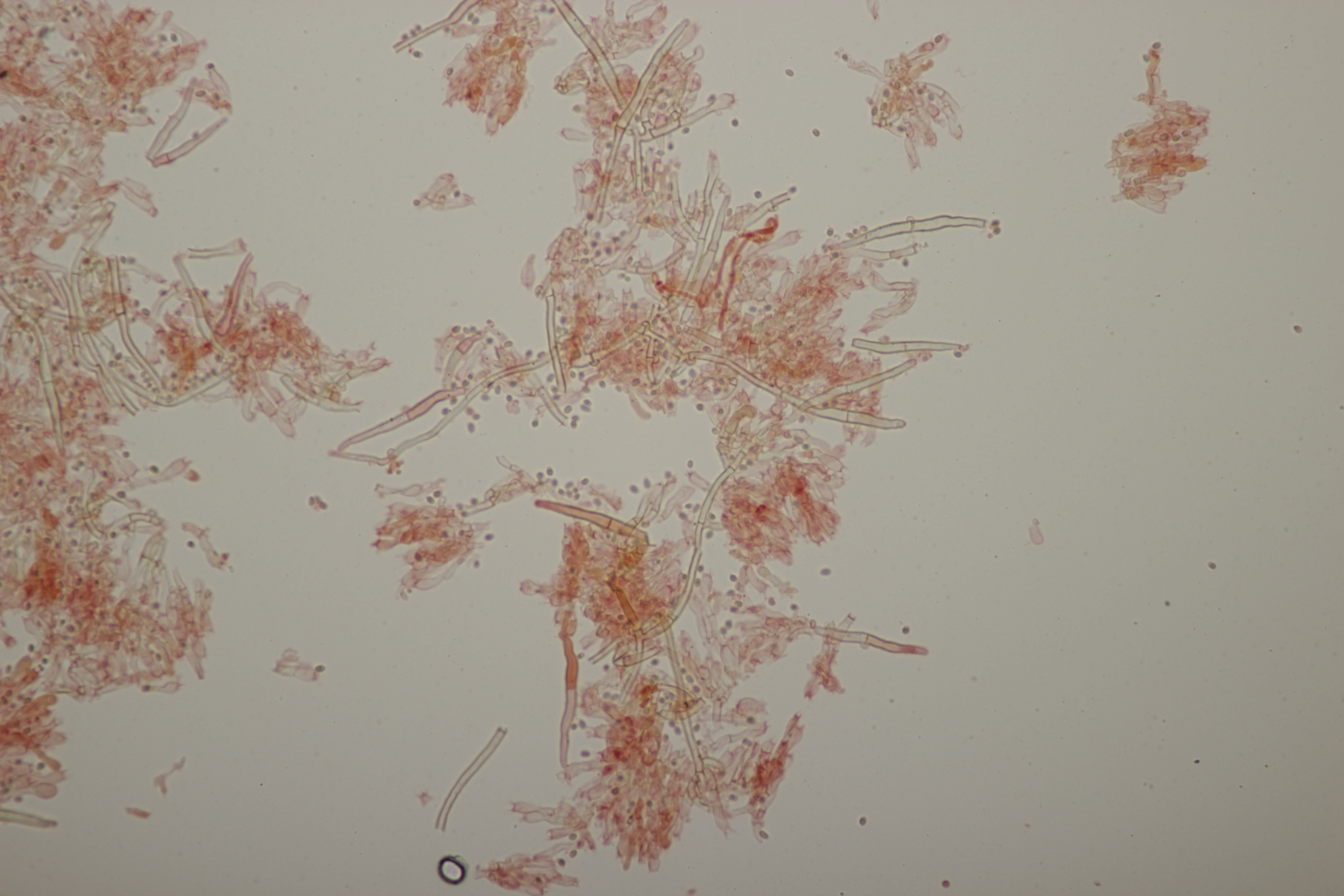 2. An Laubholz, vermutlich Erle fand sich dieser Porling. Schnallen sind vorhanden, Basidien 4-sporig mit Basalschnalle, Zystiden habe ich keine beobachten können. Das Hyphensystem wirkte auf mich monomitisch. Auffallend waren die extrem dicken Wände der generativen Hyphen, die schon fast an Skeletthyphen anderer Porlinge erinnerten. Die Sporen sind auffallend groß (8.7+-0.5) µm x (3.4+-0.2) µm, Q=2.5+-0.2, (7.7-9.7) µm x (3.2-4.1) µm, Q=2.2-2.9. Gibt es da Ideen?
