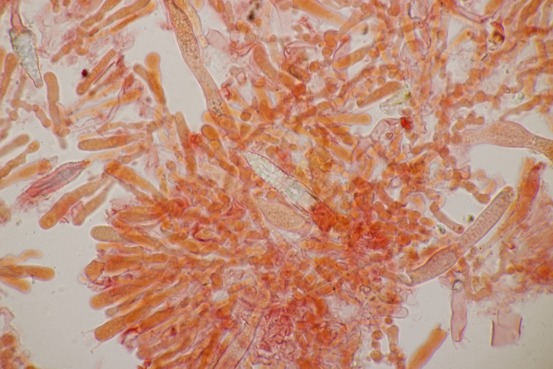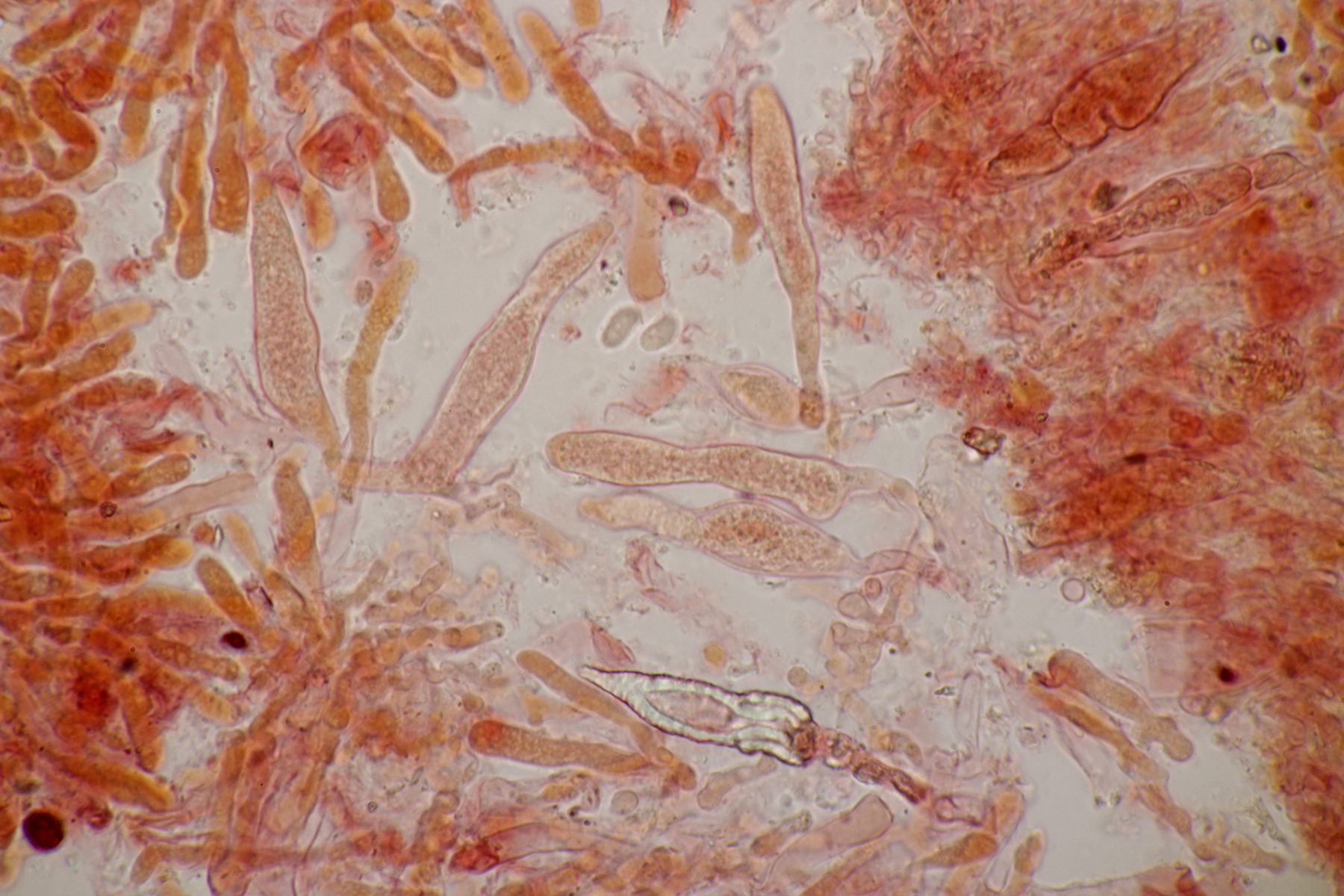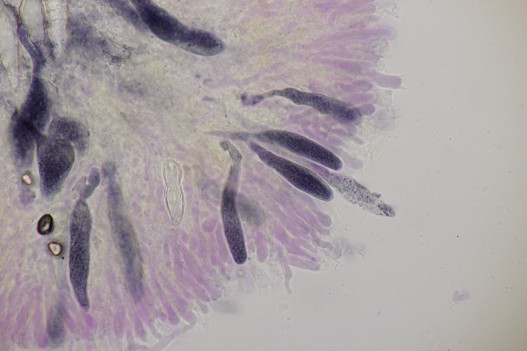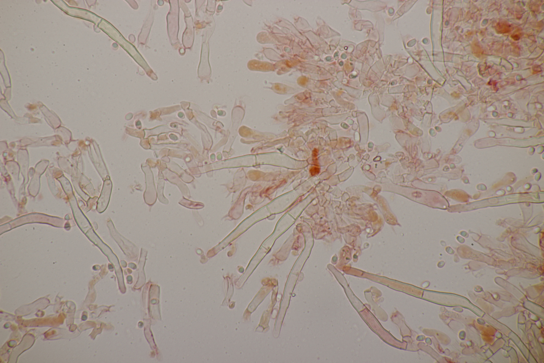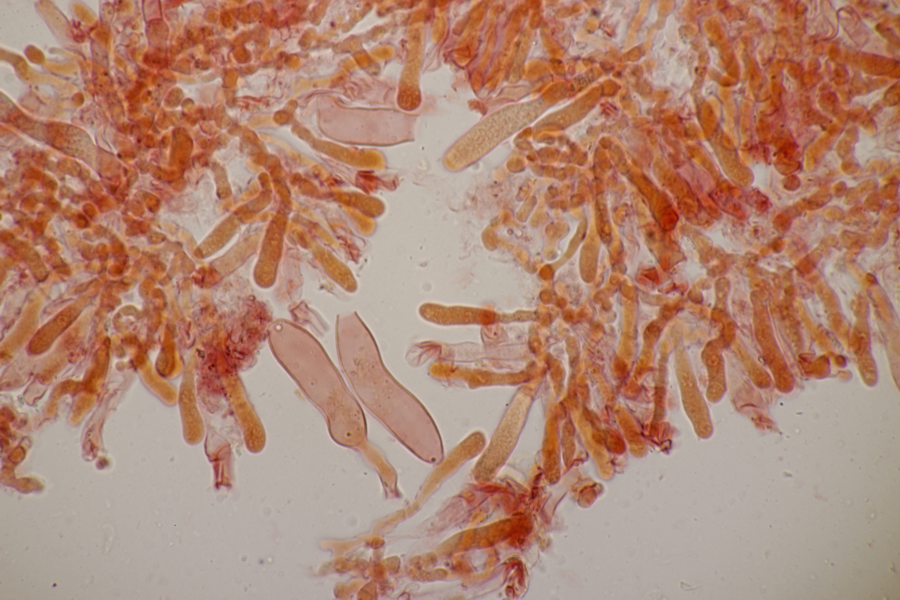 2. An Laubholz, vermutlich Erle fand sich dieser Porling. Schnallen sind vorhanden, Basidien 4-sporig mit Basalschnalle, Zystiden habe ich keine beobachten können. Das Hyphensystem wirkte auf mich monomitisch. Auffallend waren die extrem dicken Wände der generativen Hyphen, die schon fast an Skeletthyphen anderer Porlinge erinnerten. Die Sporen sind auffallend groß (8.7+-0.5) µm x (3.4+-0.2) µm, Q=2.5+-0.2, (7.7-9.7) µm x (3.2-4.1) µm, Q=2.2-2.9. Gibt es da Ideen?