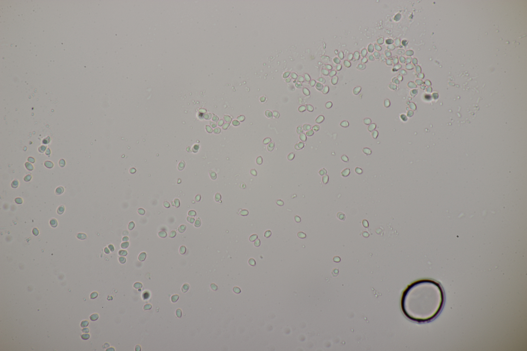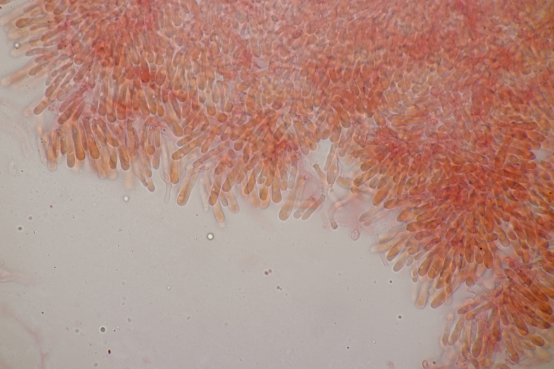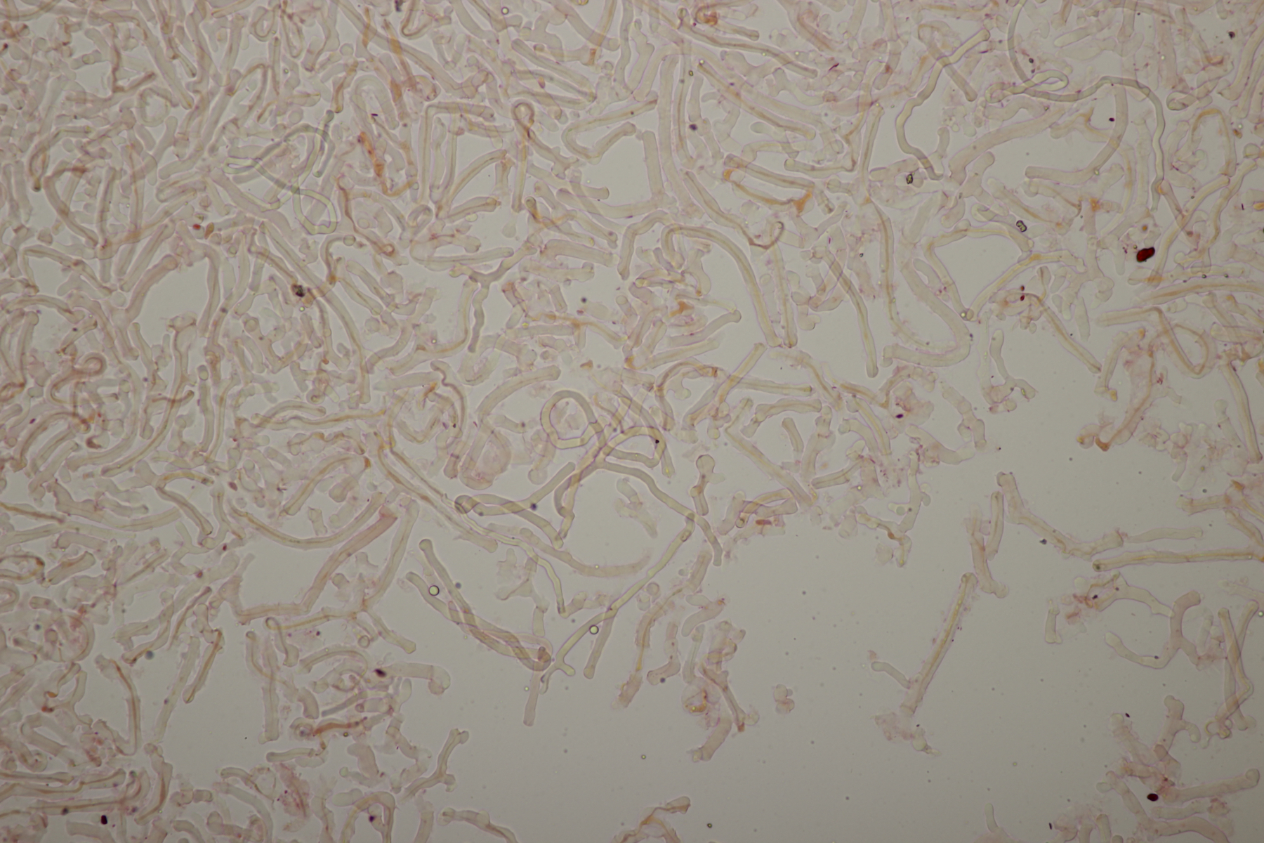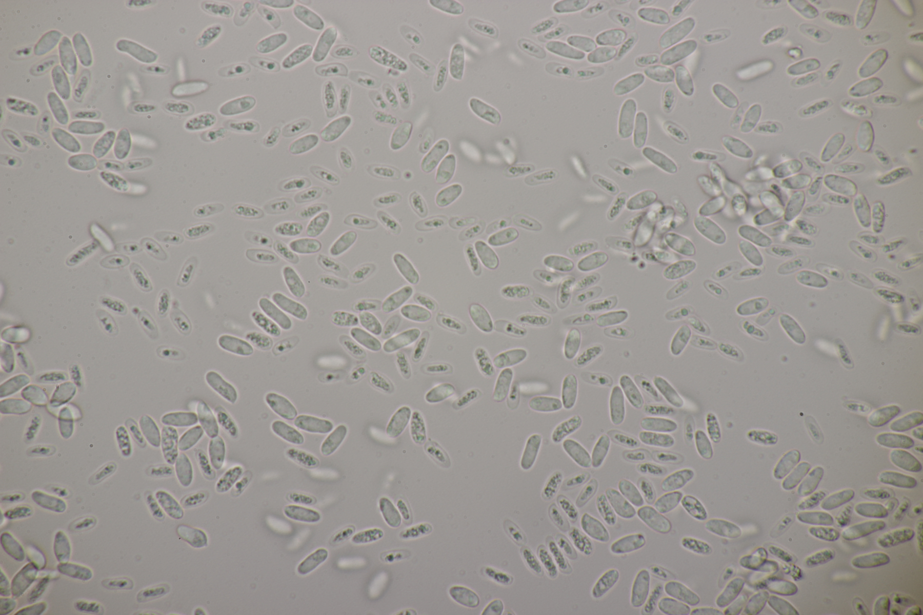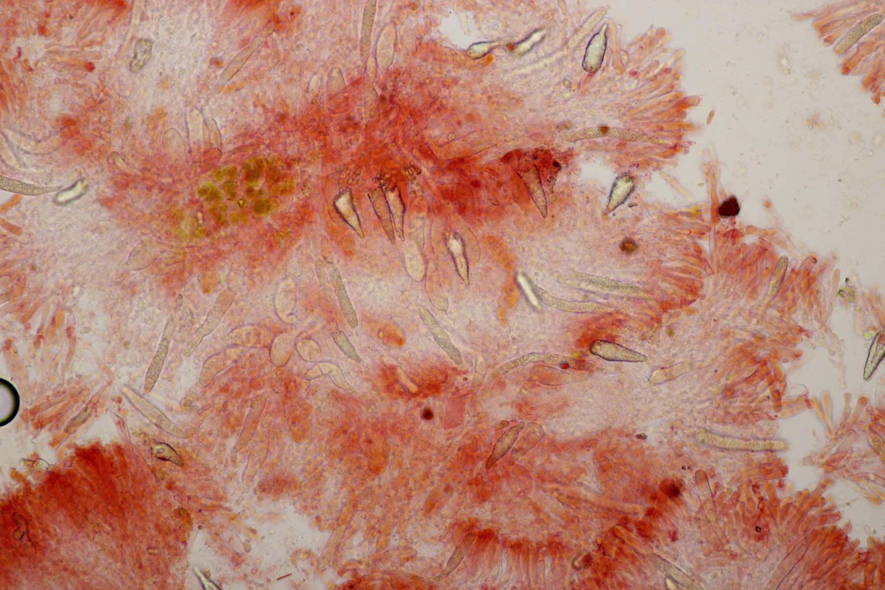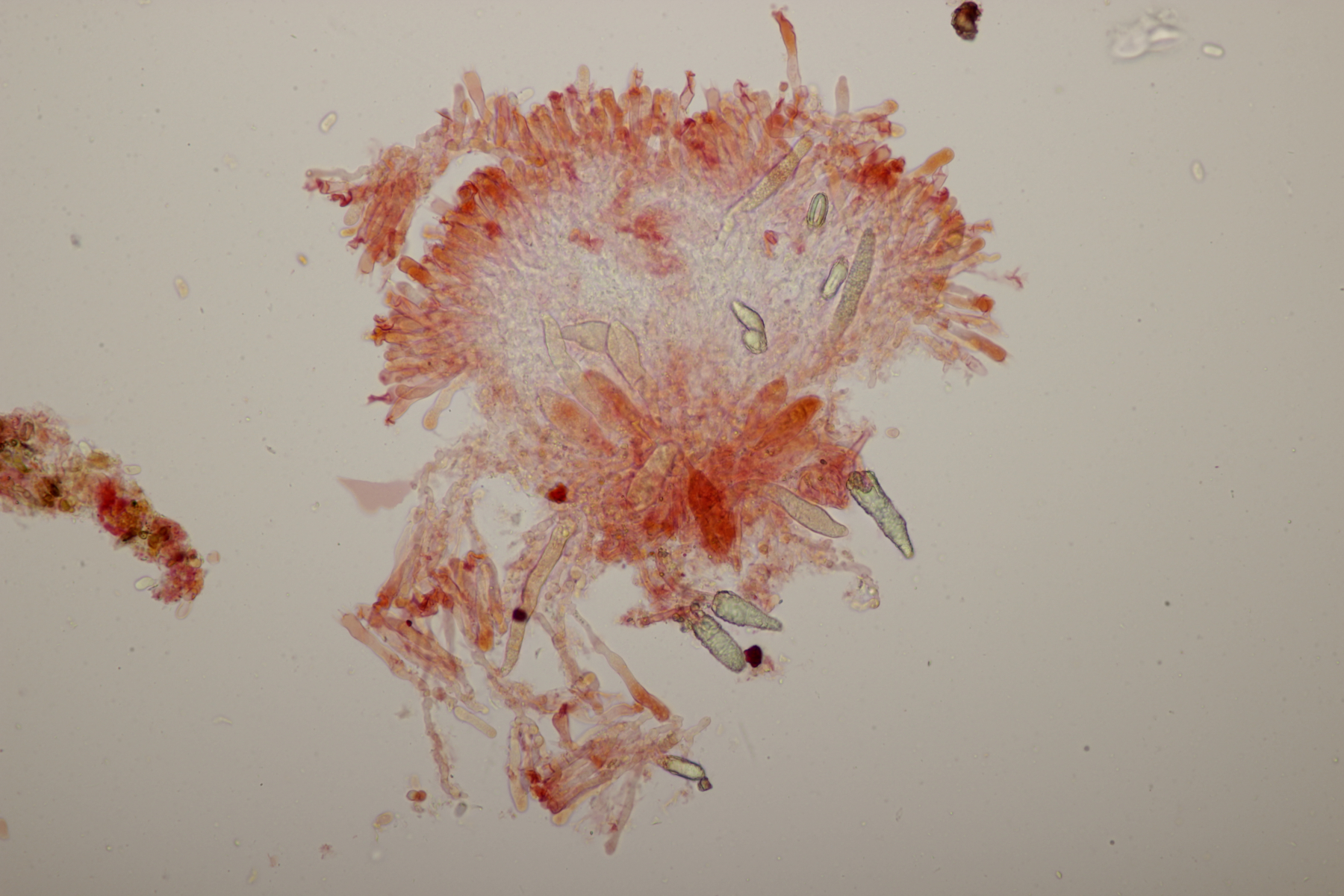 2. An Laubholz, vermutlich Erle fand sich dieser Porling. Schnallen sind vorhanden, Basidien 4-sporig mit Basalschnalle, Zystiden habe ich keine beobachten können. Das Hyphensystem wirkte auf mich monomitisch. Auffallend waren die extrem dicken Wände der generativen Hyphen, die schon fast an Skeletthyphen anderer Porlinge erinnerten. Die Sporen sind auffallend groß (8.7+-0.5) µm x (3.4+-0.2) µm, Q=2.5+-0.2, (7.7-9.7) µm x (3.2-4.1) µm, Q=2.2-2.9. Gibt es da Ideen?