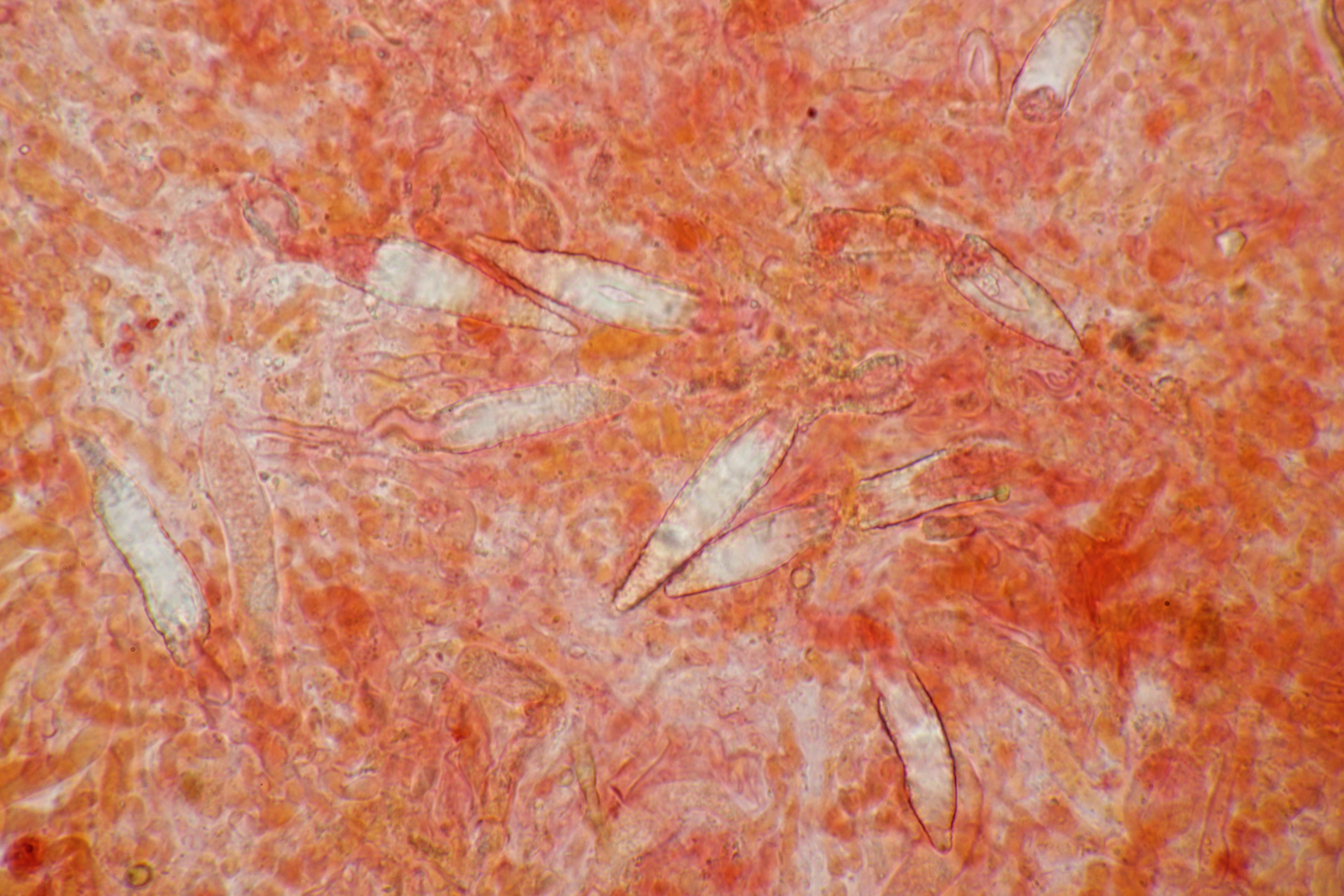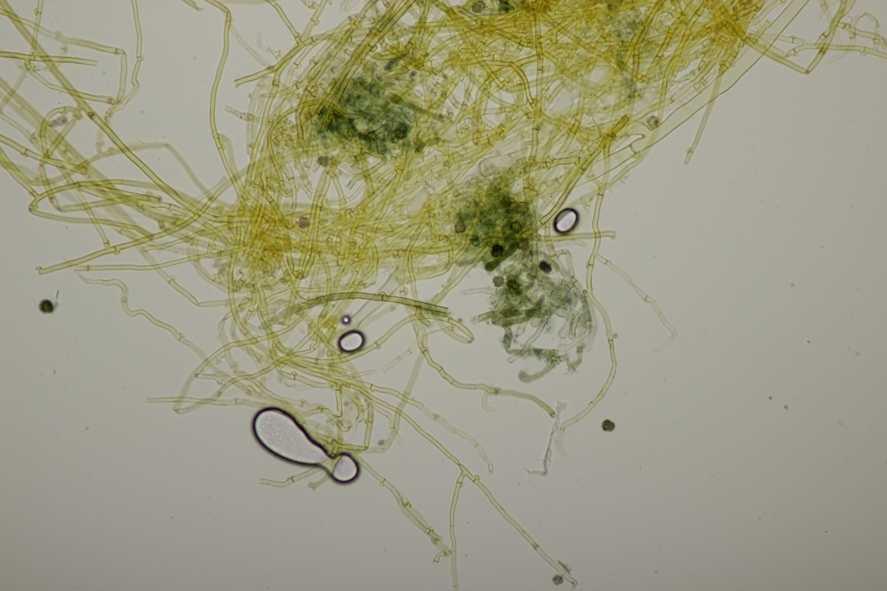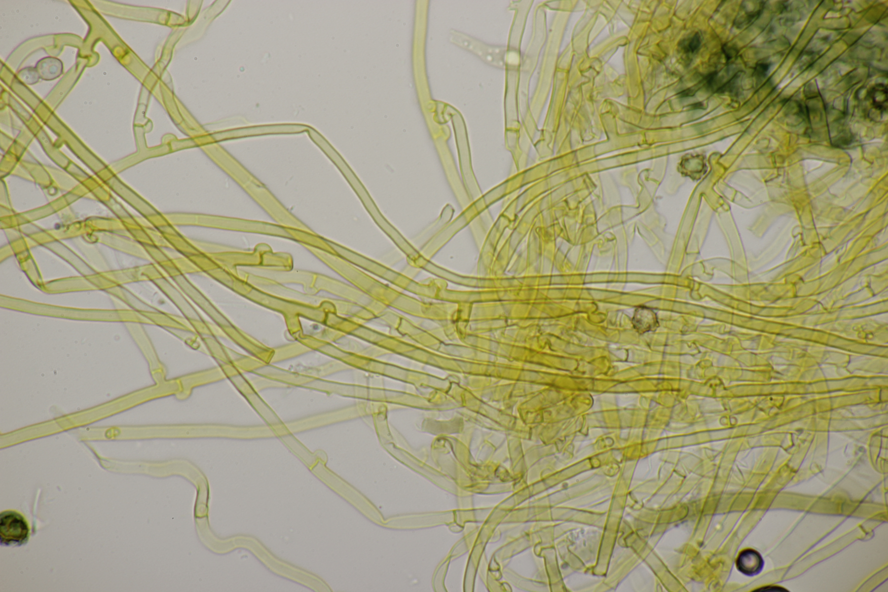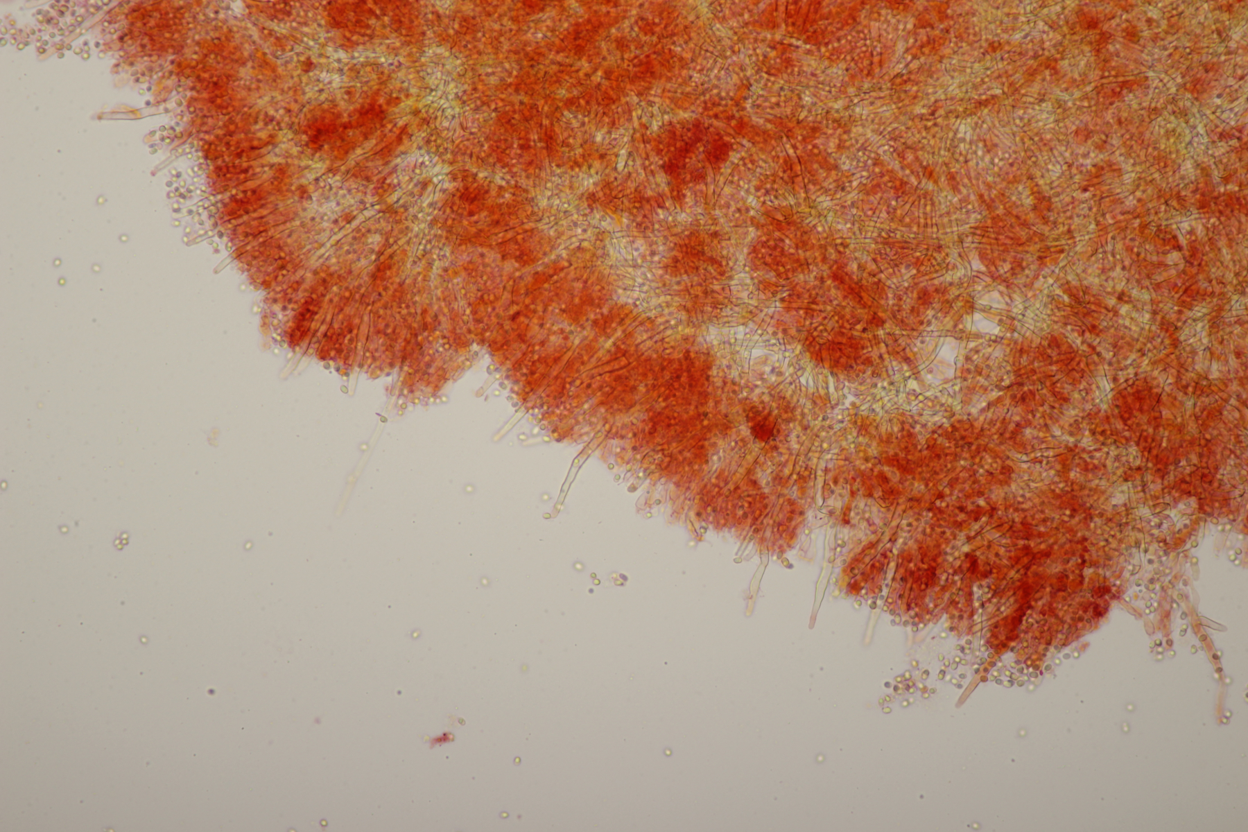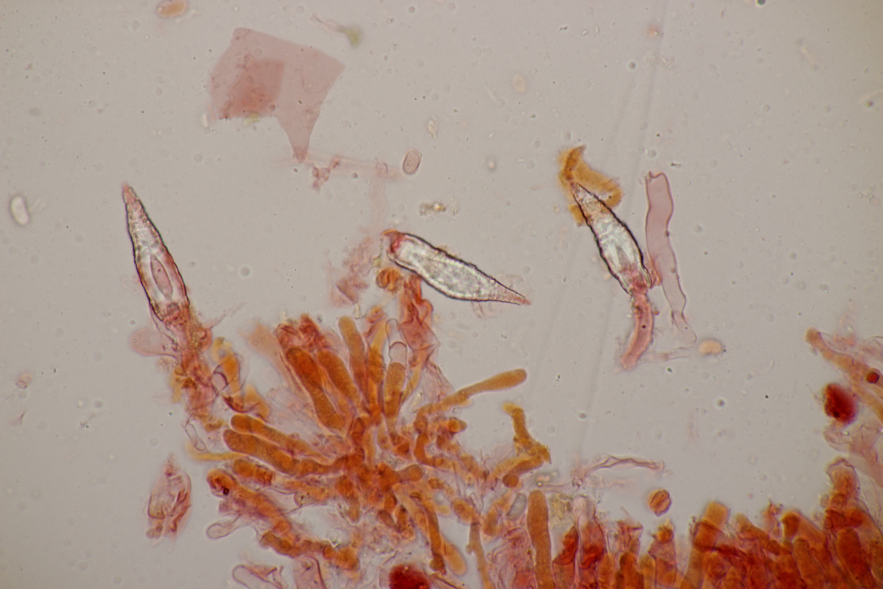 2. An Laubholz, vermutlich Erle fand sich dieser Porling. Schnallen sind vorhanden, Basidien 4-sporig mit Basalschnalle, Zystiden habe ich keine beobachten können. Das Hyphensystem wirkte auf mich monomitisch. Auffallend waren die extrem dicken Wände der generativen Hyphen, die schon fast an Skeletthyphen anderer Porlinge erinnerten. Die Sporen sind auffallend groß (8.7+-0.5) µm x (3.4+-0.2) µm, Q=2.5+-0.2, (7.7-9.7) µm x (3.2-4.1) µm, Q=2.2-2.9. Gibt es da Ideen?