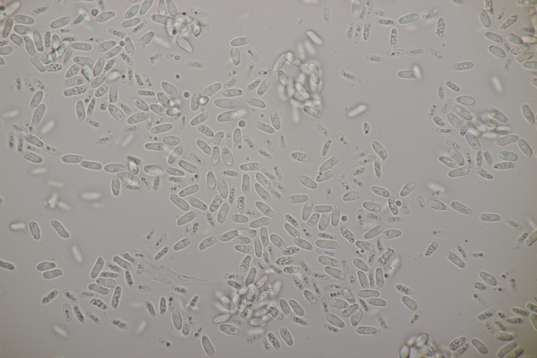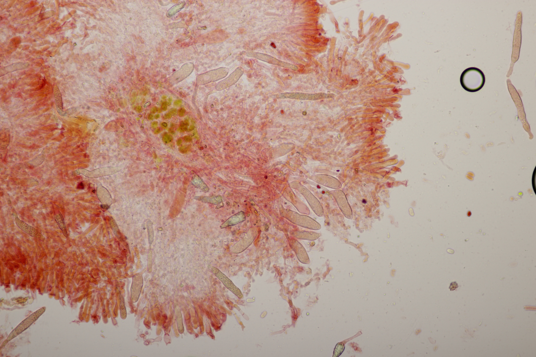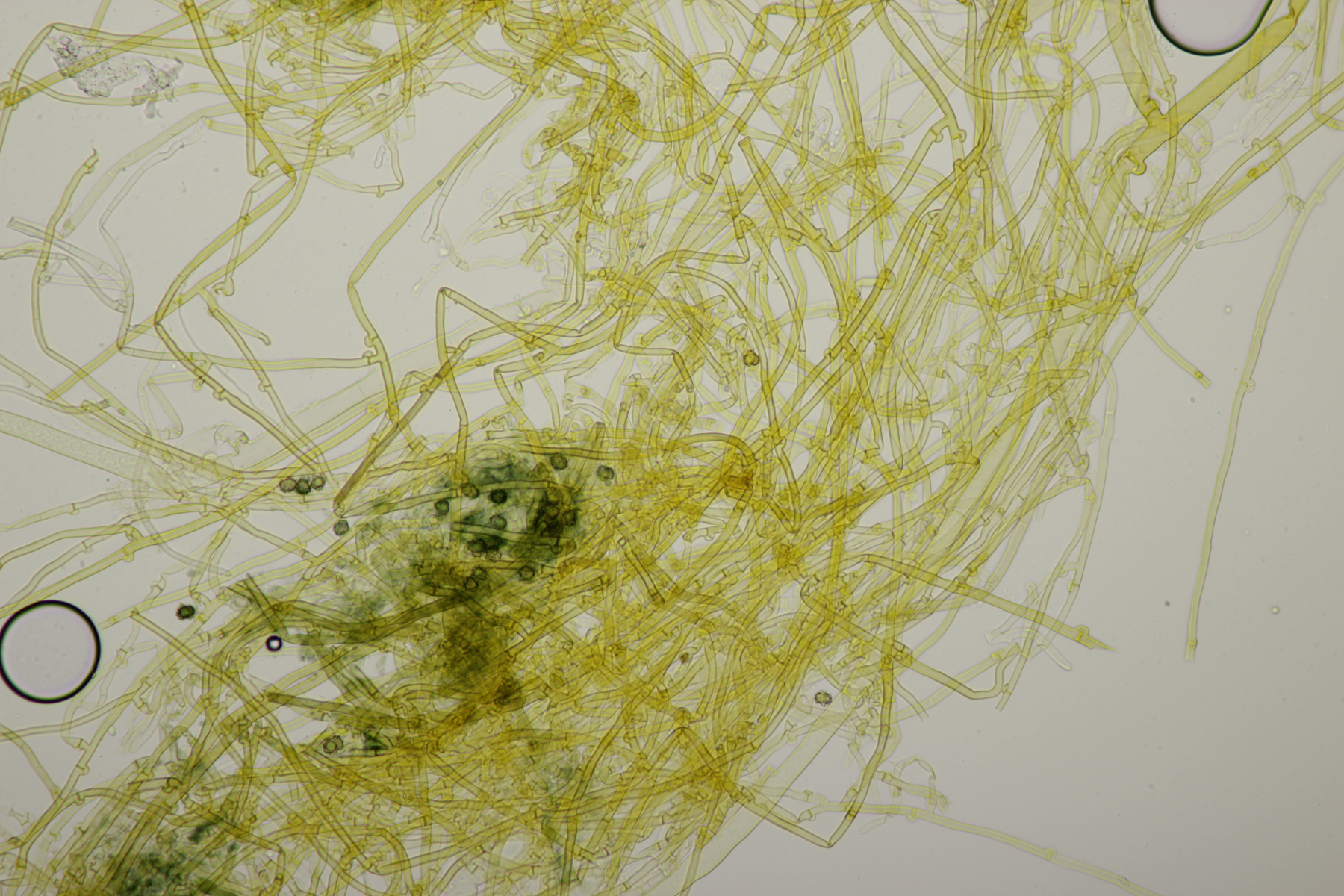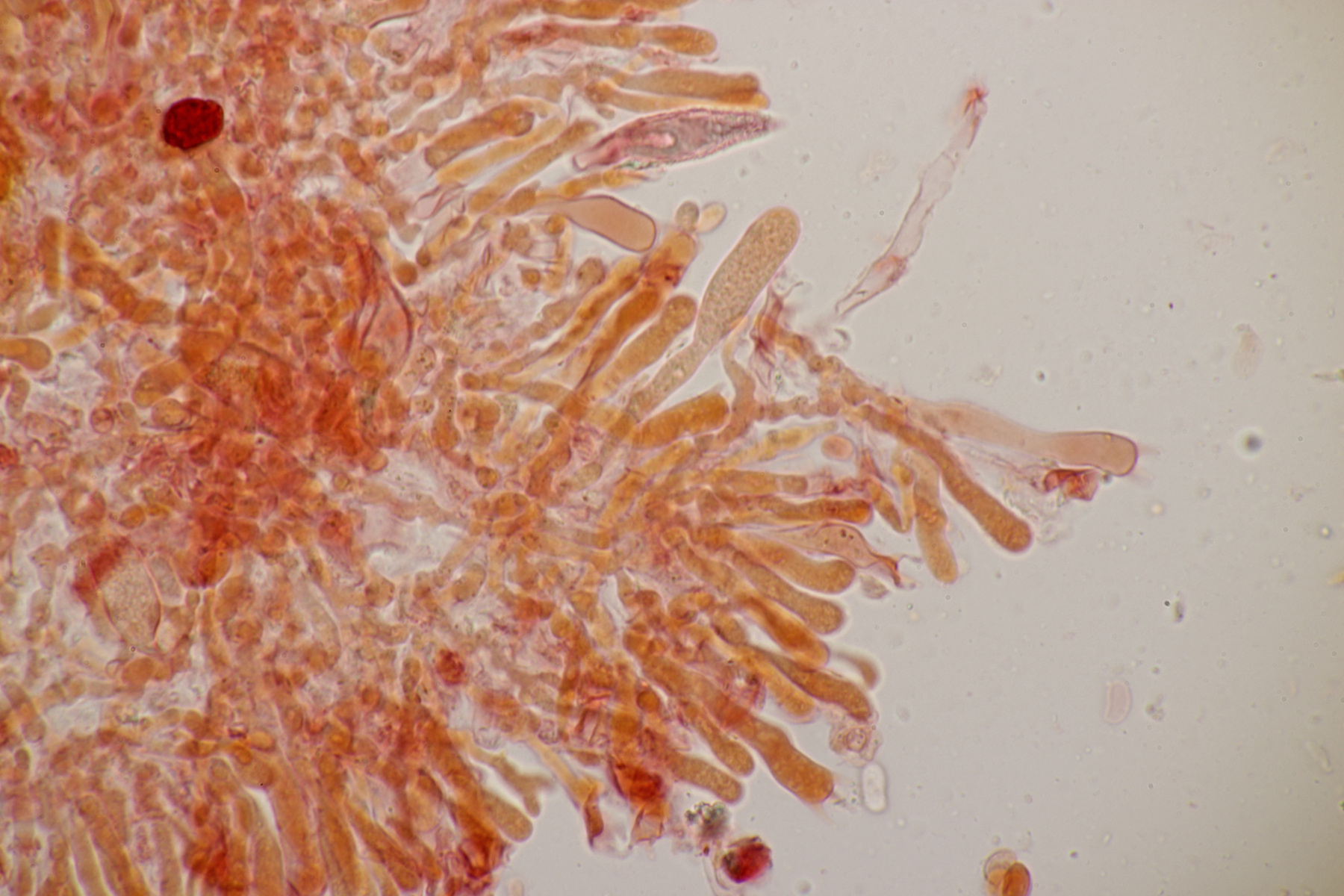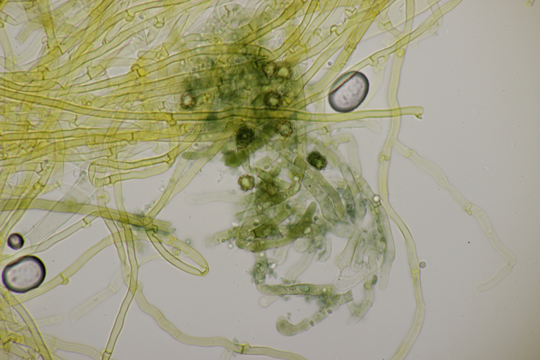 2. An Laubholz, vermutlich Erle fand sich dieser Porling. Schnallen sind vorhanden, Basidien 4-sporig mit Basalschnalle, Zystiden habe ich keine beobachten können. Das Hyphensystem wirkte auf mich monomitisch. Auffallend waren die extrem dicken Wände der generativen Hyphen, die schon fast an Skeletthyphen anderer Porlinge erinnerten. Die Sporen sind auffallend groß (8.7+-0.5) µm x (3.4+-0.2) µm, Q=2.5+-0.2, (7.7-9.7) µm x (3.2-4.1) µm, Q=2.2-2.9. Gibt es da Ideen?