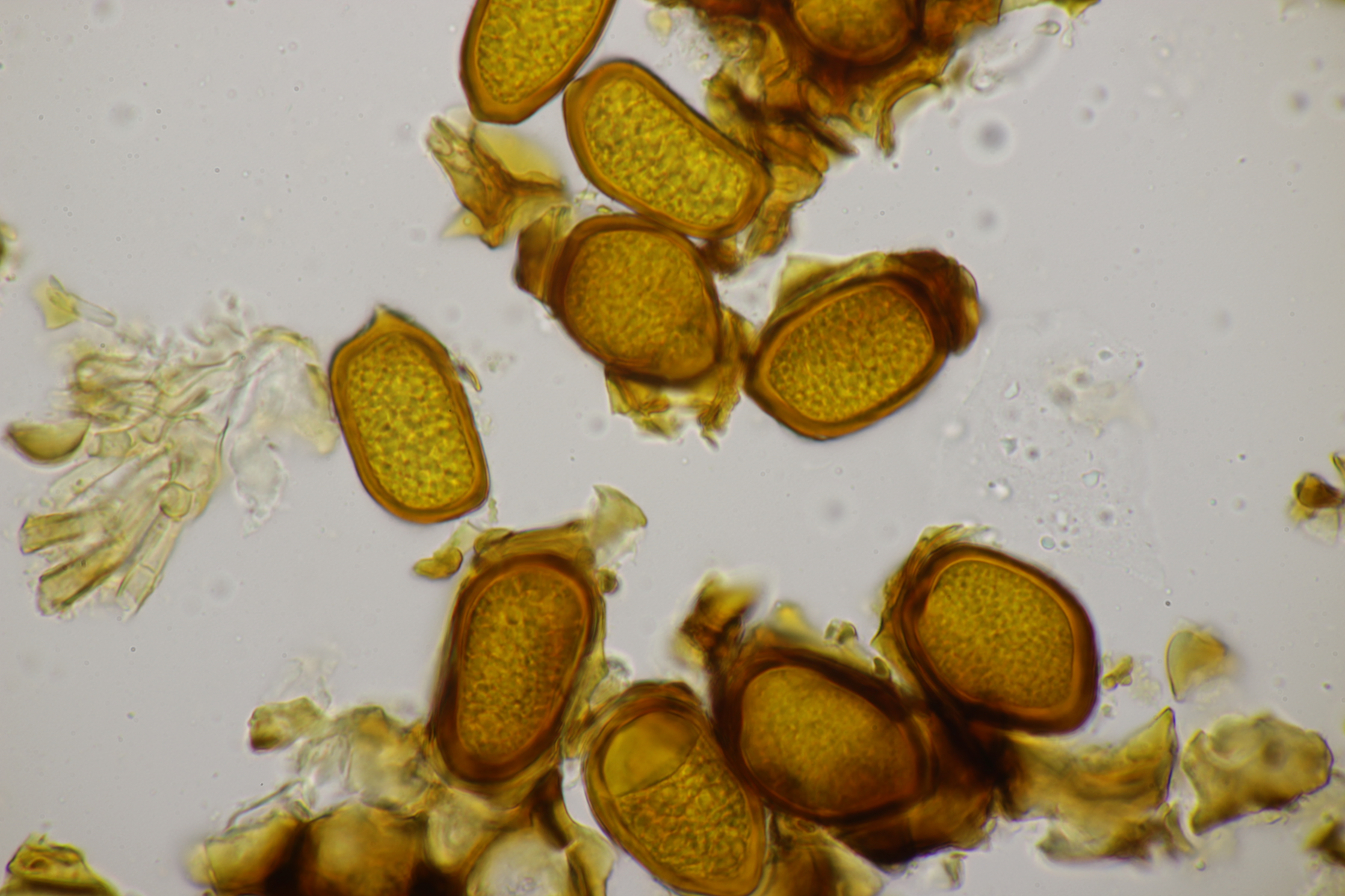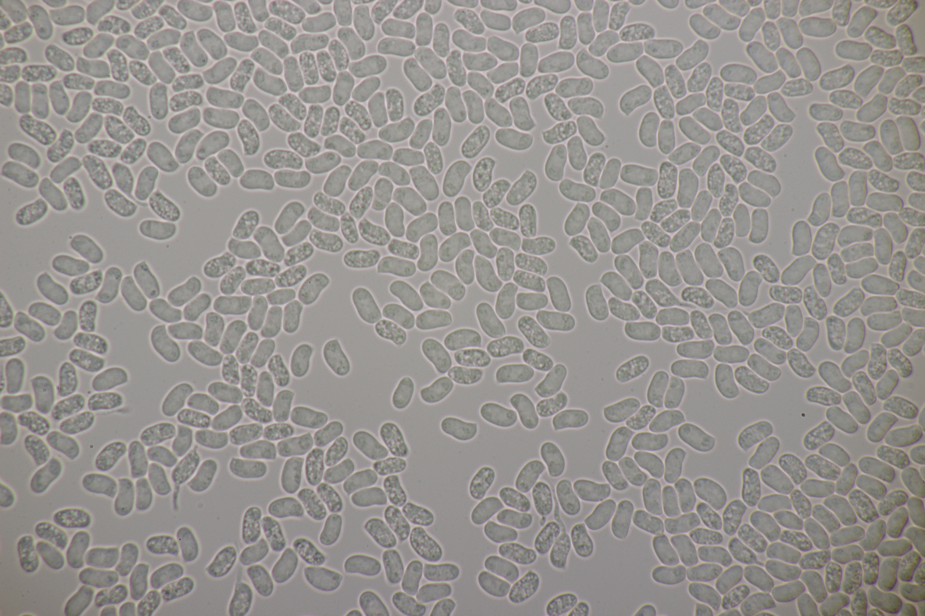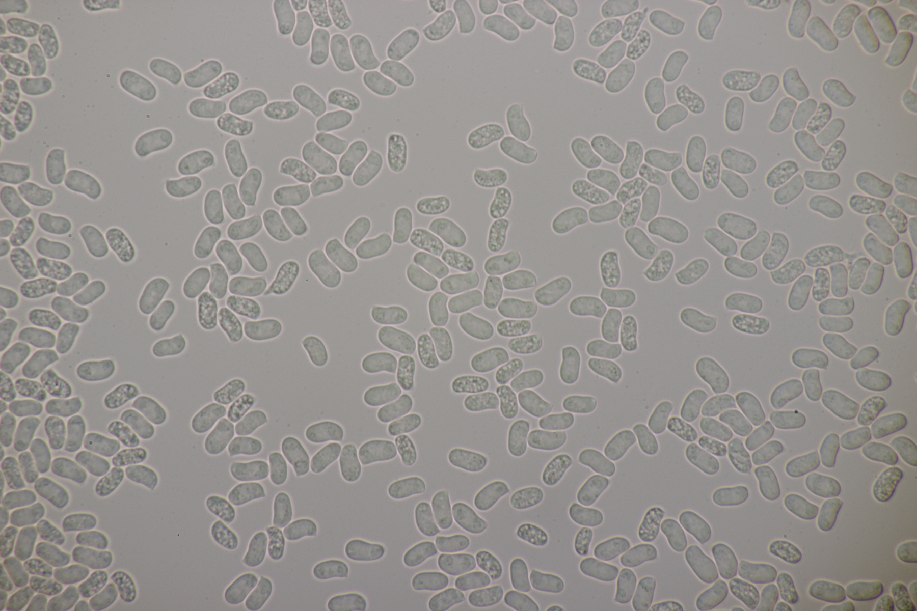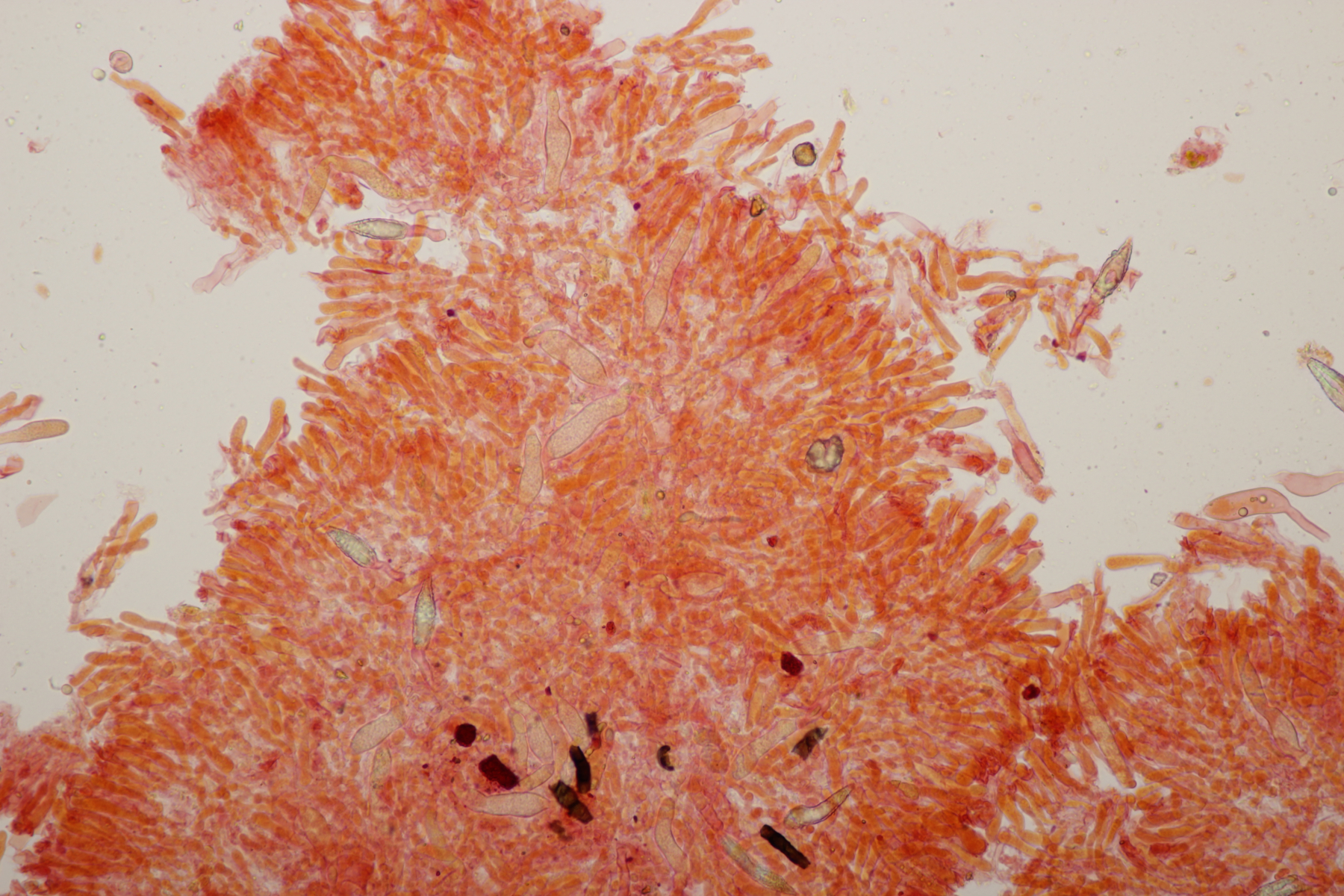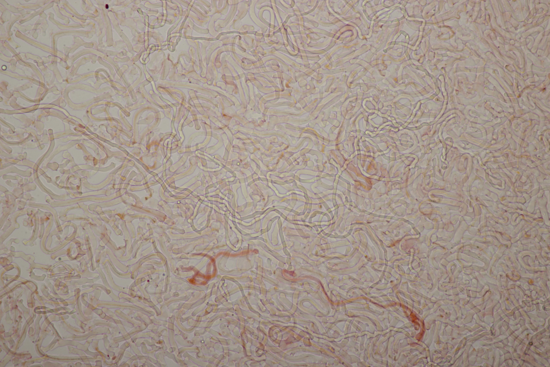 2. An Laubholz, vermutlich Erle fand sich dieser Porling. Schnallen sind vorhanden, Basidien 4-sporig mit Basalschnalle, Zystiden habe ich keine beobachten können. Das Hyphensystem wirkte auf mich monomitisch. Auffallend waren die extrem dicken Wände der generativen Hyphen, die schon fast an Skeletthyphen anderer Porlinge erinnerten. Die Sporen sind auffallend groß (8.7+-0.5) µm x (3.4+-0.2) µm, Q=2.5+-0.2, (7.7-9.7) µm x (3.2-4.1) µm, Q=2.2-2.9. Gibt es da Ideen?