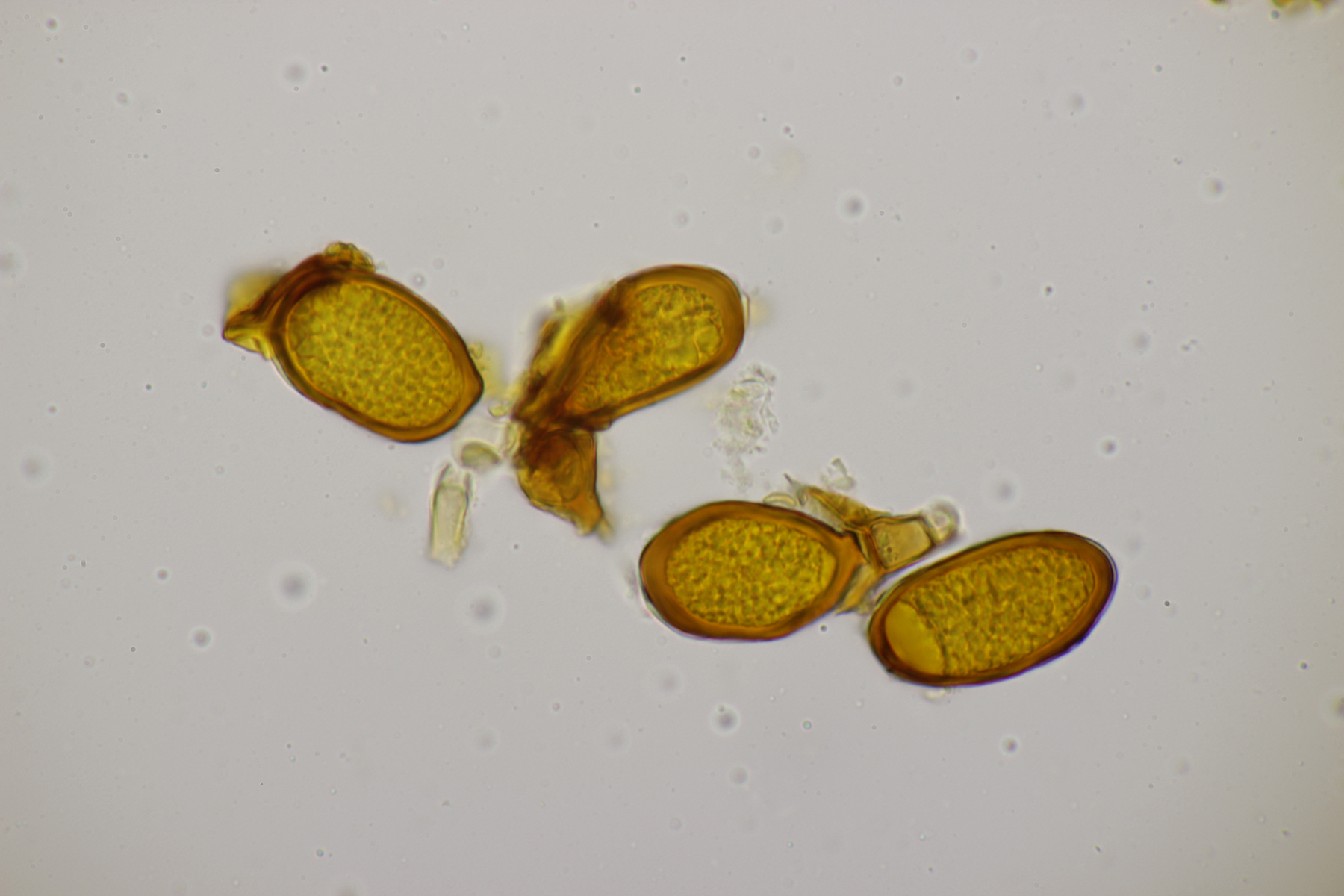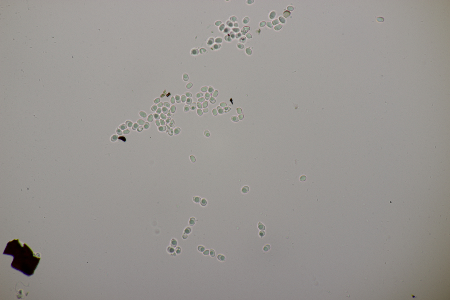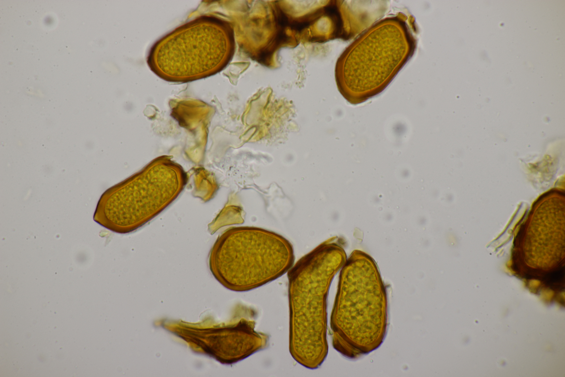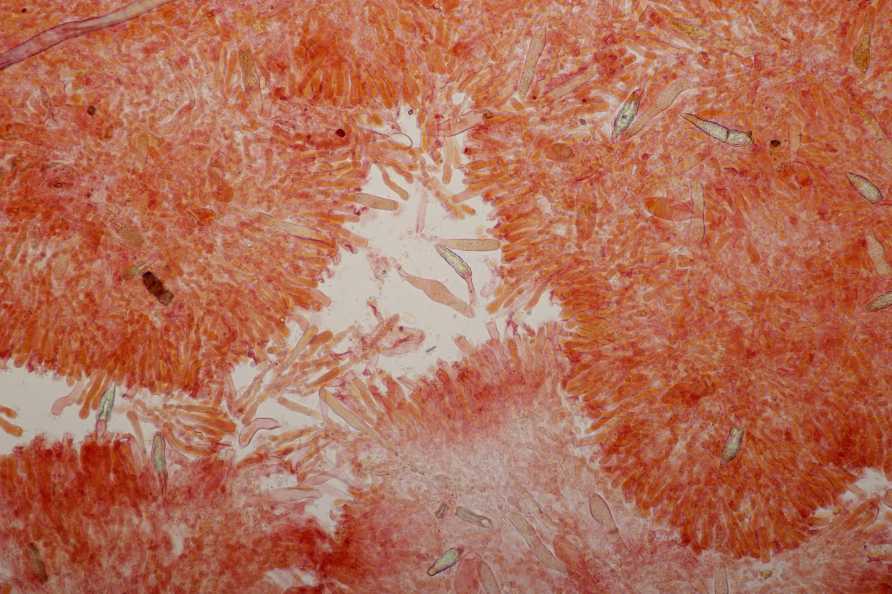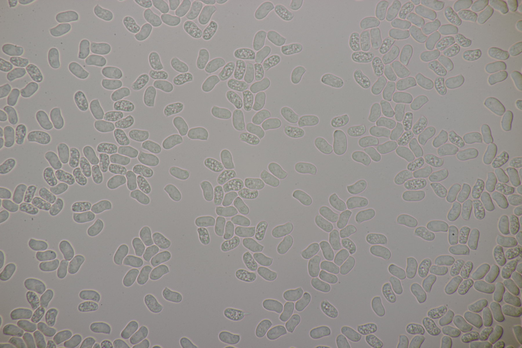 2. An Laubholz, vermutlich Erle fand sich dieser Porling. Schnallen sind vorhanden, Basidien 4-sporig mit Basalschnalle, Zystiden habe ich keine beobachten können. Das Hyphensystem wirkte auf mich monomitisch. Auffallend waren die extrem dicken Wände der generativen Hyphen, die schon fast an Skeletthyphen anderer Porlinge erinnerten. Die Sporen sind auffallend groß (8.7+-0.5) µm x (3.4+-0.2) µm, Q=2.5+-0.2, (7.7-9.7) µm x (3.2-4.1) µm, Q=2.2-2.9. Gibt es da Ideen?