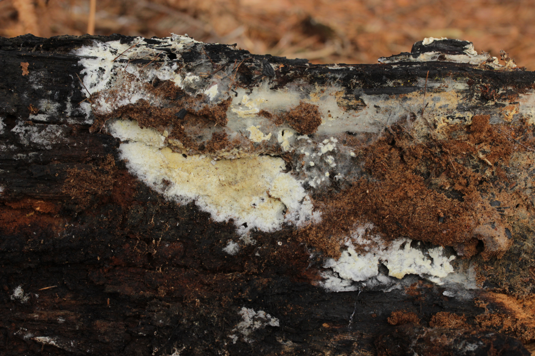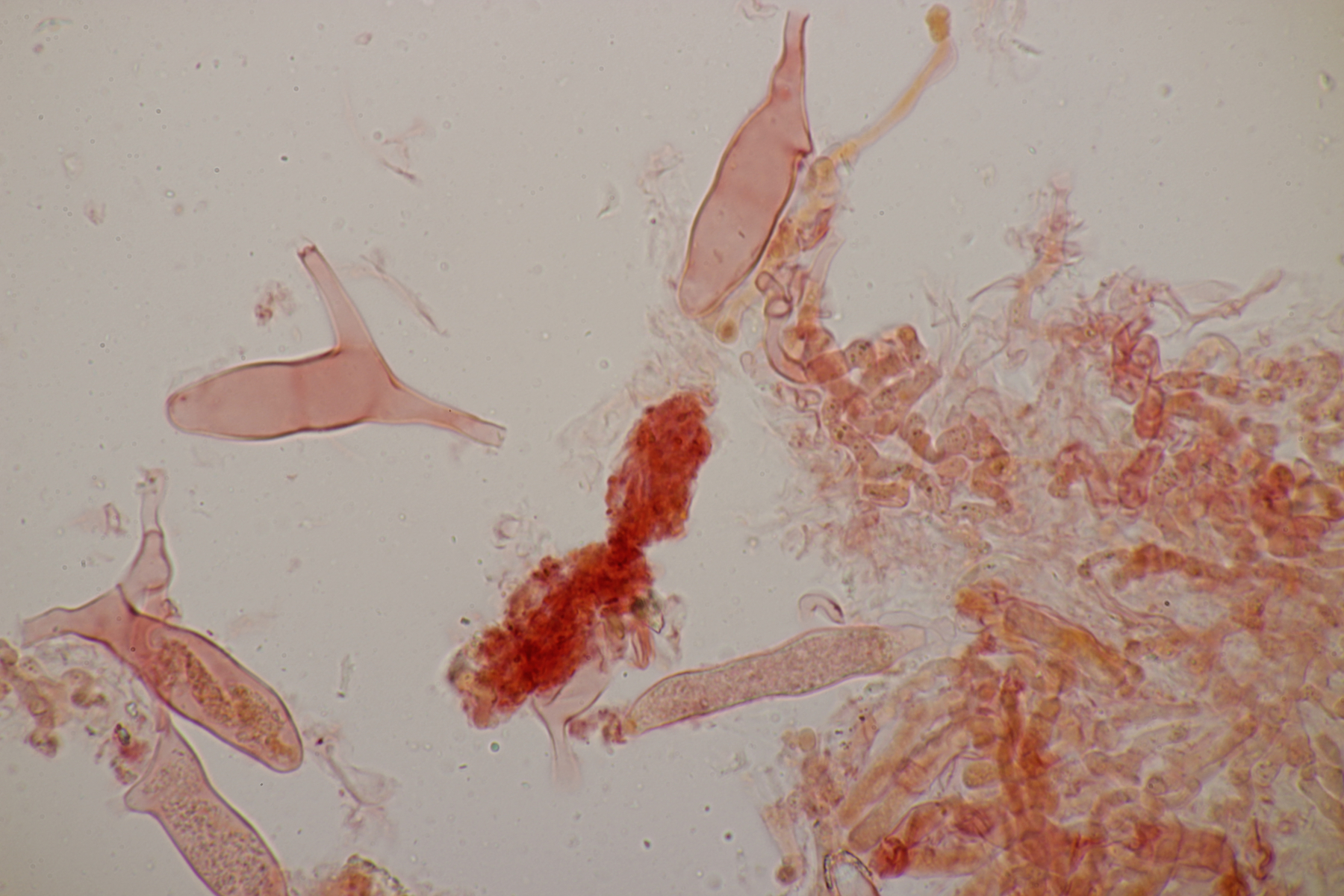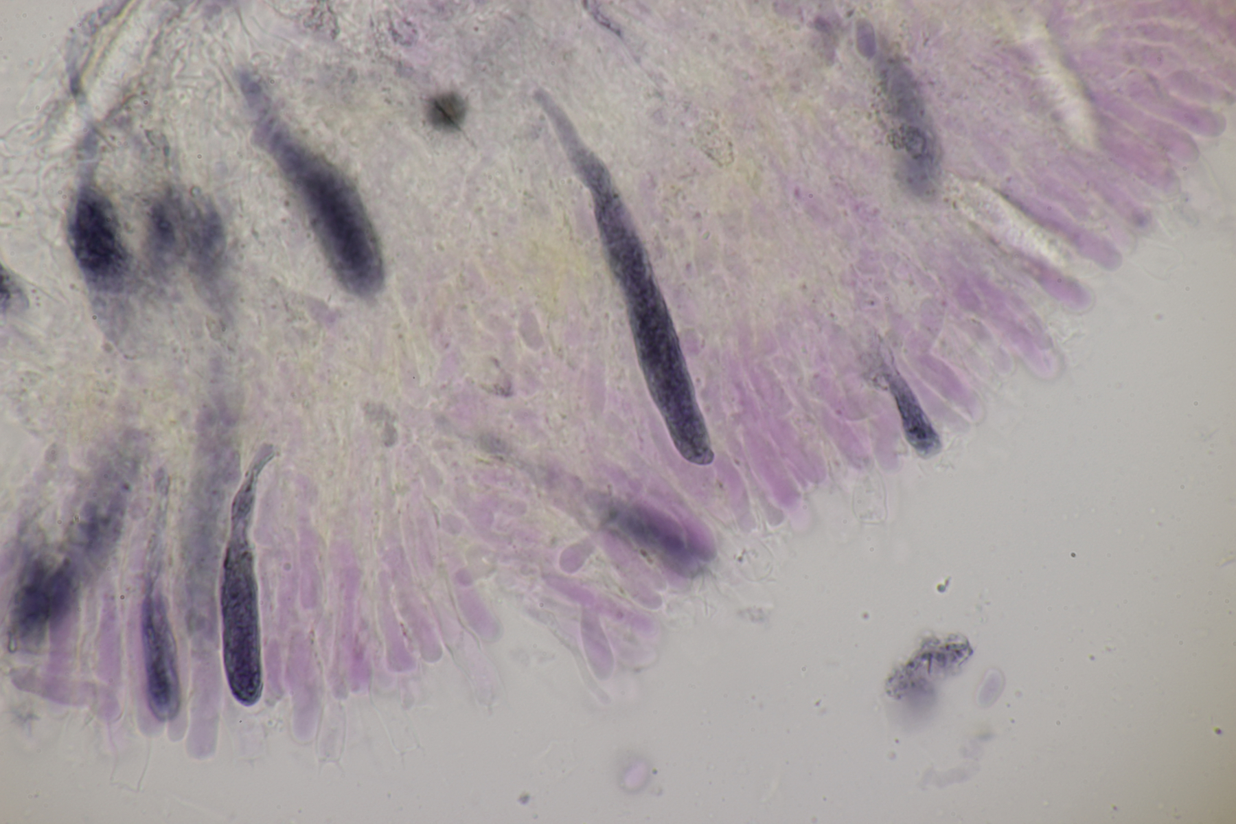 5. Ein Rindenpilz aus der Hildener Heide auf verkohltem Kiefernstamm. Auffällig sind die septierten, dickwandigen Zystiden. Ansonsten gibt es Schnallen, 4-sporige Basidien mit Basalschnalle und Sporen von (3.7+-0.2) µm x (2.6+-0.2) µm, Q=1.4+-0.1, (3.2-4.1) µm x (2.2-2.9) µm, Q=1.3-1.7. Eigentlich hatte ich gedacht, daß man mit den septierten Zystiden schnell ans Ziel gelangt, aber irgendwie finde ich da so gar nichts Passendes.