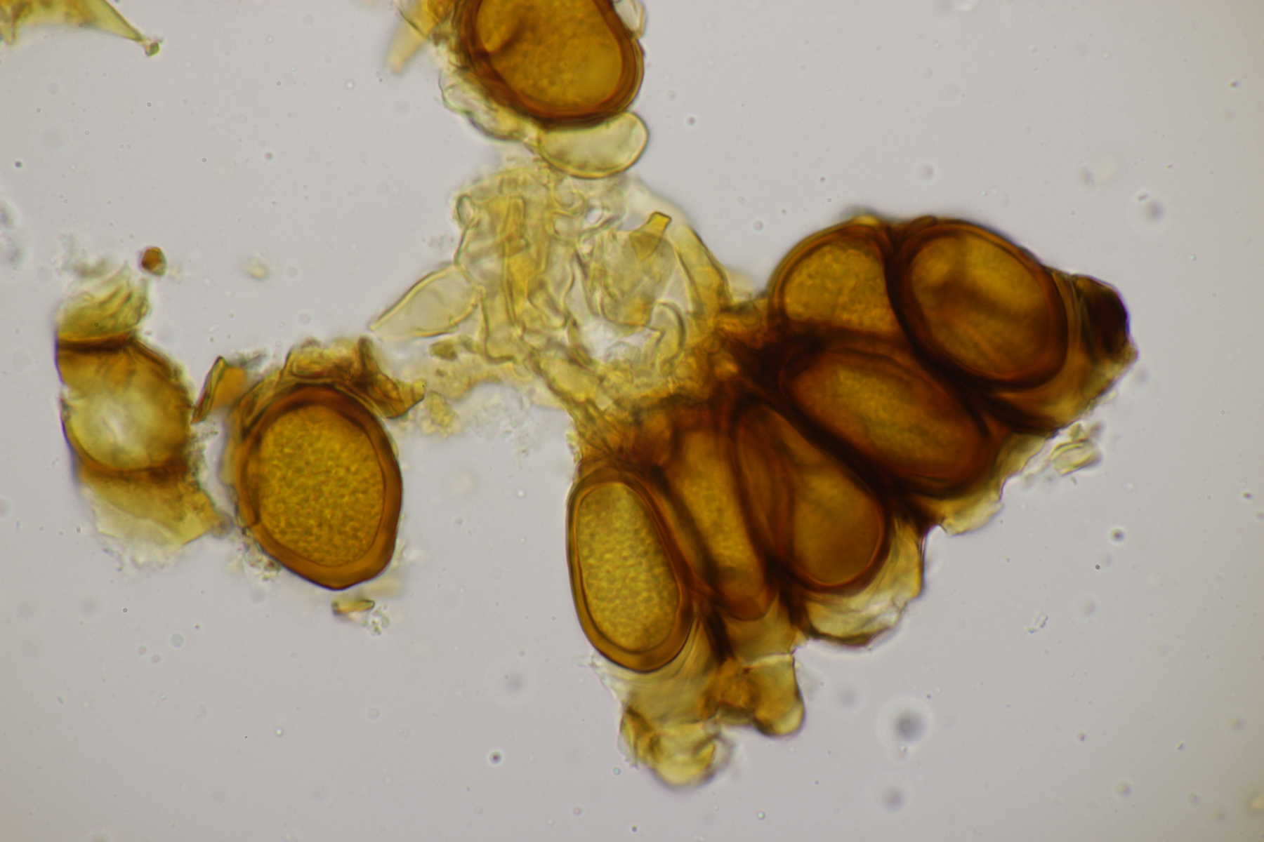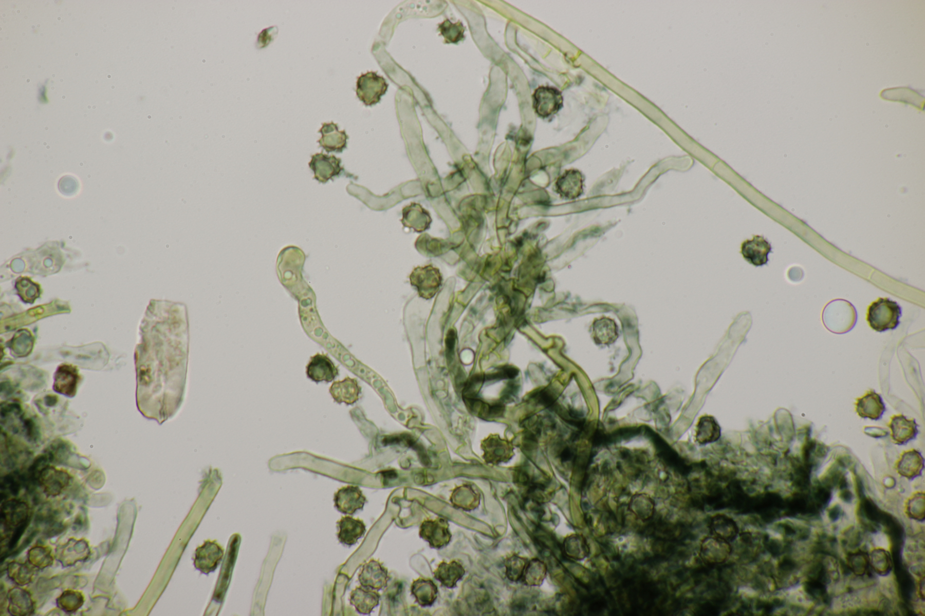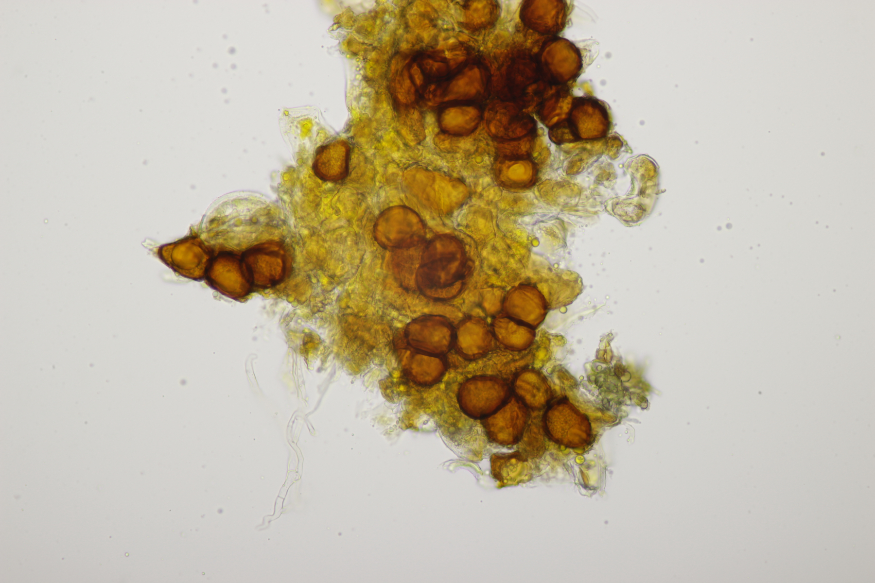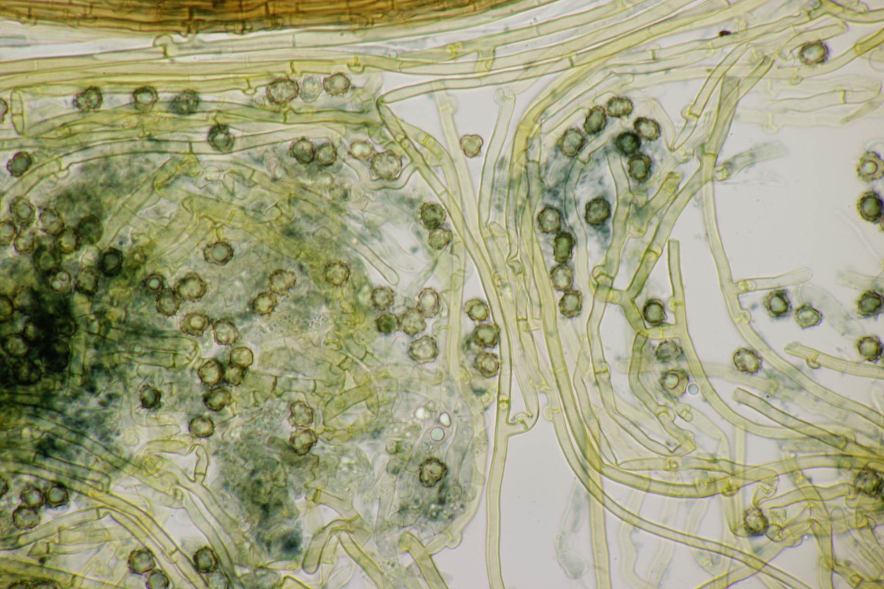 4. In der Hildener Heide dann eine Tomentella. Was man auf den Fotos hier leider nicht so gut sieht, sind Bereiche des Fruchtkörpers, die offenbar mit viel Hymenophor ausgestattet waren und schwärzlich waren. Mikroskopisch gibt es Schnallen, keine Zystiden und eine stark cyanophile Reaktion des Hymeniums. Rhizomorphen sind auch vorhanden. Die Sporen messen (7.2+-0.5) µm x (6.1+-0.6) µm, Q=1.2+-0.1, (6.4-8.0) µm x (5.1-7.2) µm, Q=1.0-1.4. Da kommen offenbar nur T. botryoides und T. ferruginea in Frage. Die Sporengröße liegt irgendwie so mittig zwischen den beiden Arten. Wegen des dunklen Hymenophors tendiere ich zu T. botryoides. Was meint Tomentella?