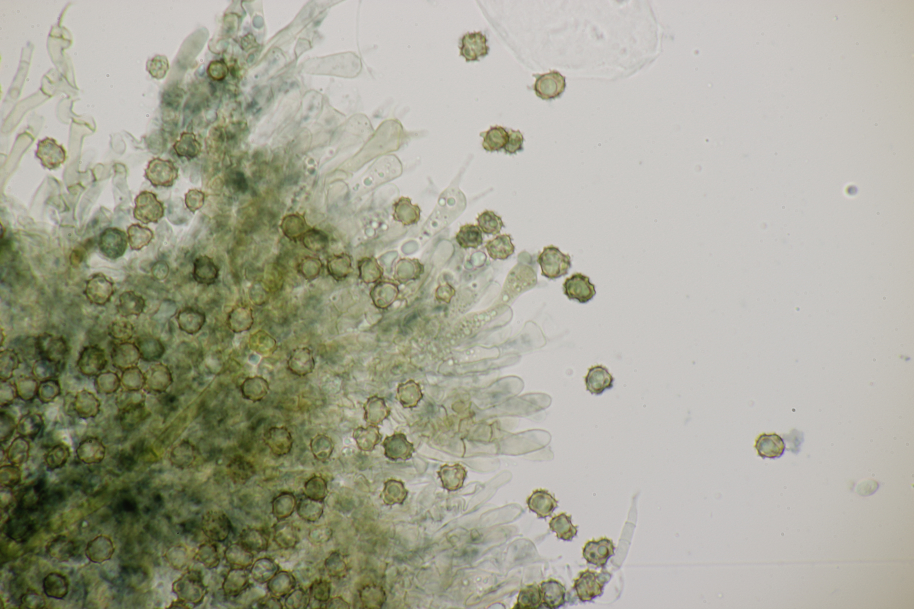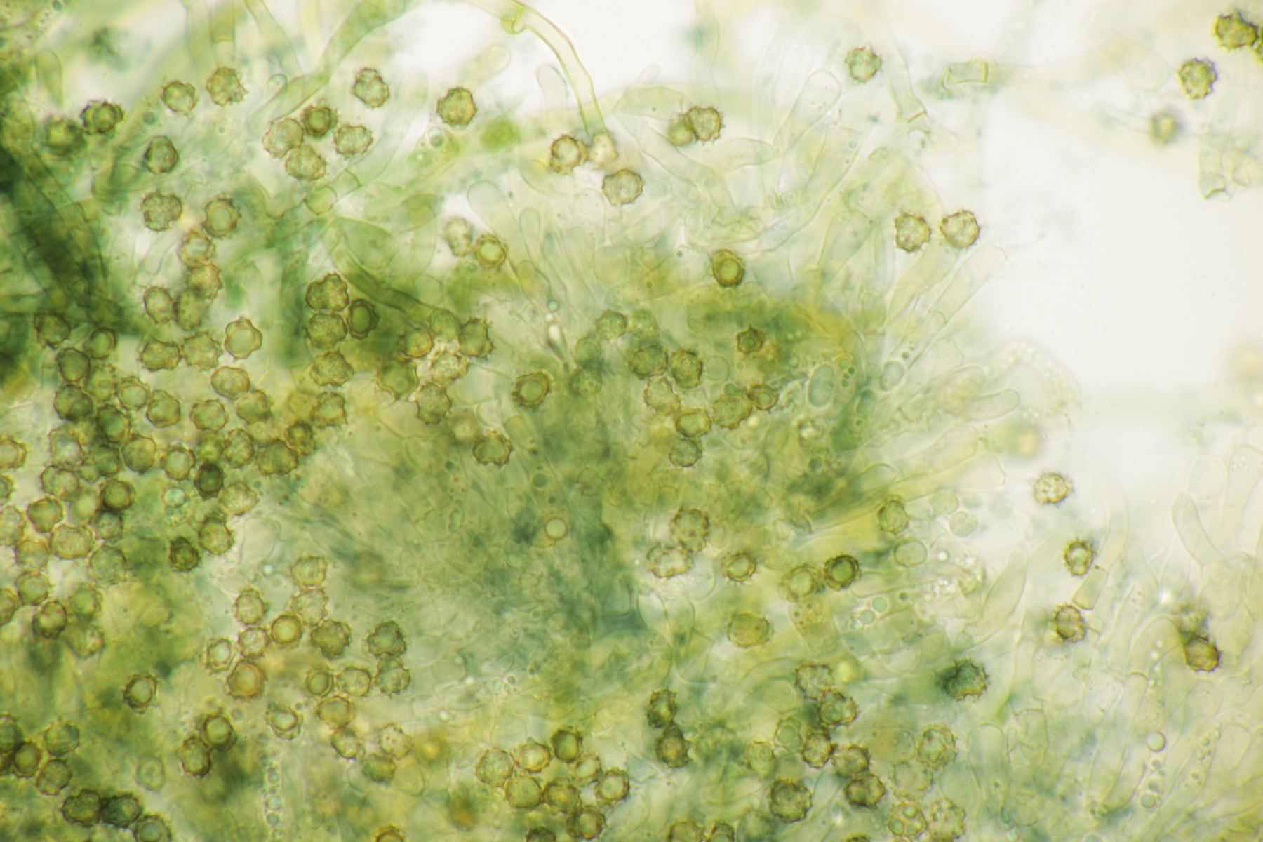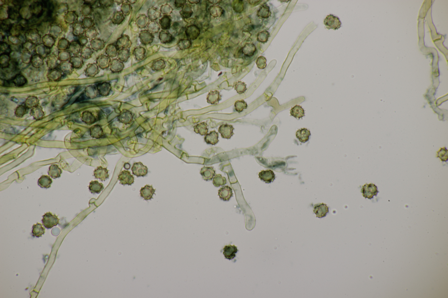 4. In der Hildener Heide dann eine Tomentella. Was man auf den Fotos hier leider nicht so gut sieht, sind Bereiche des Fruchtkörpers, die offenbar mit viel Hymenophor ausgestattet waren und schwärzlich waren. Mikroskopisch gibt es Schnallen, keine Zystiden und eine stark cyanophile Reaktion des Hymeniums. Rhizomorphen sind auch vorhanden. Die Sporen messen (7.2+-0.5) µm x (6.1+-0.6) µm, Q=1.2+-0.1, (6.4-8.0) µm x (5.1-7.2) µm, Q=1.0-1.4. Da kommen offenbar nur T. botryoides und T. ferruginea in Frage. Die Sporengröße liegt irgendwie so mittig zwischen den beiden Arten. Wegen des dunklen Hymenophors tendiere ich zu T. botryoides. Was meint Tomentella?