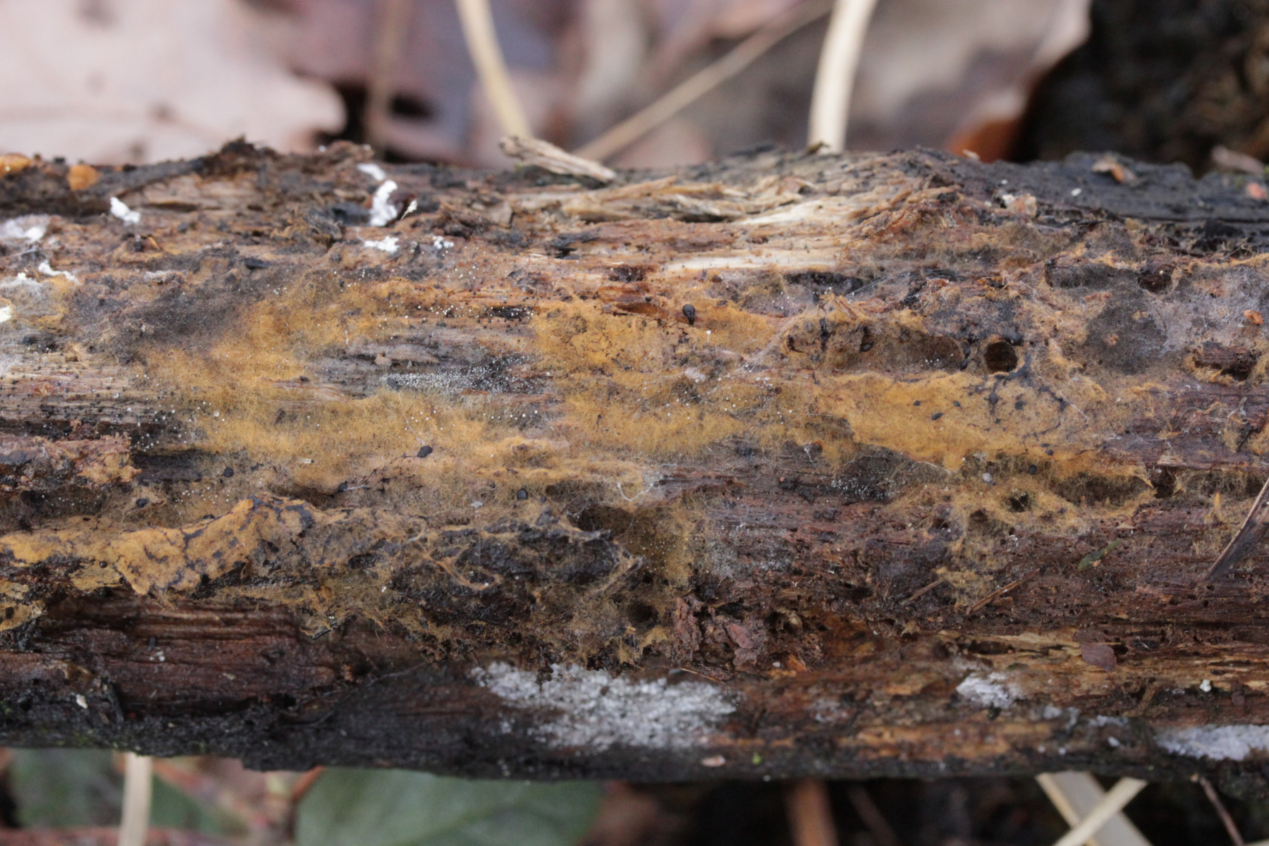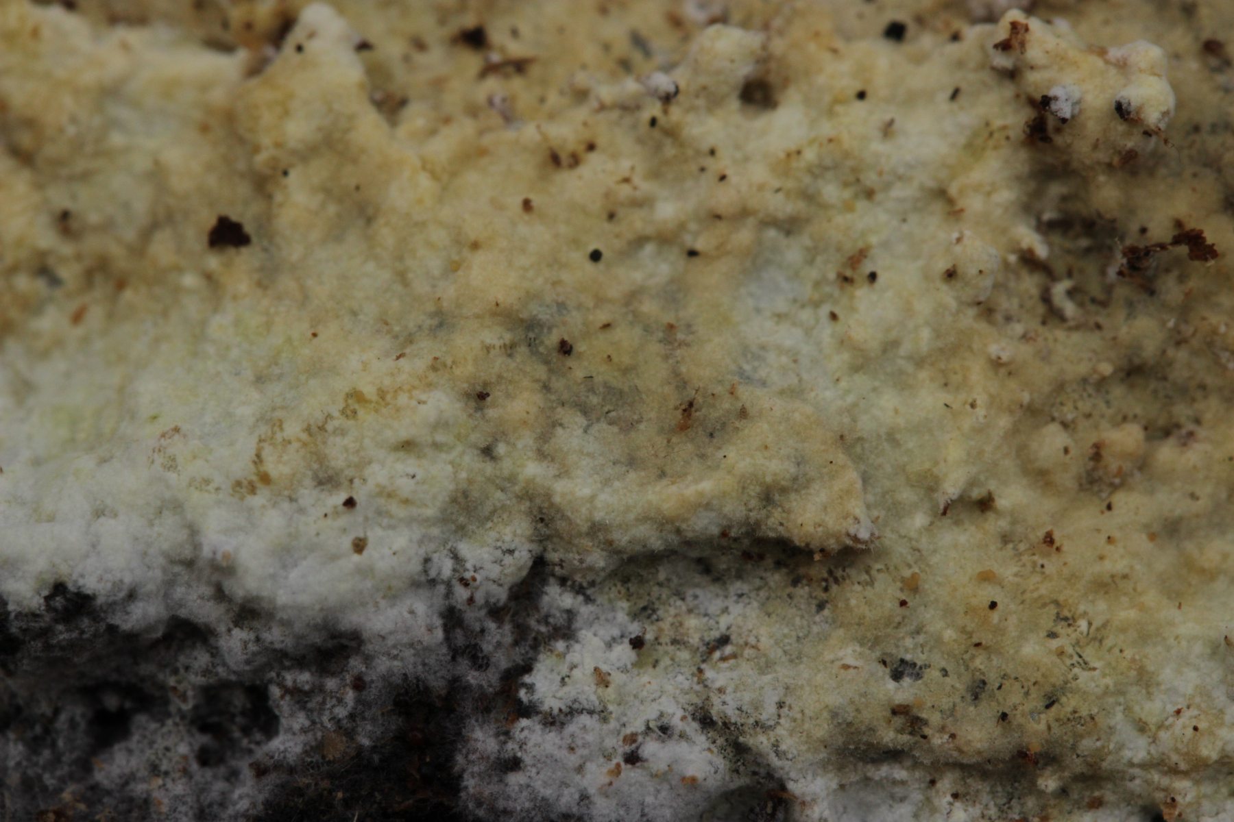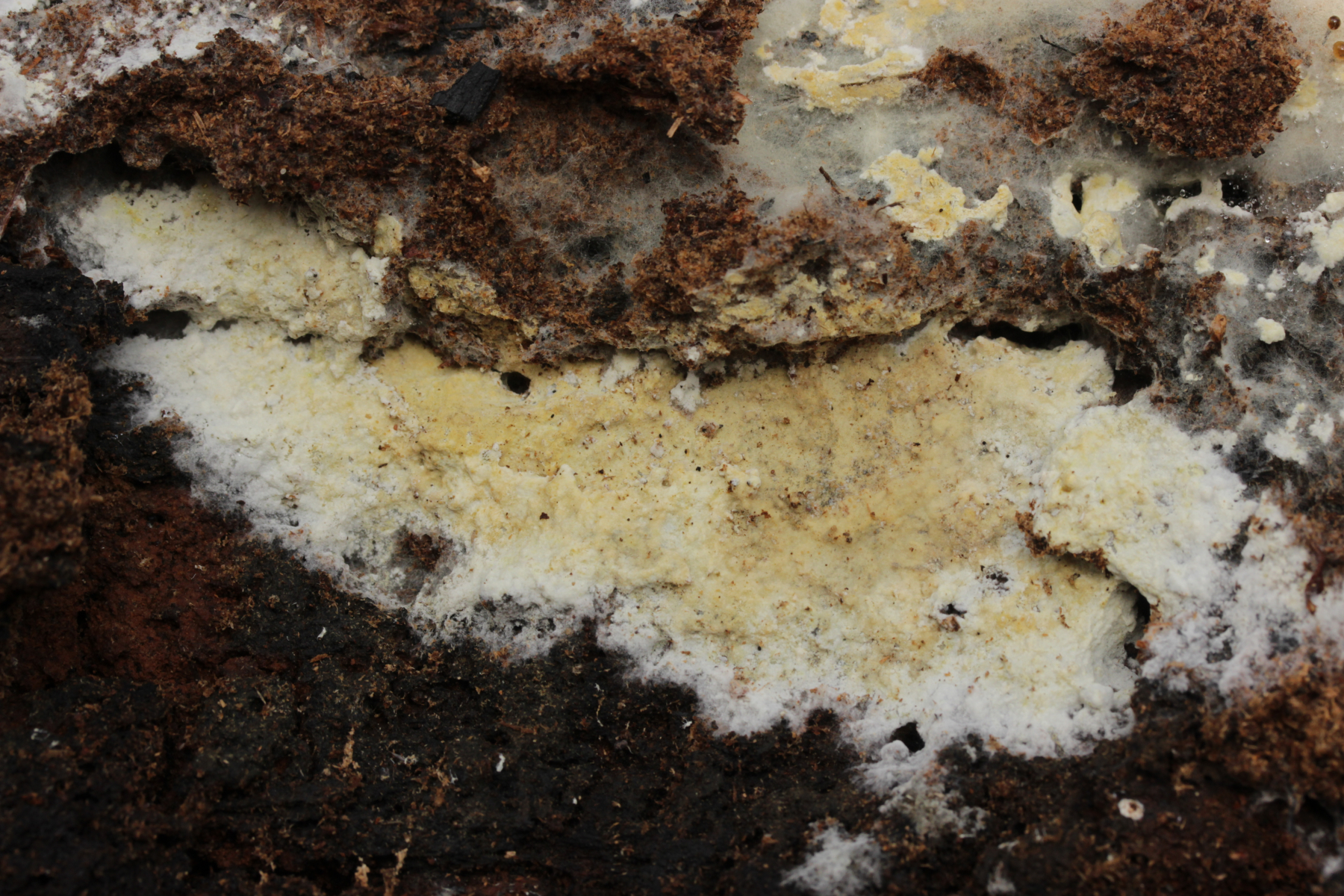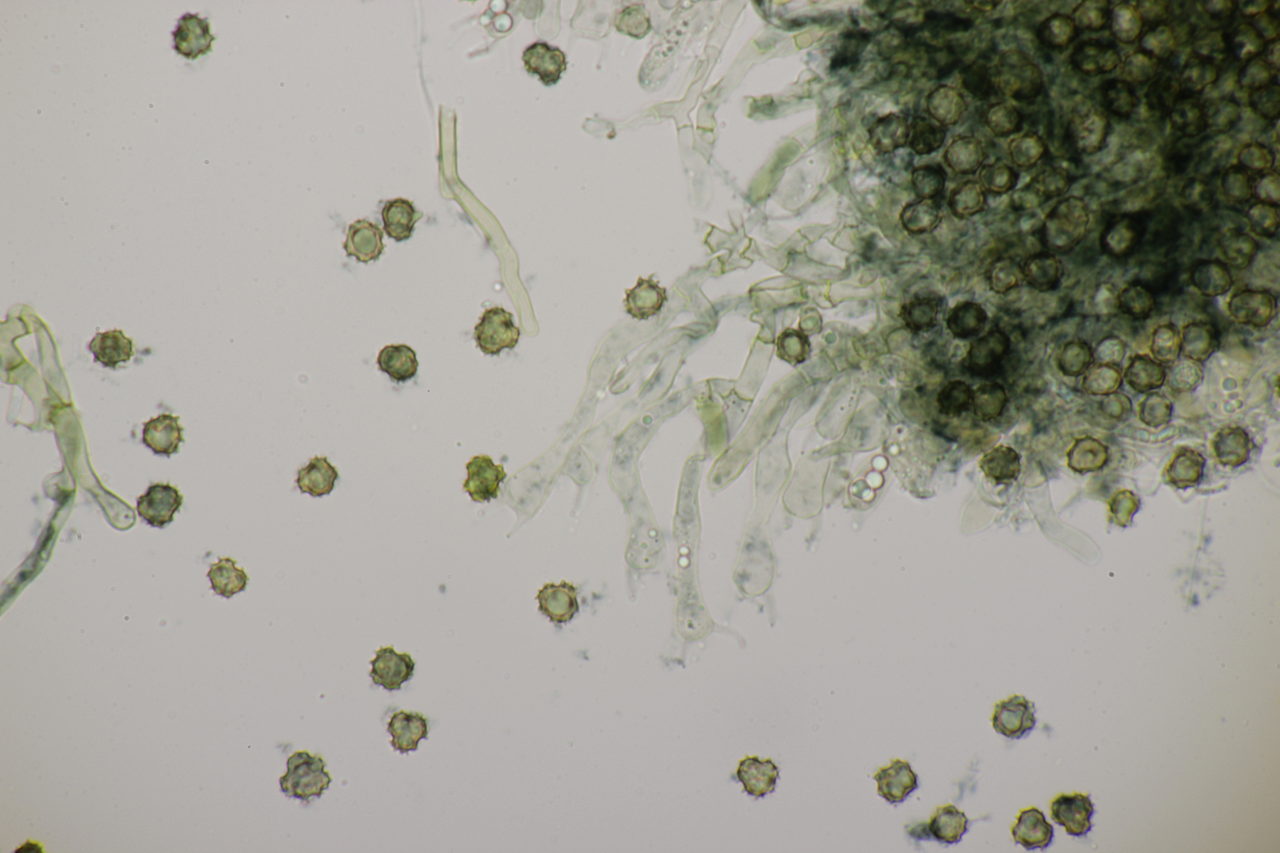 4. In der Hildener Heide dann eine Tomentella. Was man auf den Fotos hier leider nicht so gut sieht, sind Bereiche des Fruchtkörpers, die offenbar mit viel Hymenophor ausgestattet waren und schwärzlich waren. Mikroskopisch gibt es Schnallen, keine Zystiden und eine stark cyanophile Reaktion des Hymeniums. Rhizomorphen sind auch vorhanden. Die Sporen messen (7.2+-0.5) µm x (6.1+-0.6) µm, Q=1.2+-0.1, (6.4-8.0) µm x (5.1-7.2) µm, Q=1.0-1.4. Da kommen offenbar nur T. botryoides und T. ferruginea in Frage. Die Sporengröße liegt irgendwie so mittig zwischen den beiden Arten. Wegen des dunklen Hymenophors tendiere ich zu T. botryoides. Was meint Tomentella?