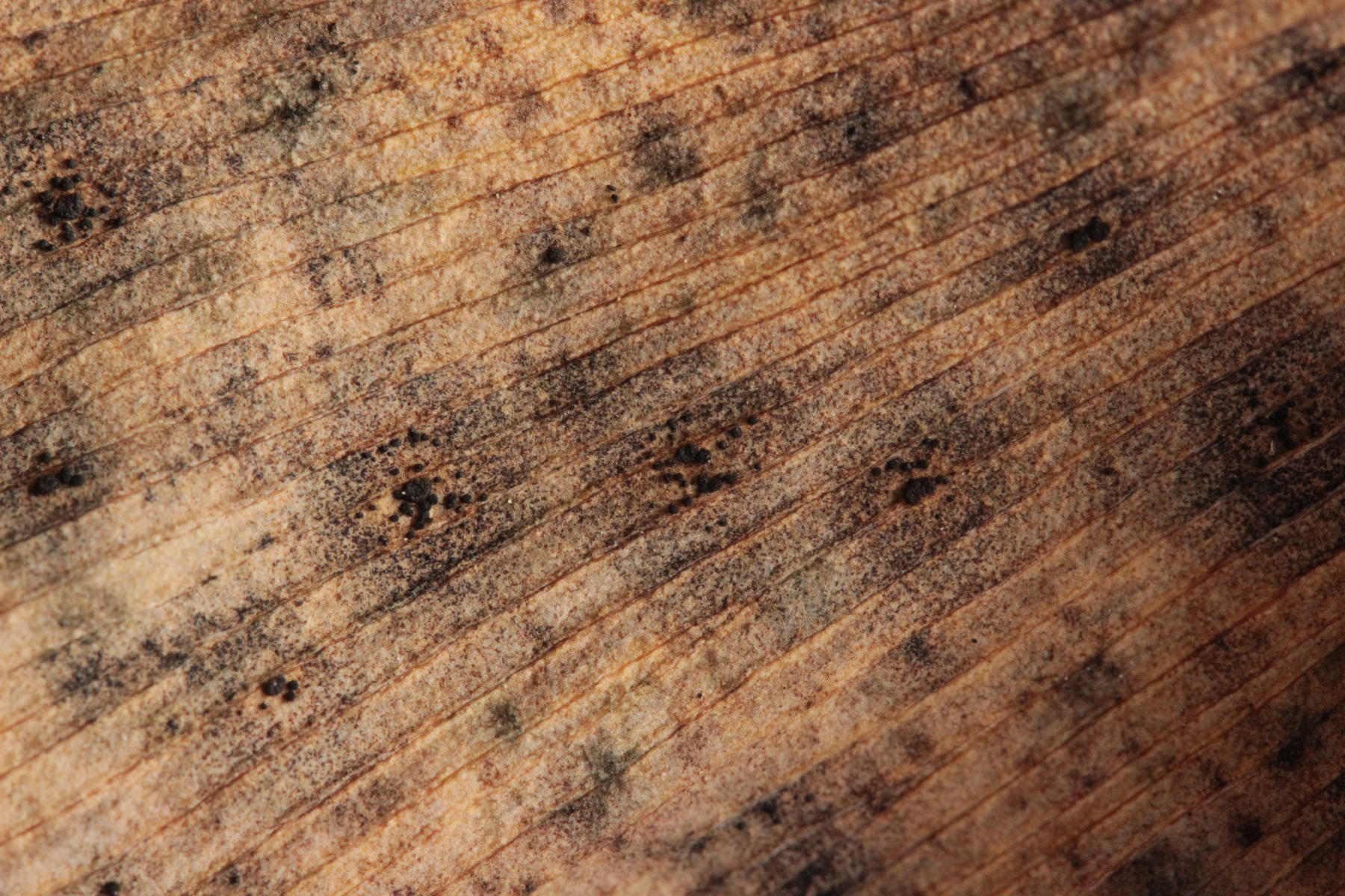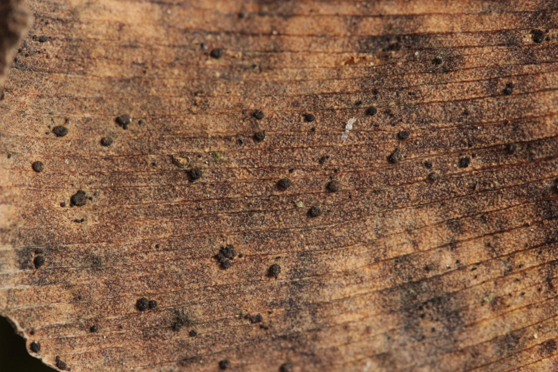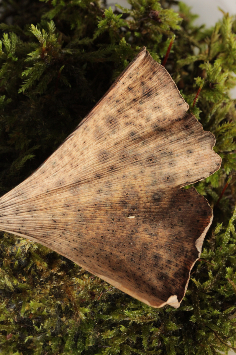 6. Auf dem Heimweg bin ich dann noch an ein paar Ginkgobäumen vorbeigekommen. Da lohnt sich aktuell ein Blick auf die abgestorbenen Blätter des Vorjahres: Man findet dort nämlich mit etwas Glück kleine schwarze Punkte, die Teliosporen von Bartheletia paradoxa, einem ganz urtümlichen Pilz, der zwar Telien bildet, aber trotzdem kein Rost ist.