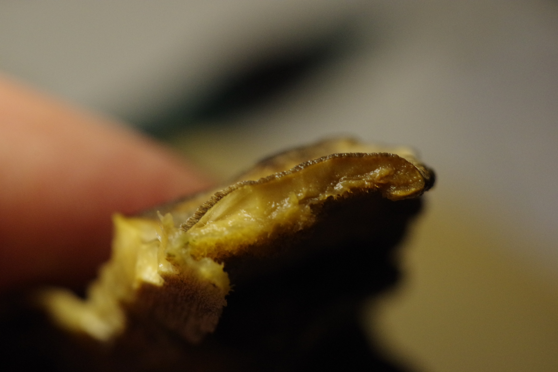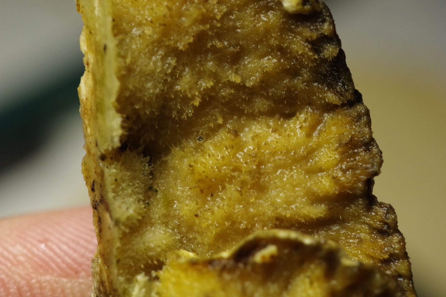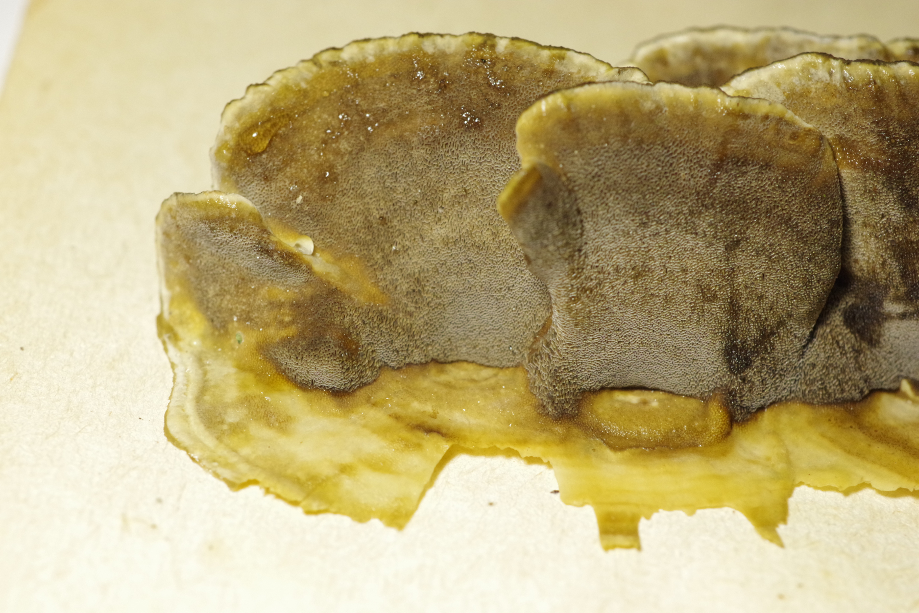 • Hallo, gehe ich recht in der Annahme, dass es sich hierbei um den Zweifarbigen Porling handelt. Von heute, an einer abgebrochenen, ohne Bodenkontakt liegenden Salweide. Der resupinate Teil ist sehr dünn, wie Folie, löste sich überraschend gut ab. Die Hüte sind zäh wie Leder. Neutraler pilziger, recht kräftiger Geruch.