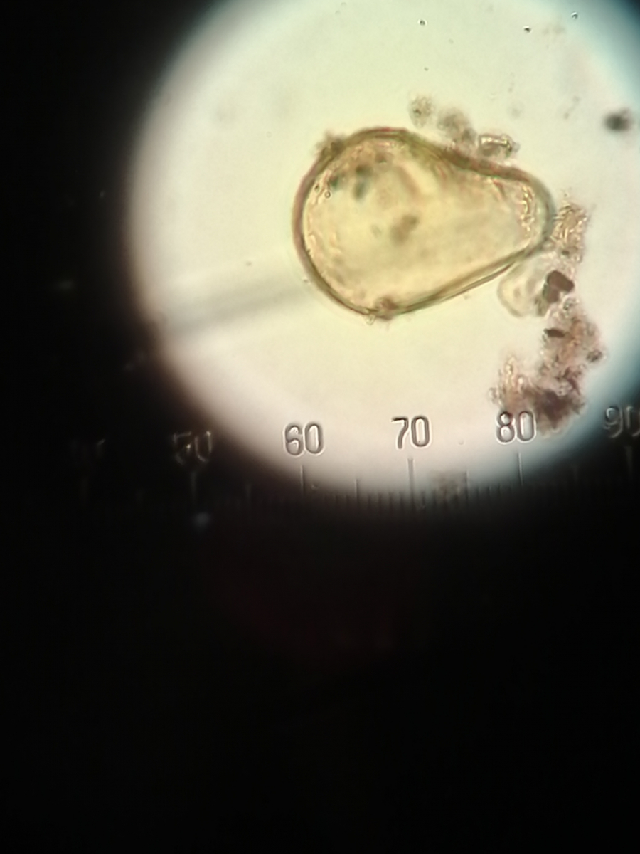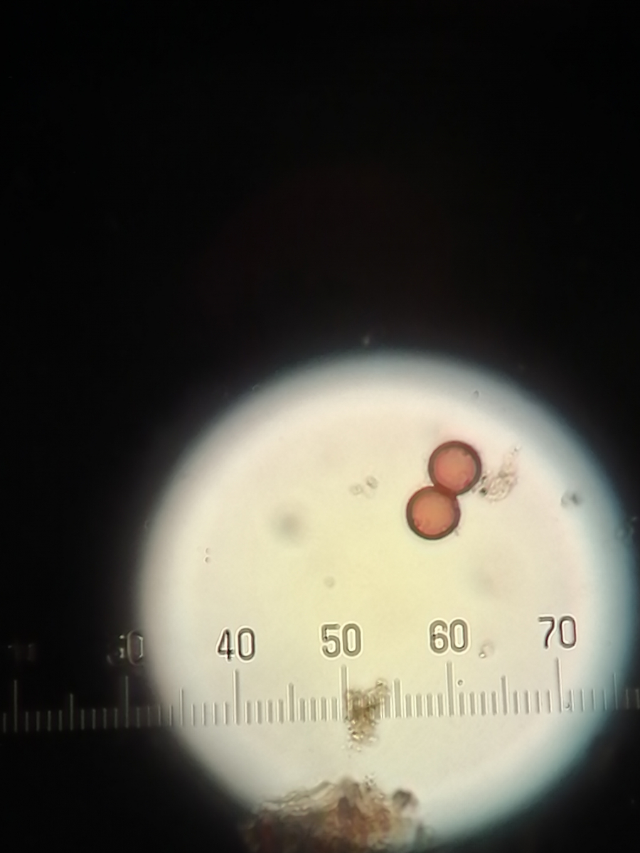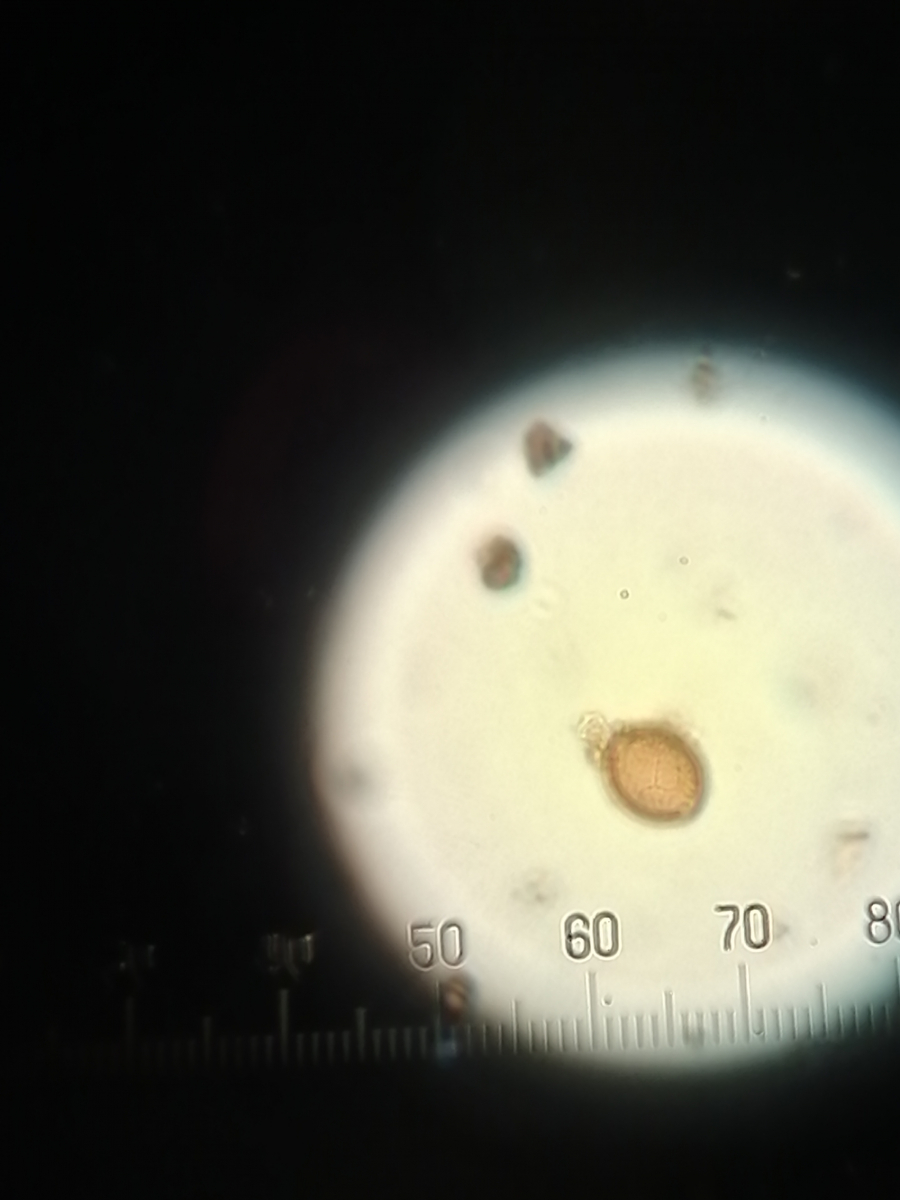 • Aus diesem Pilze-Bereich habe ich auch ein paar Sporen. Vielleicht kennt sich damit auch jemand aus. Gibt es eine erkennbare Übereinstimmung zwischen den oberirdischen Pilzkörpern und den gefundenen Sporen? (Leider gibt es hier auch keine genauen Größen)