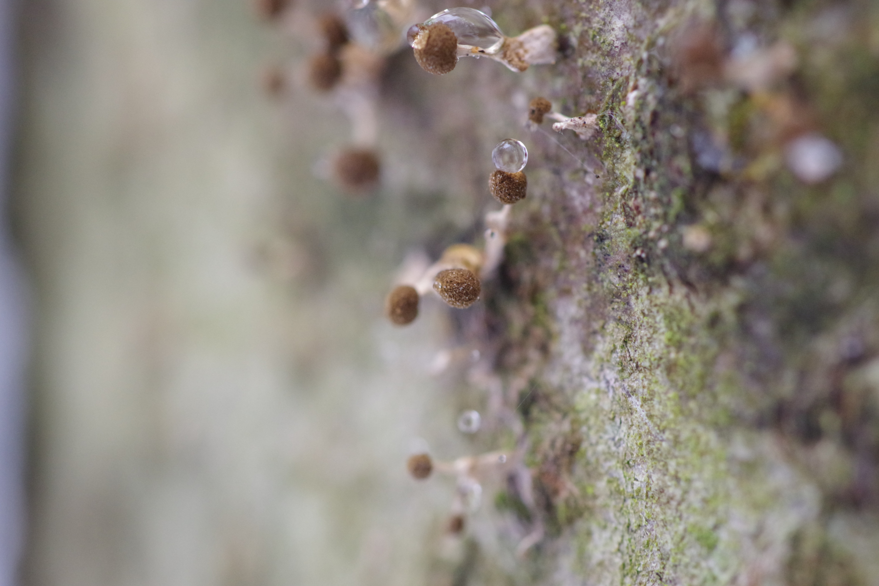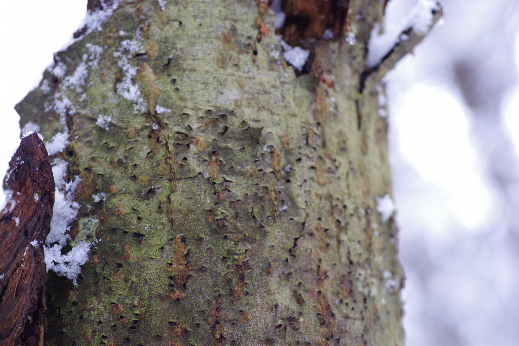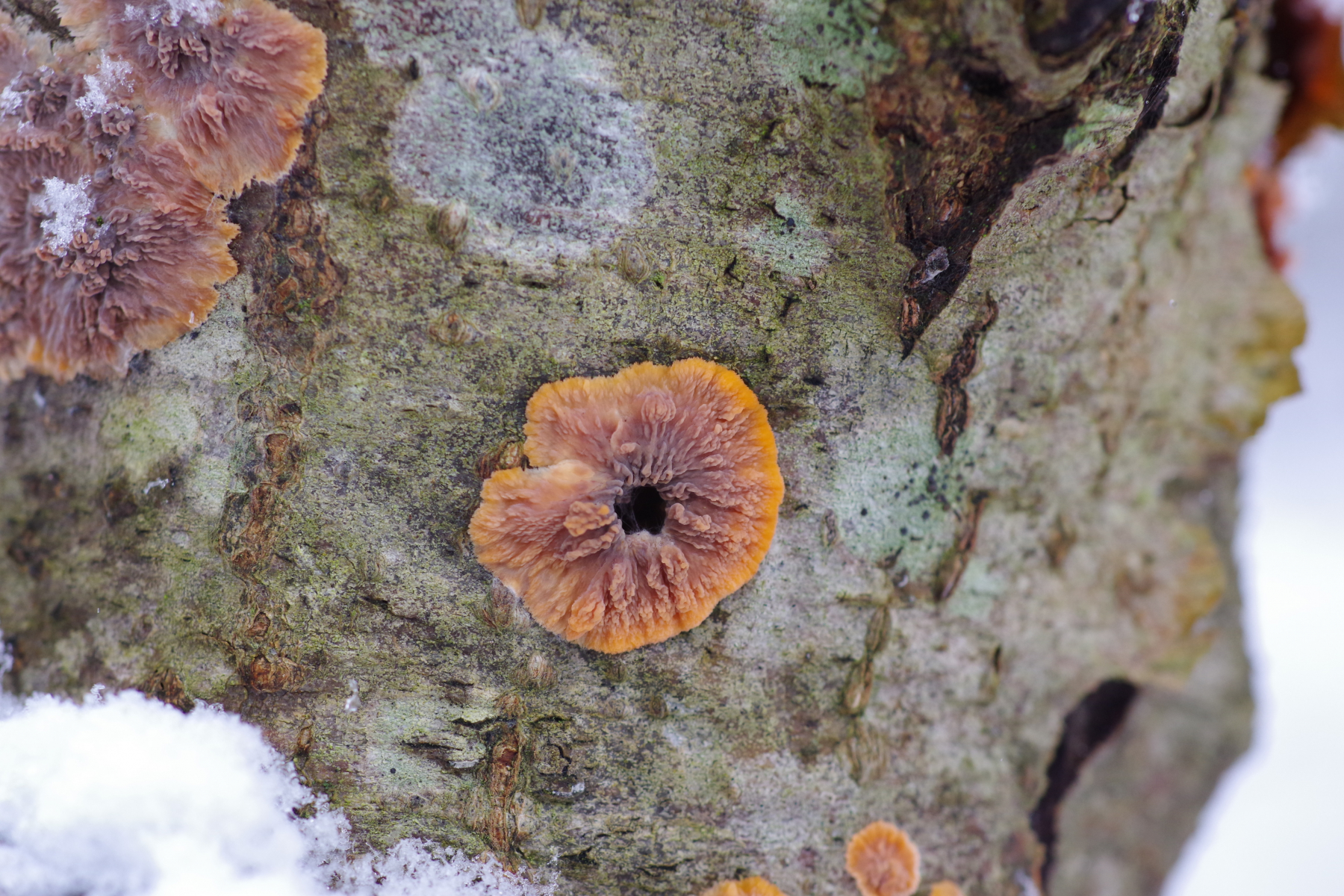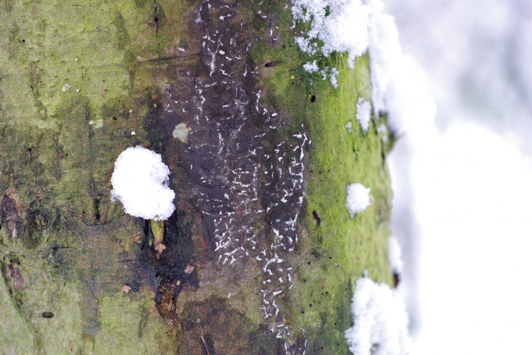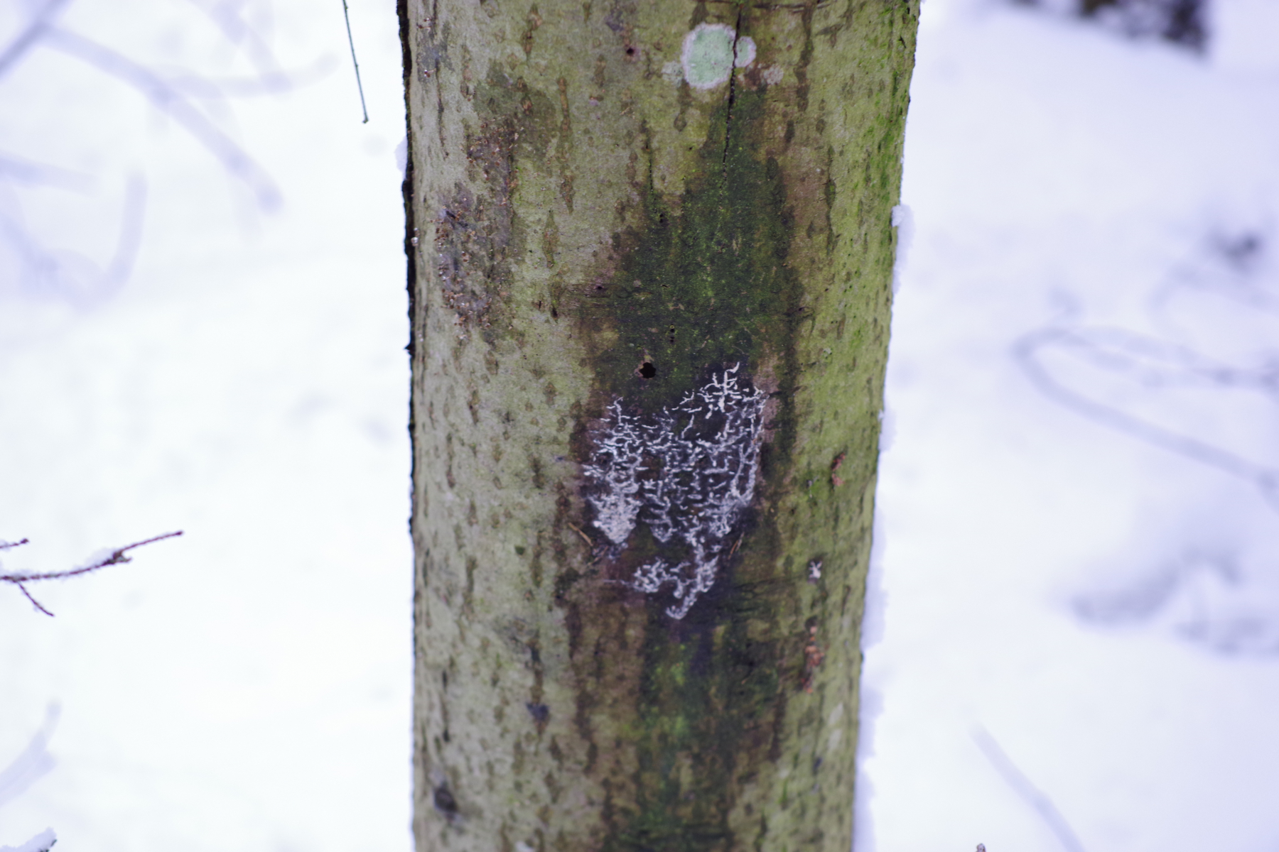 an einer Reihe von noch stehenden toten Grauerlenstämmen (die Kronen sind alle abgebrochen und unter Schnee) gibt es etliches an pilzartigen Objekten: