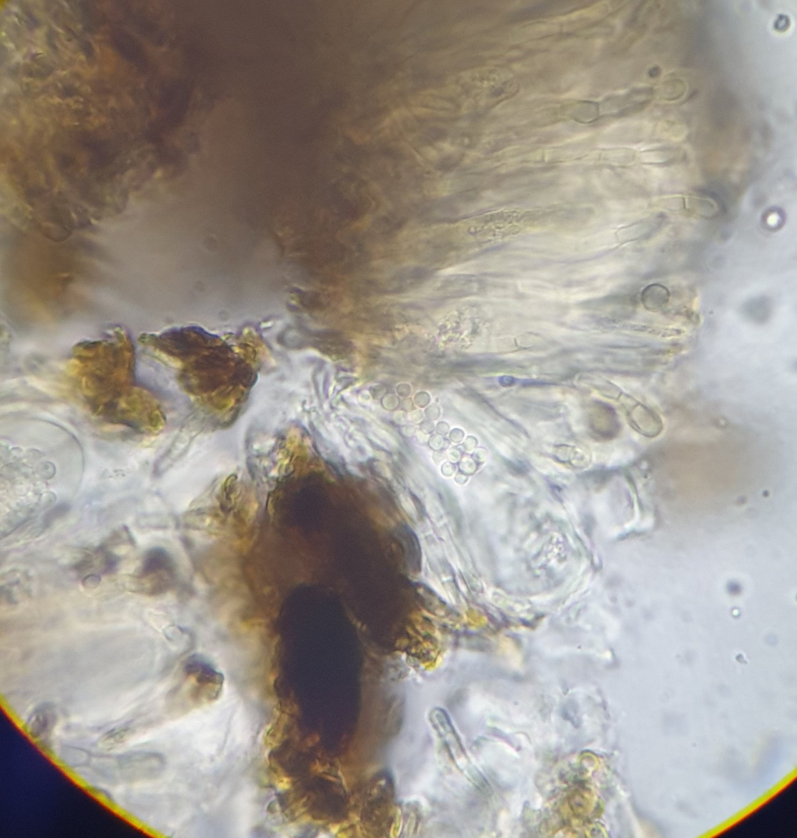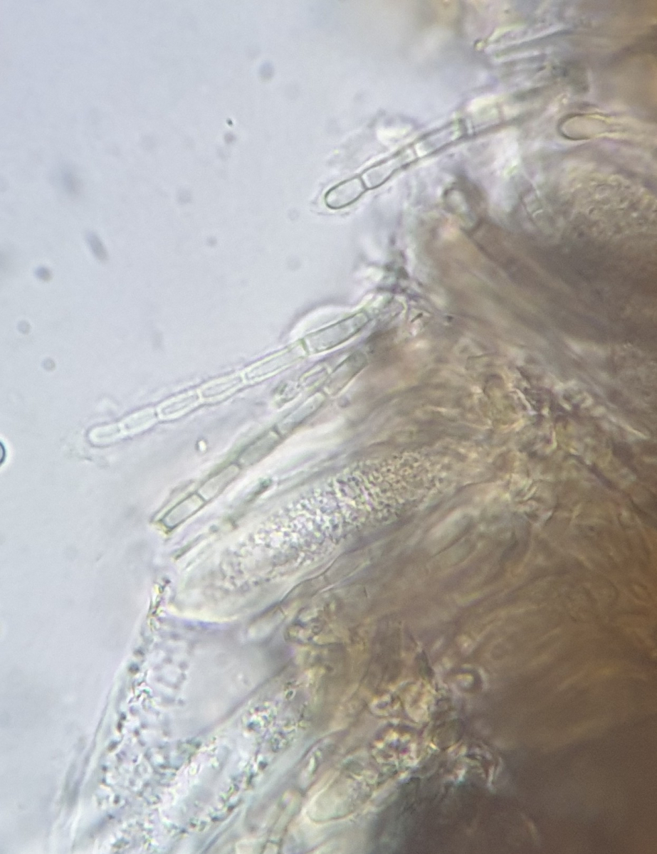 Hatte letztes Jahr auch mal eine seltsame difformis mit violettlichem Hymenium und etwas größeren Sporen als üblich, seither nicht mehr so gesehen. Oder es war eine geschädigte, verfärbte S. resinae, wer weiß. Ansonsten alle Merkmale wie üblich. Vielleicht findest du sowas ja auch mal: