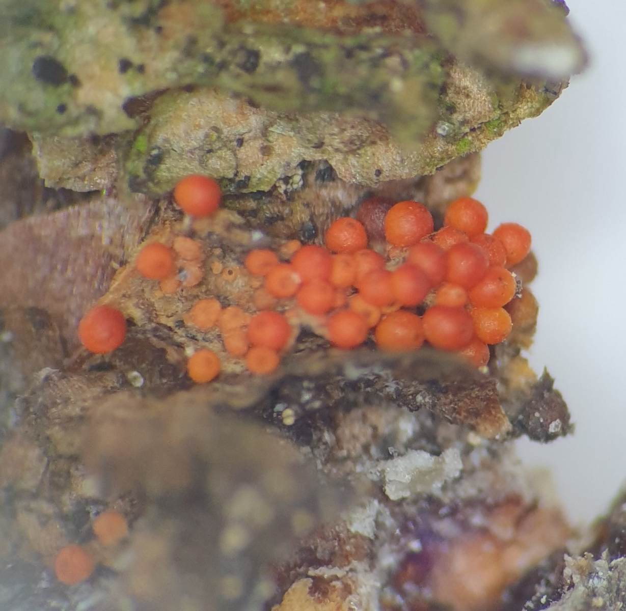 Das ist, auch ohne Mikros, ziemlich sicher Neonectria fuckeliana, der Nadelholz-Pustelpilz.