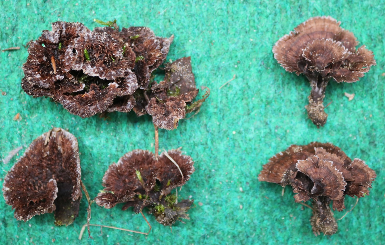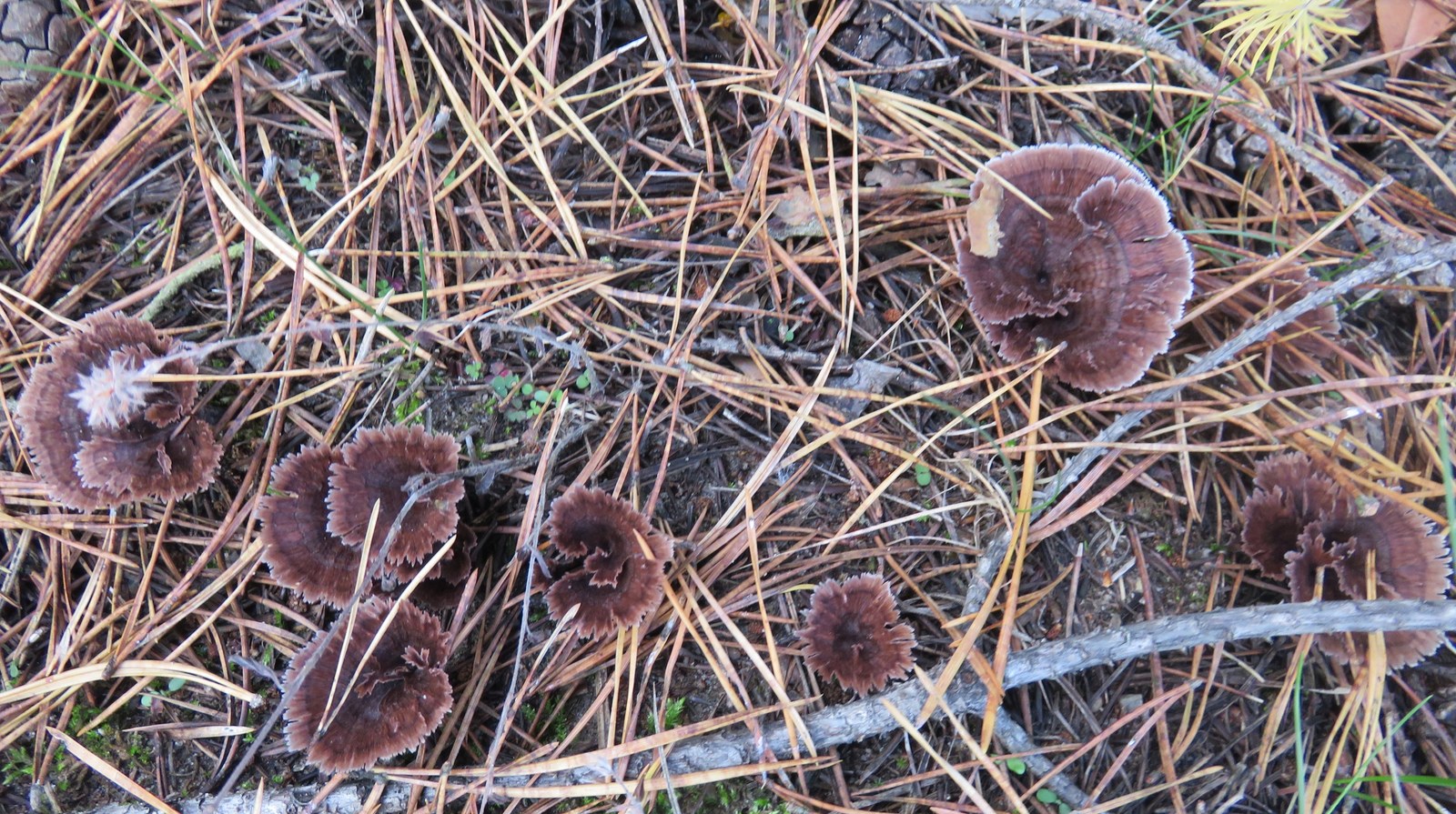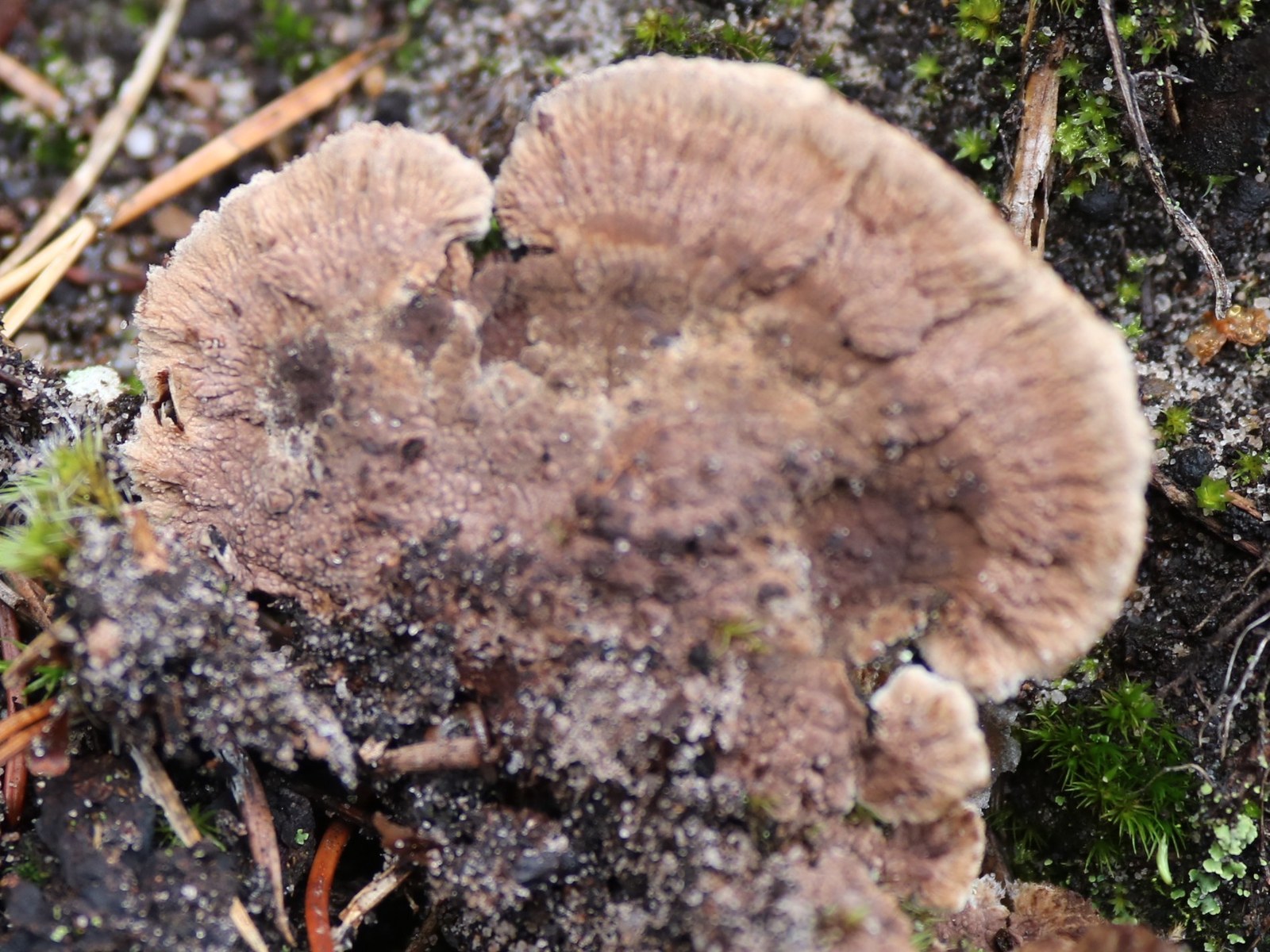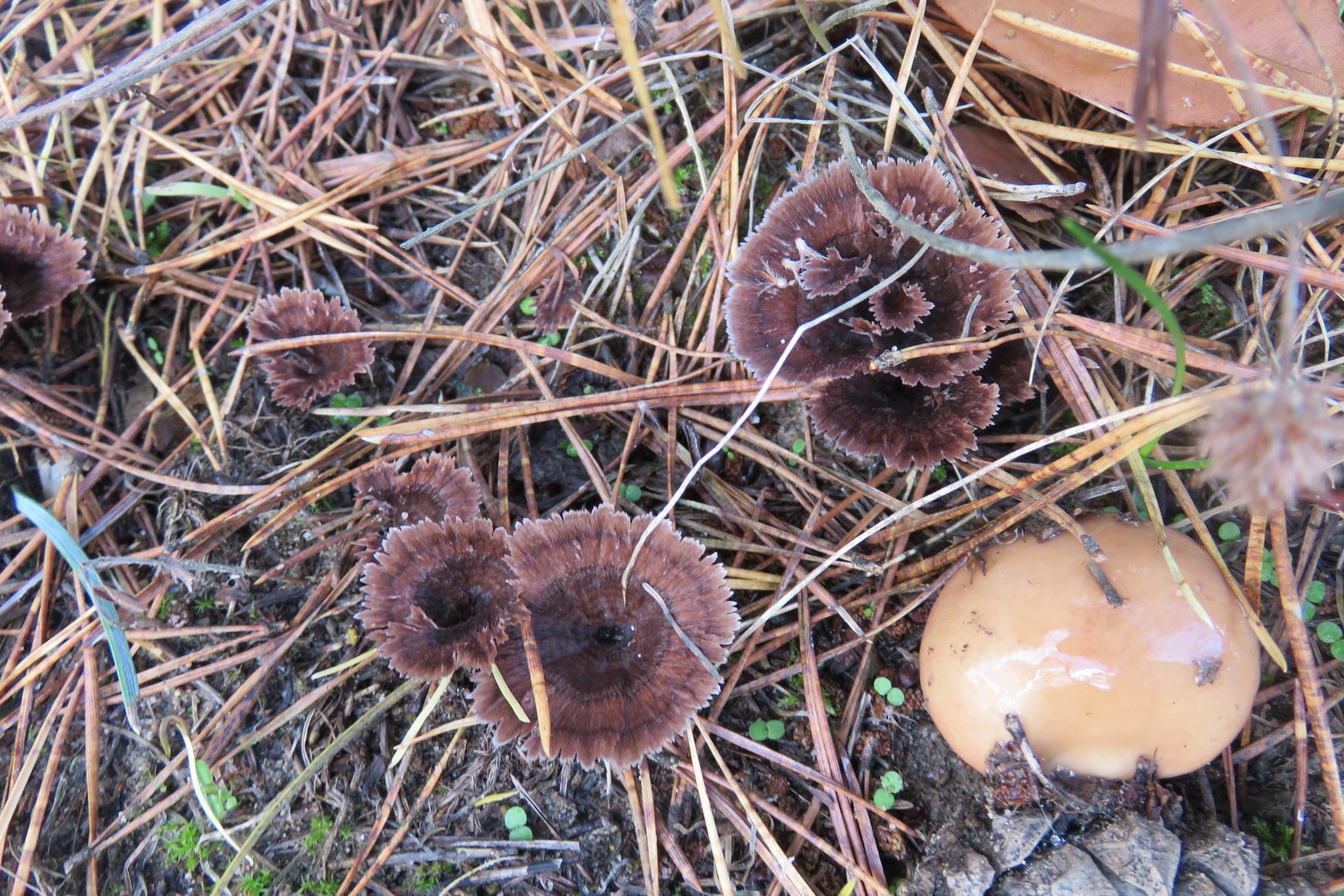 1) Thelephora caryophyllea (?), neben den frisch geschlüpften Butterpilzen.