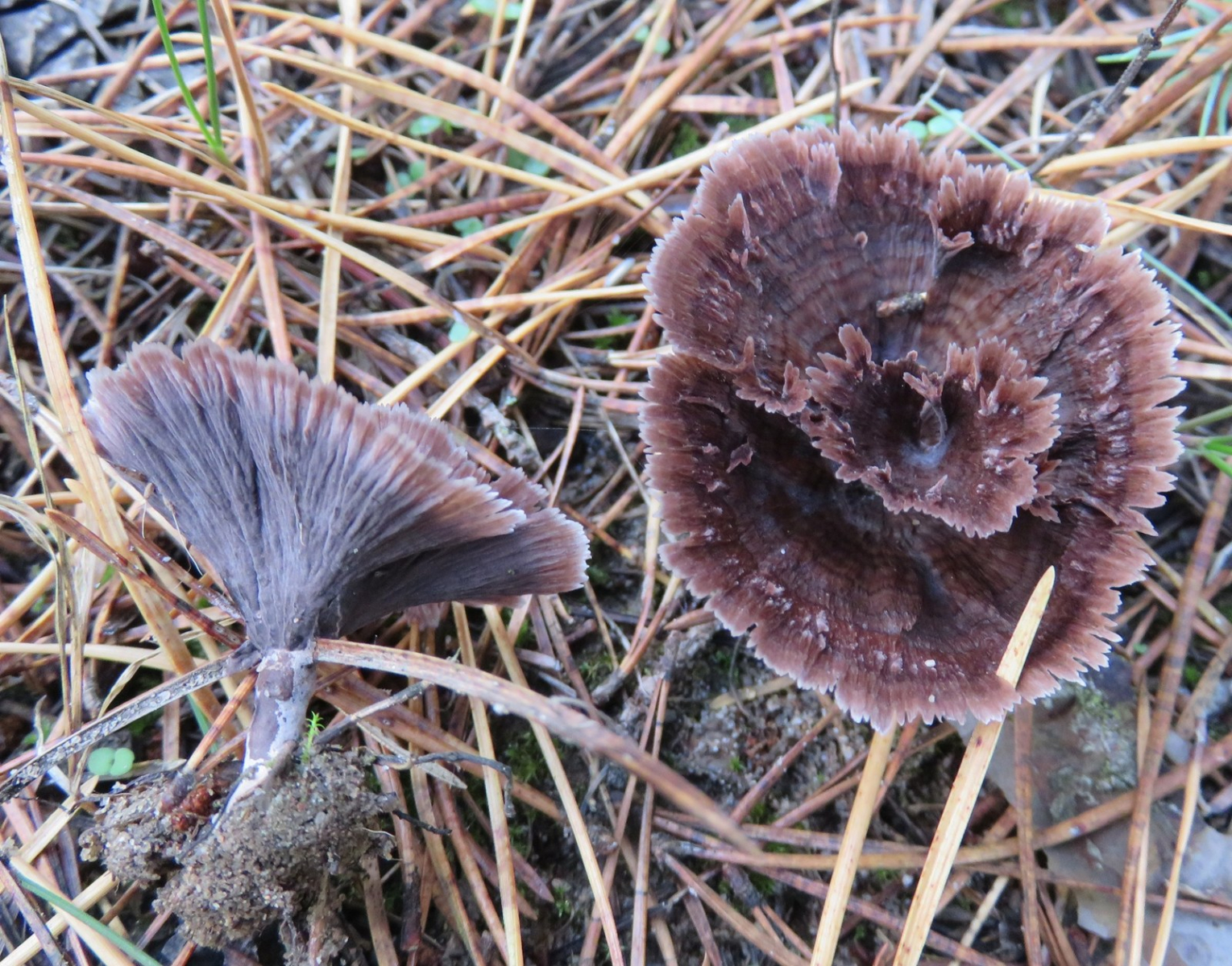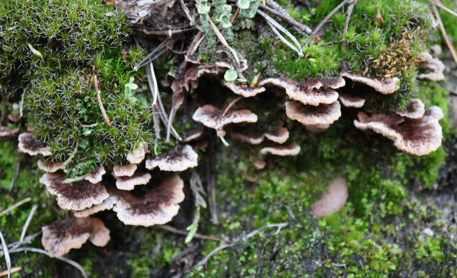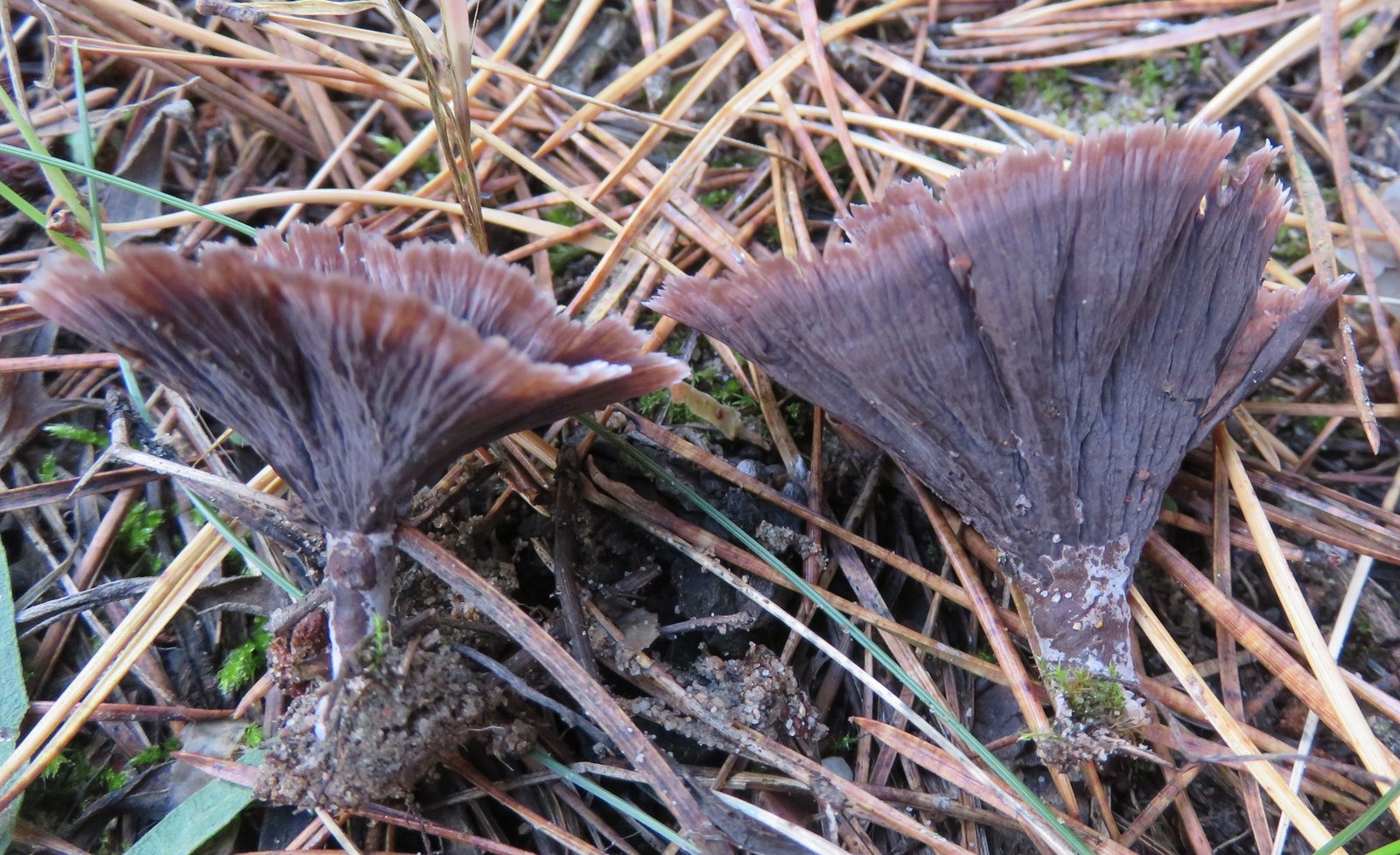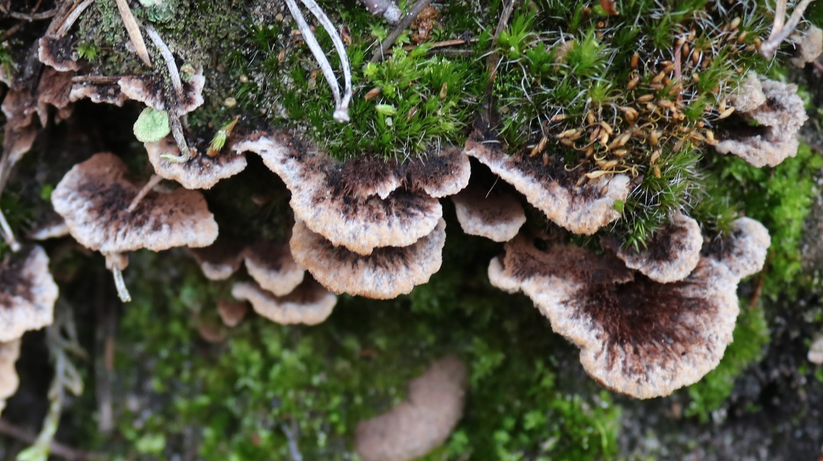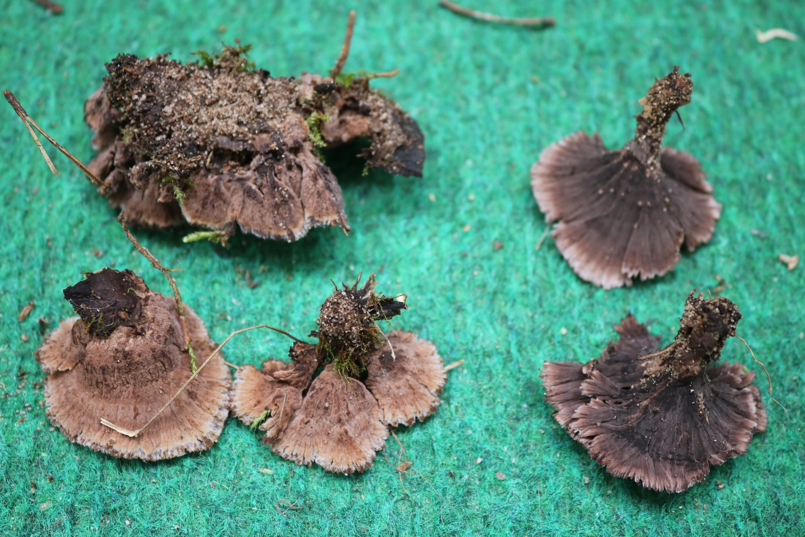 1) Thelephora caryophyllea (?), neben den frisch geschlüpften Butterpilzen.