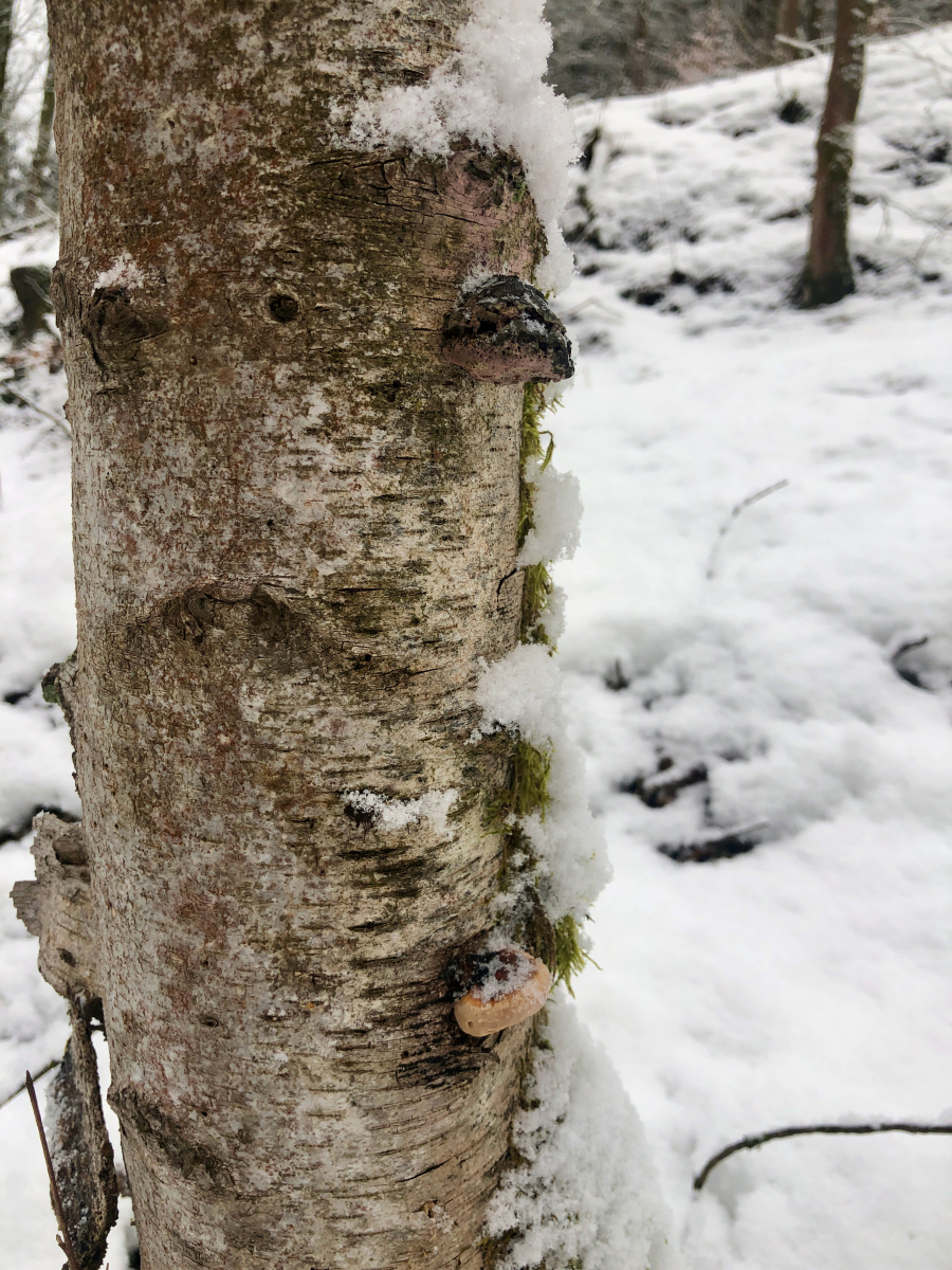gestern und vorgestern hat es kübelweise geschüttet, sodass von der Schneepracht nur noch Reste geblieben sind. Heute ist es wieder kalt und es hat geschneit. Überall Eiszapfen an Bäumen und an Pilzen. Und erstaunlicherweise habe ich heute sogar Pilze gefunden, an denen ich seit Wochen vorbeigehe, ohne sie wahrzunehmen. Dabei wollte ich heute nur ein paar Birkenporlinge pflücken.