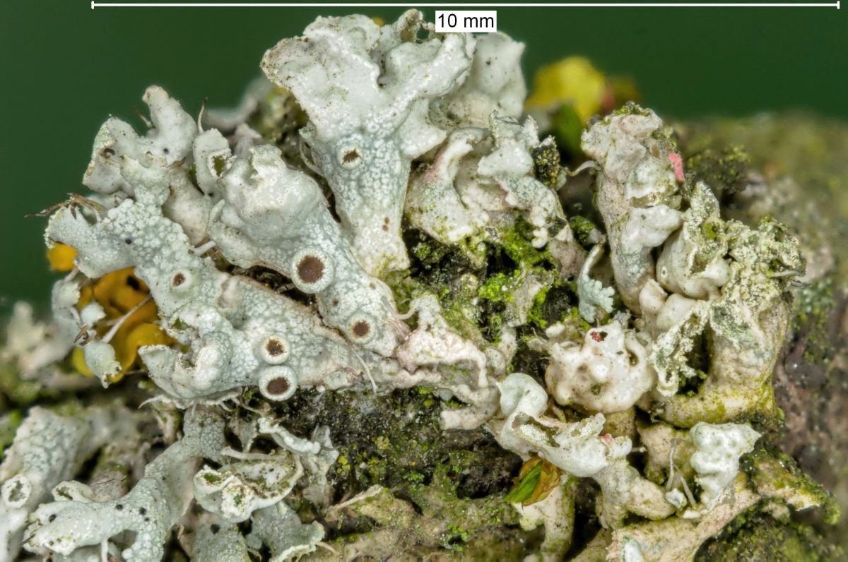 auf einem Zweig eines Apfelbaums fand ich neben vielen Physcia tenella auch diese Art, die ich eigentlich für P. adscendens halte, da die Lappenenden überwiegend helmförmig ausgebildet sind: