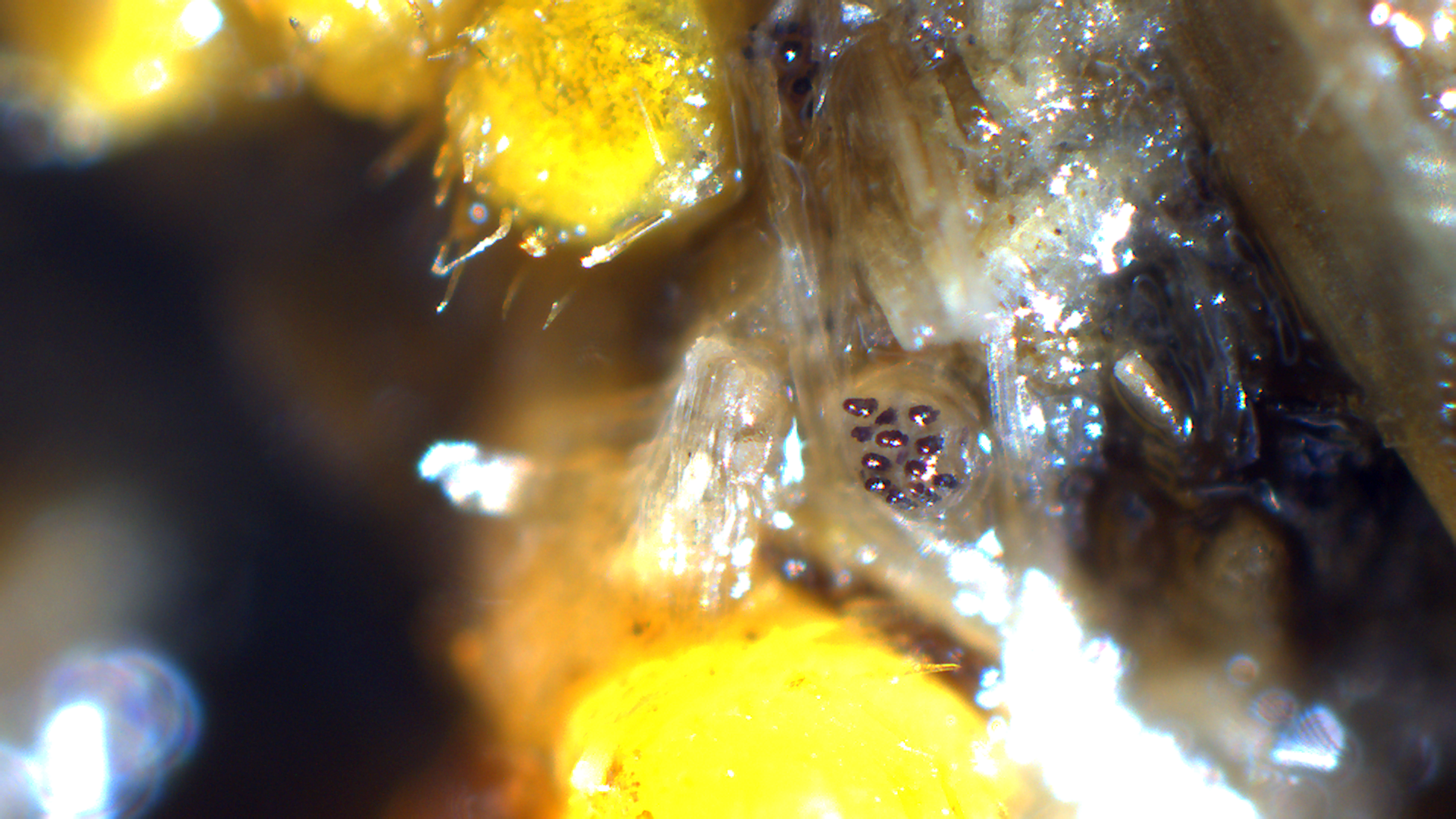 beim Mikroskopieren der Borstlinge fielen mir auf der Dungprobe weiter Pilze auf, u.a. die nun folgenden Kotlinge. Sie zu fotographieren war nicht so einfach, da ich nur eine Plastikbilligstereolupe habe. So habe ich es mit Auflicht mit dem Mikroskop versucht. Darunter habe ich dann auch versucht, einen mit der Pinzette zu erwischen, was ebenfalls nicht so einfach war. Bei dem, was ich fotografiert habe, bin ich natürlich auch nicht sicher, ob das nun alles zu einer Art gehört.