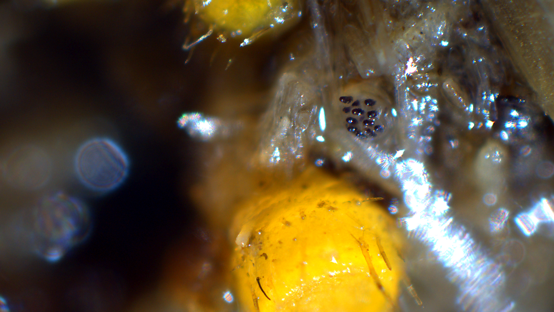 beim Mikroskopieren der Borstlinge fielen mir auf der Dungprobe weiter Pilze auf, u.a. die nun folgenden Kotlinge. Sie zu fotographieren war nicht so einfach, da ich nur eine Plastikbilligstereolupe habe. So habe ich es mit Auflicht mit dem Mikroskop versucht. Darunter habe ich dann auch versucht, einen mit der Pinzette zu erwischen, was ebenfalls nicht so einfach war. Bei dem, was ich fotografiert habe, bin ich natürlich auch nicht sicher, ob das nun alles zu einer Art gehört.