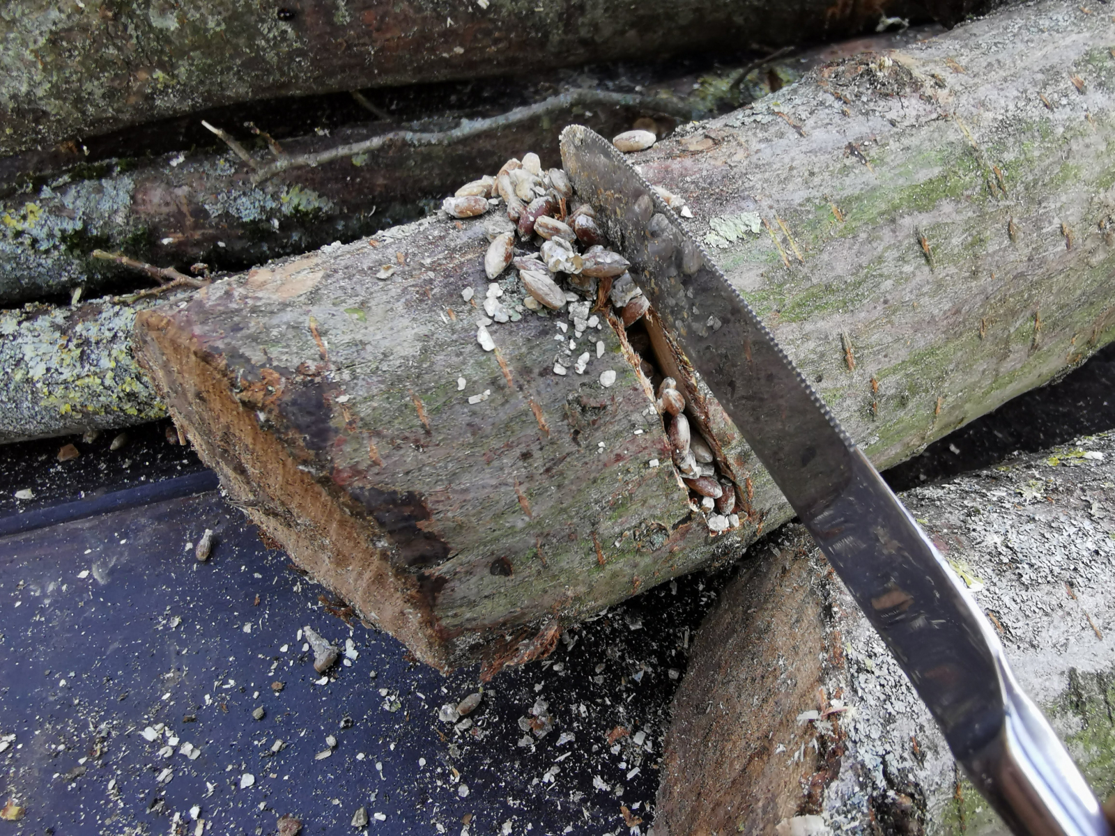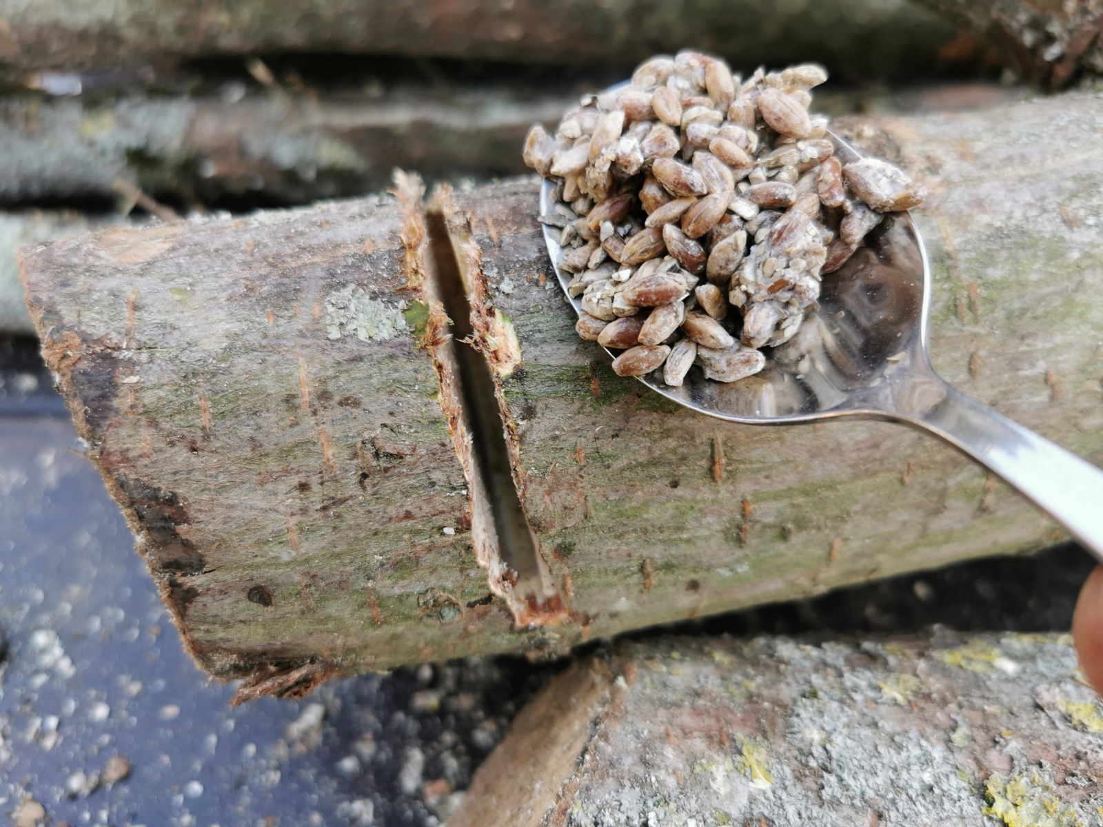 Früher habe ich die Brut selbst hergestellt, aber das sterile Arbeiten und das wochenlange Warten habe ich mir dieses Mal einfach gespart, denn das lohnt sich nicht bei den Preisen. Mit der fertigen Brut kann auch jeder Anfänger leicht Pilze "züchten" (das ist keine korrekte Bezeichnung, da keine züchterische Auswahl erfolgt) oder besser "kultivieren". Denn das Ausbringen der Brut auf ein Substrat erfolgt ohnehin unsteril. Da wird bestenfalls der Heuballen vorher gewässert und fermentiert, aber da ich Holz hatte, war außer ein wenig Planung (das Holz muss trocknen, darf aber nicht zu lange liegen. Die Schnittflächen müssen aber frisch sein.) nichts zu beachten.