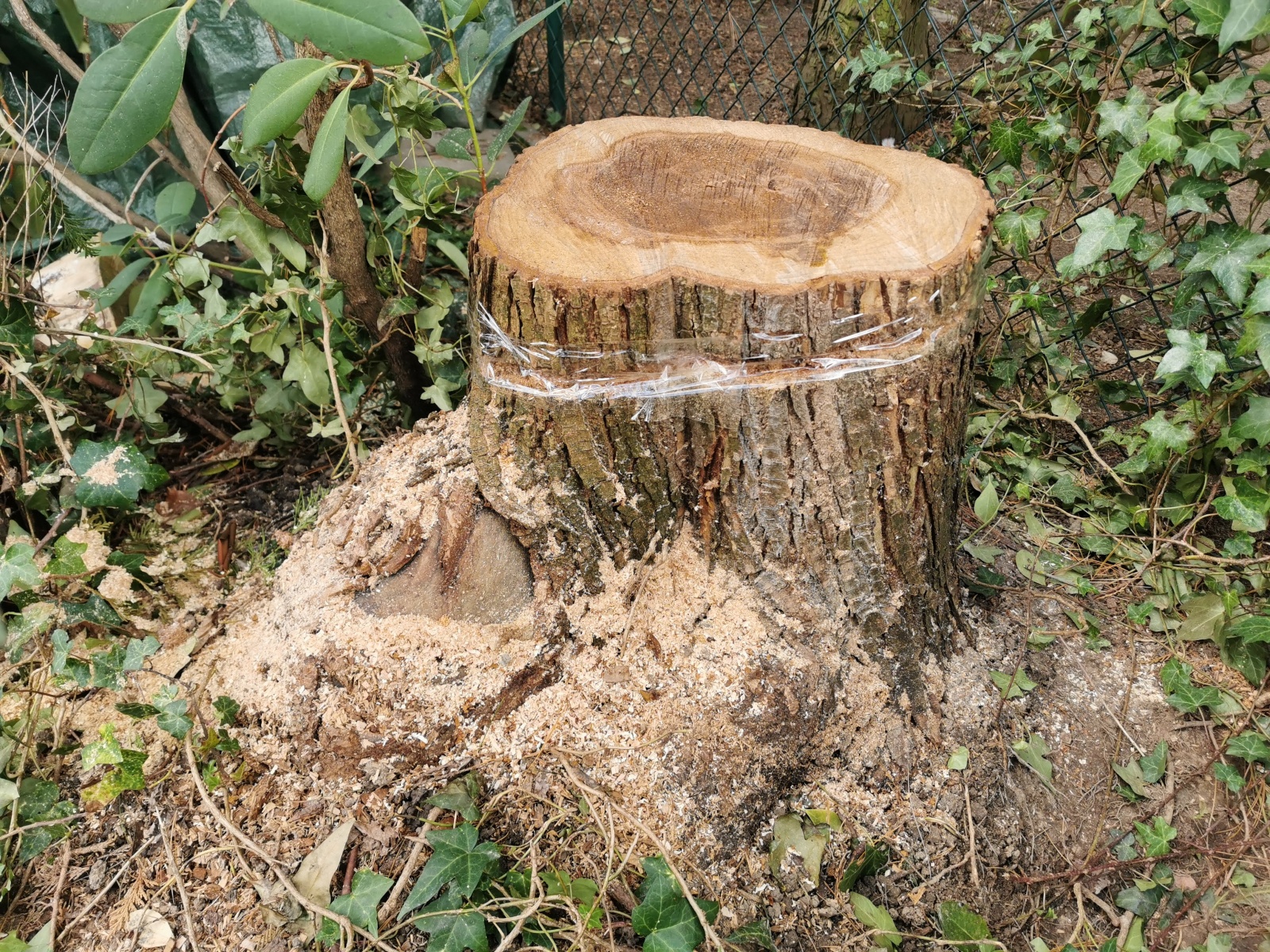 Mit der Brut habe ich nun das Holz einer Ulme beimpft, die ich Ende Februar habe fällen lassen. Ich hatte dafür den Igelstachelbart und den Ulmenrasling (bei Pilzmännchen "Ulmenseitling") bestellt. Ferner habe ich den Ulmenstumpf beimpft, in der Hoffnung, den so biologisch etwas schneller als normal abzubauen. Außerdem habe ich den Stumpf einer Fichte mit einer weiteren Art beimpft. Für letzteren habe ich mir extra noch ein Dach gebastelt, da er zu sehr in der Sonne steht und daher abgeschattet werden muss.