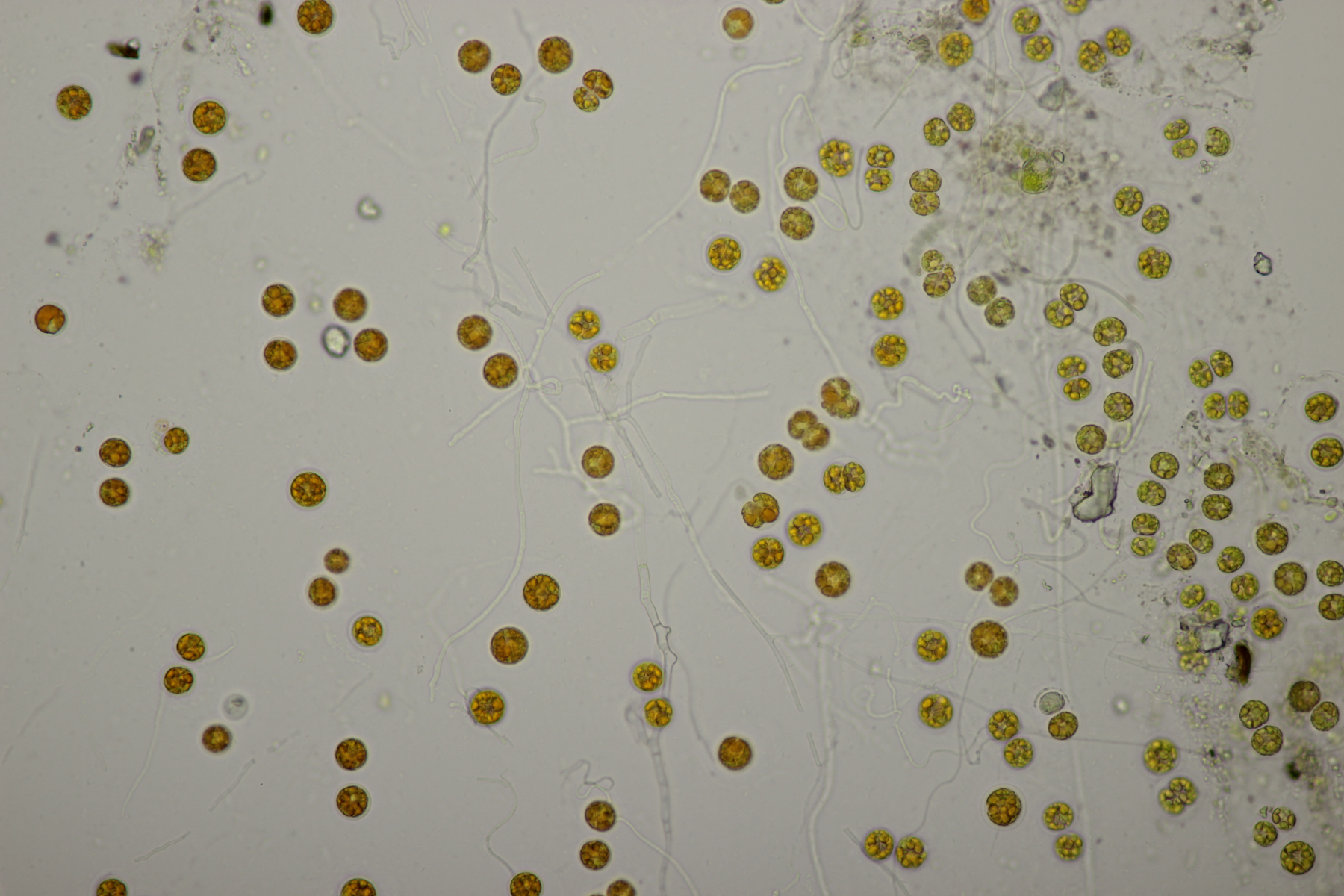 1. Weiter unten ist die Mottbruchhalde nicht so lebensfeindlich und man kann seltsame Wesen entdecken. Das hier wirkte im ersten Moment wie ein vom Frost verunstaltetes Moosbecherchen, entpuppte sich im Mikroskop aber dann eher als Alge.