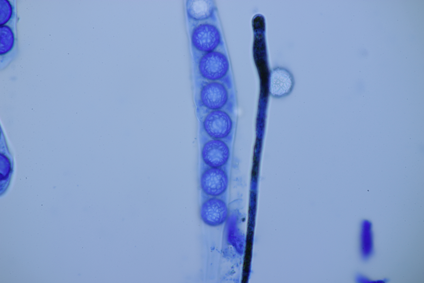 2. Aber etwas weiter gab es dann doch Moosbecher. Mit runden Sporen von 15.5.-18.5 µm und einem Netz mit bogigen Elementen scheint hier Lamprospora hispanica ein heißer Kandidat zu sein.