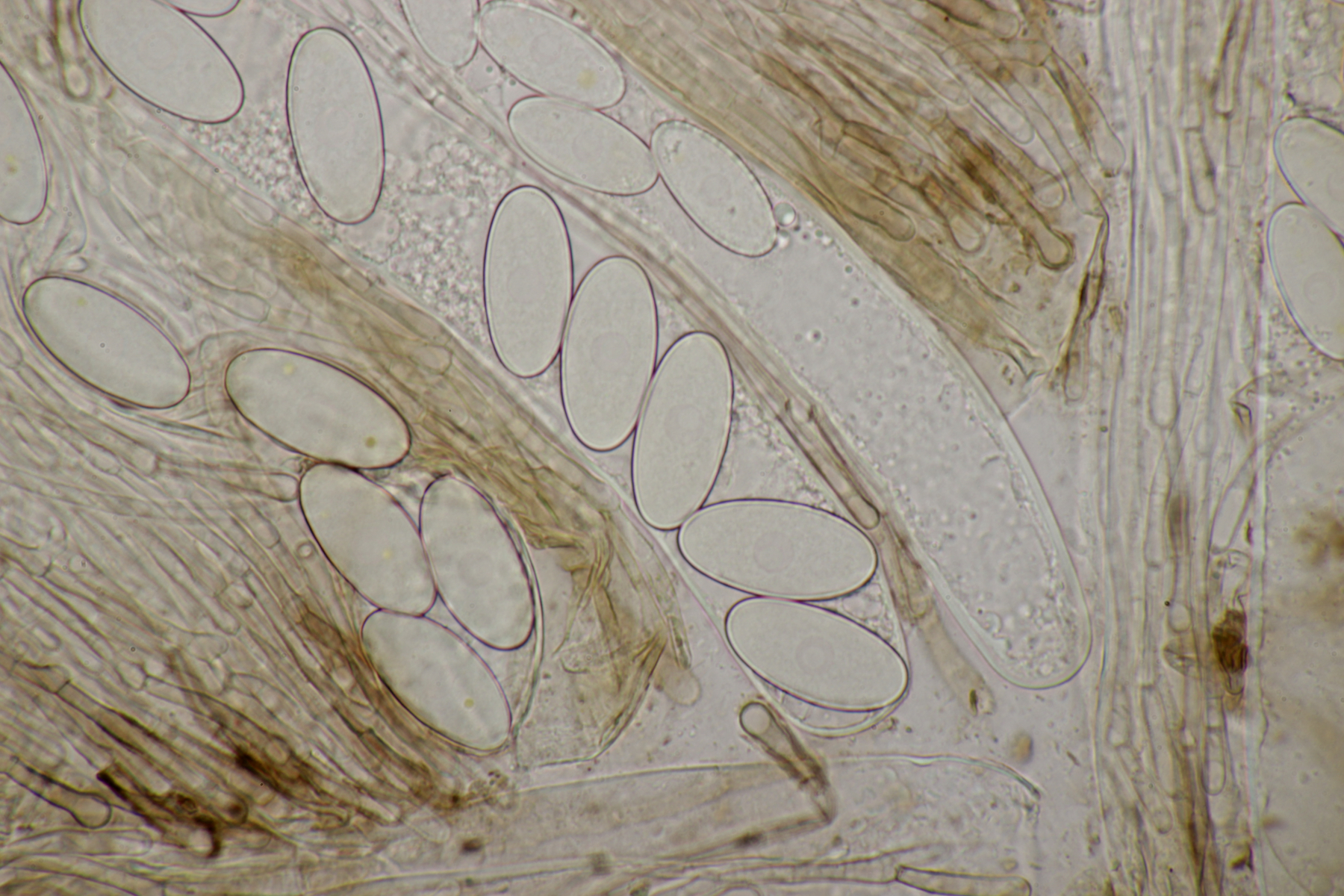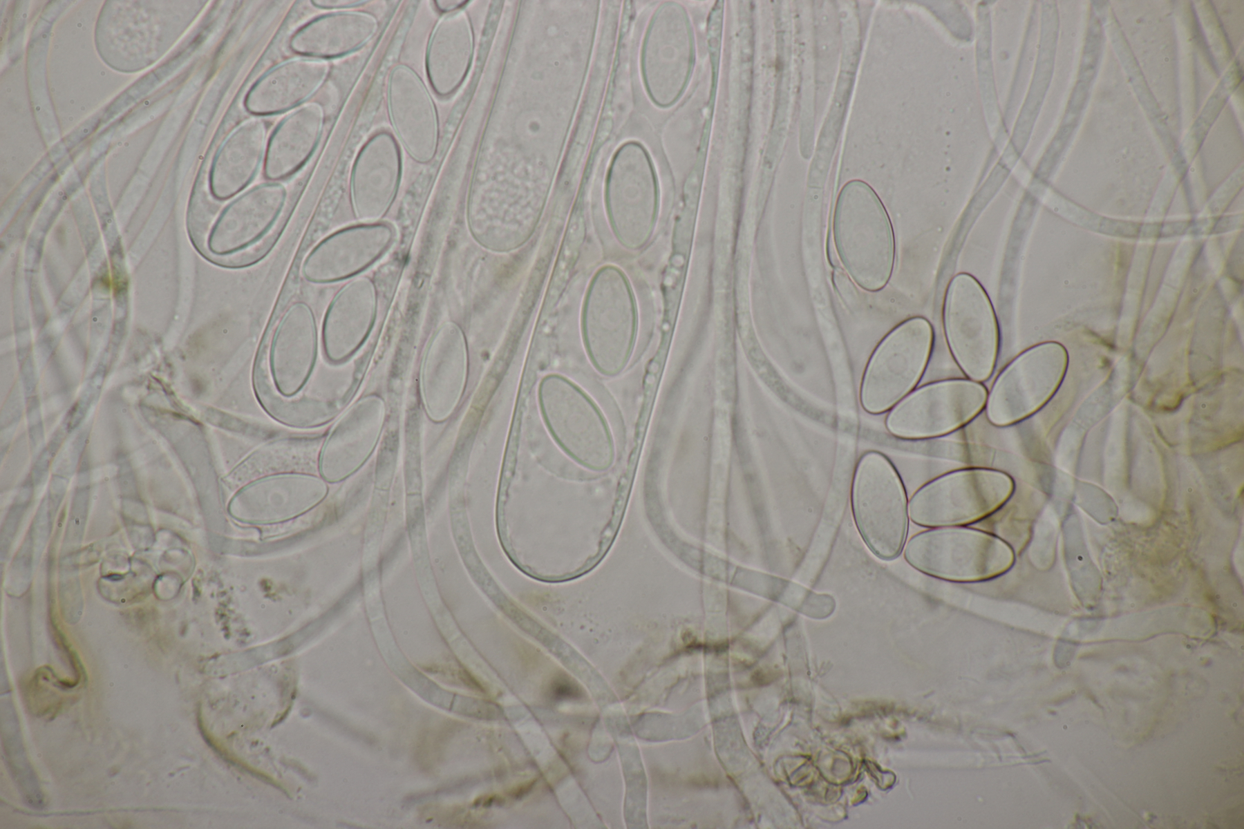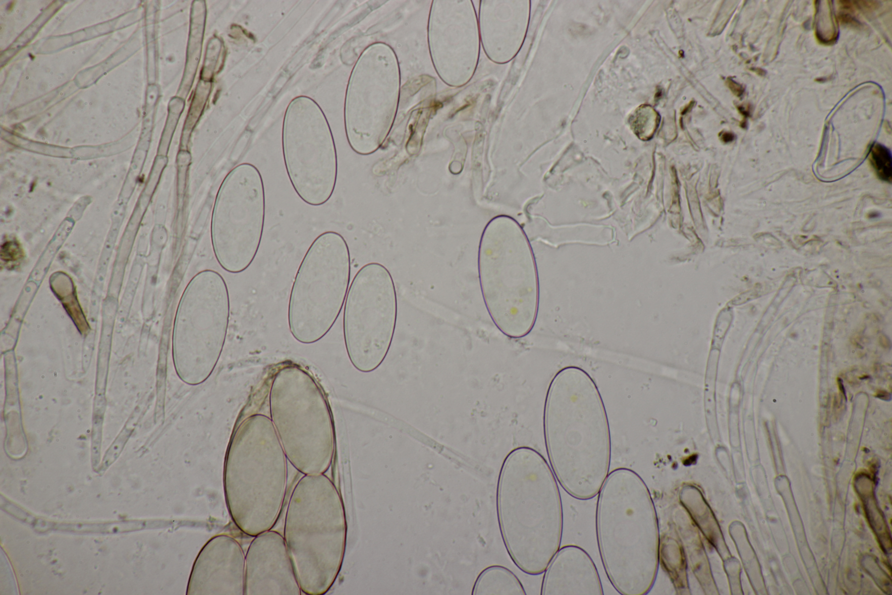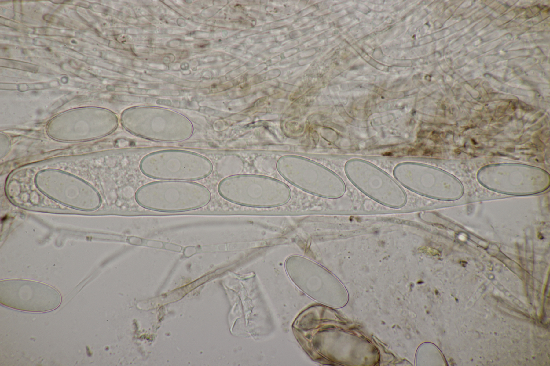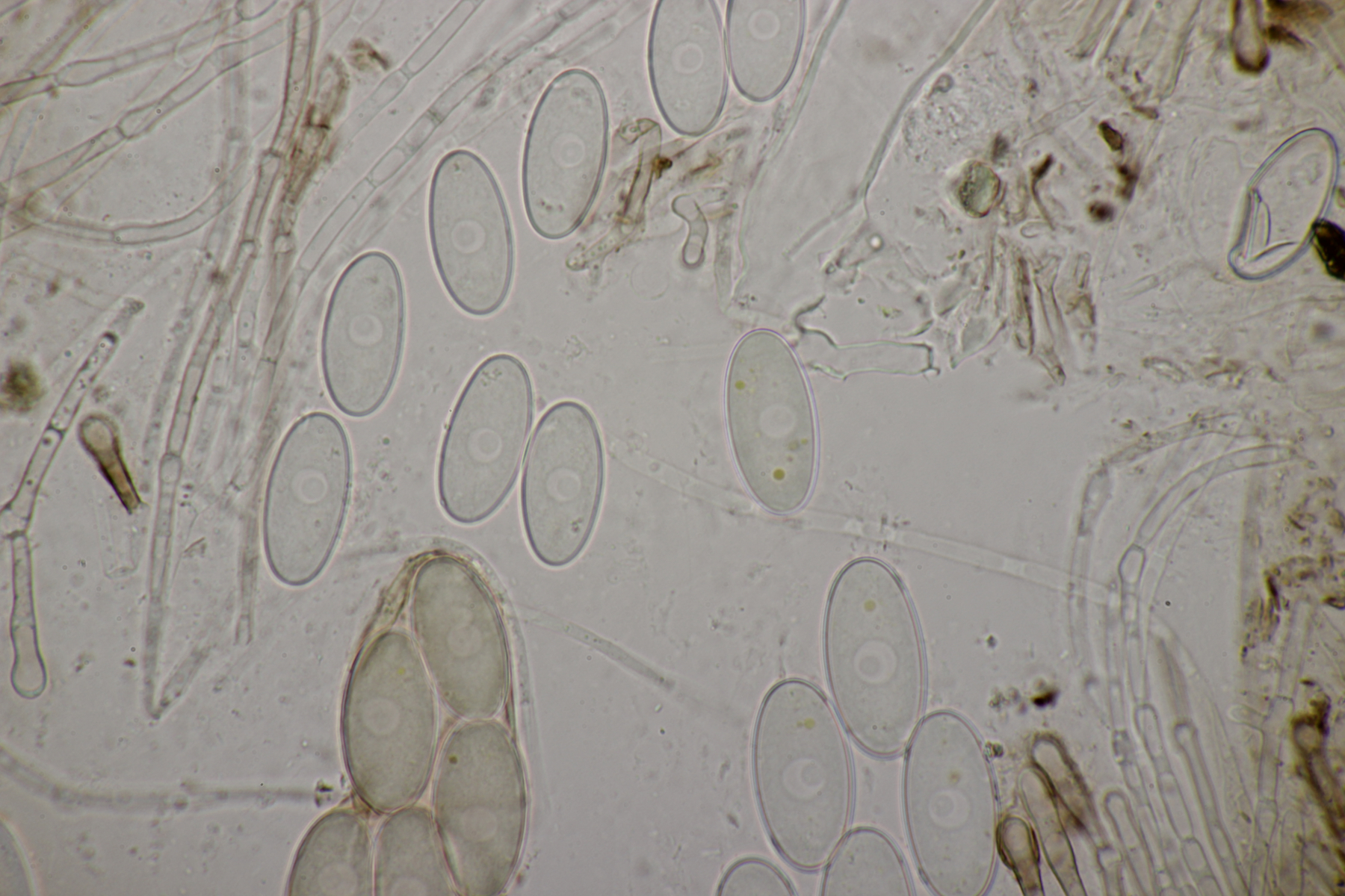 2. Oben erkennt man zwischen den Pseudombrophilas auch einige ganz junge Pilobolusse. In Kultur haben die sich dann prächtig entwickelt. Die Sporen messen (5.3+-0.3) µm x (3.6+-0.3) µm, Q=1.5+-0.1, (4.8-5.9) µm x (3.1-4.2) µm, Q=1.2-1.7, womit ich dann wegen fehlenden Buckels bei Pilobolus roridus lande.
