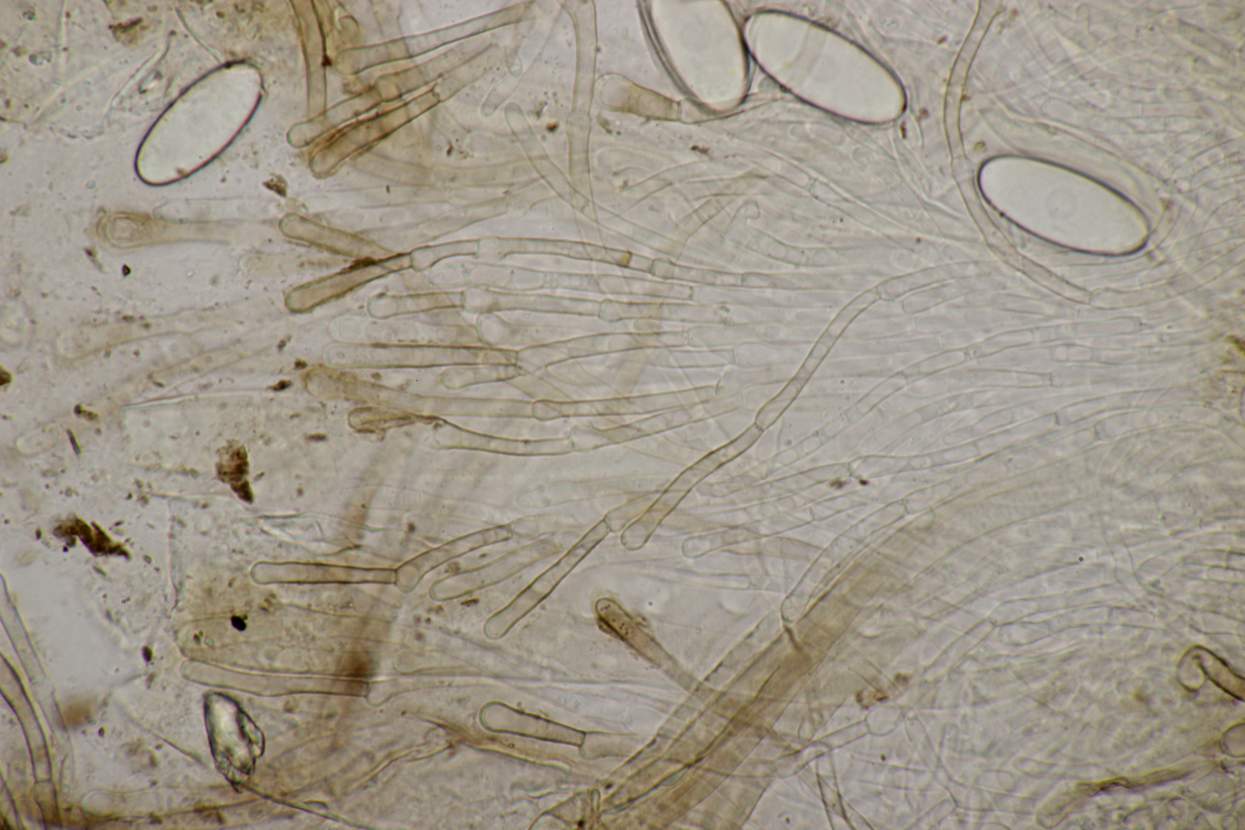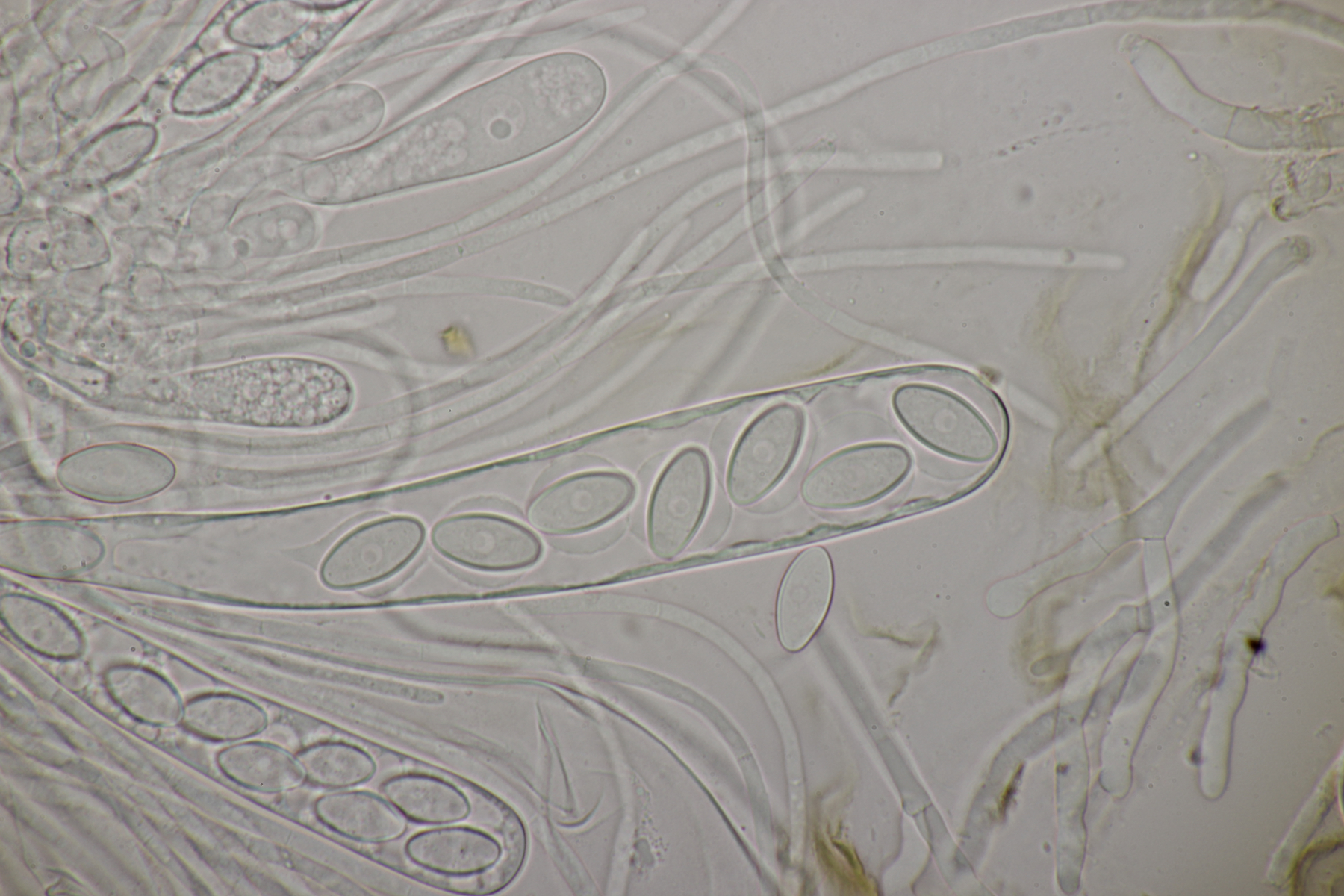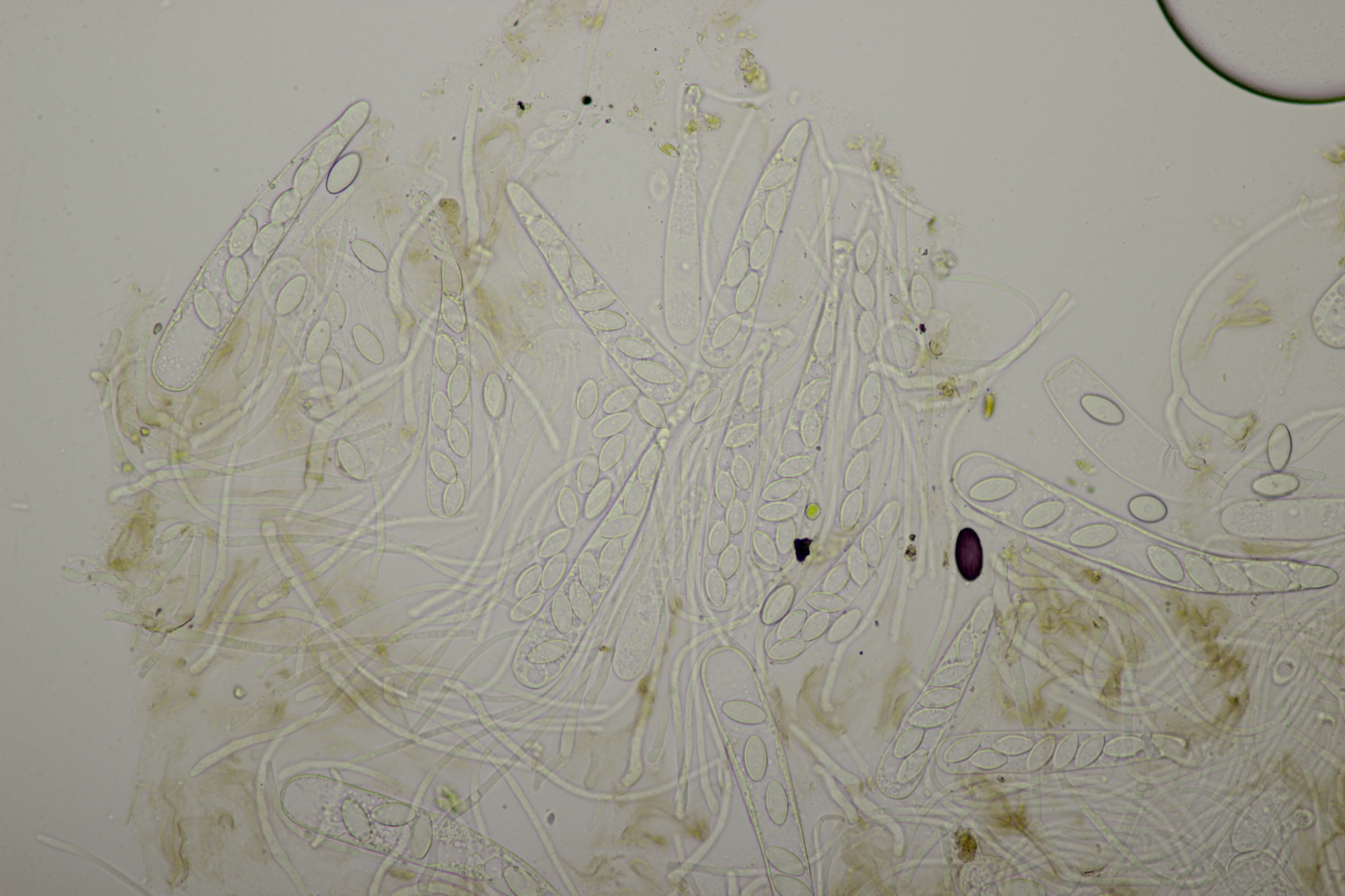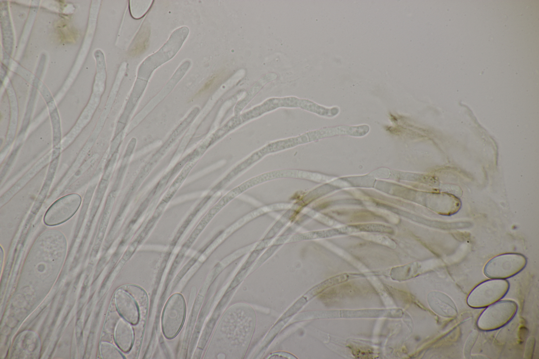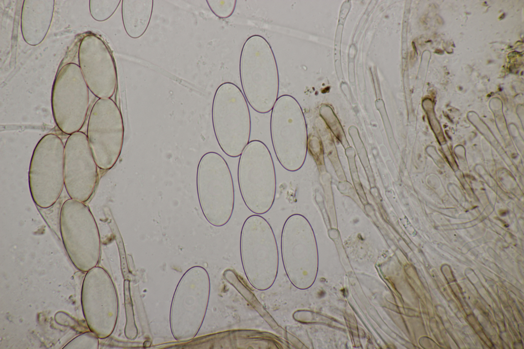 2. Oben erkennt man zwischen den Pseudombrophilas auch einige ganz junge Pilobolusse. In Kultur haben die sich dann prächtig entwickelt. Die Sporen messen (5.3+-0.3) µm x (3.6+-0.3) µm, Q=1.5+-0.1, (4.8-5.9) µm x (3.1-4.2) µm, Q=1.2-1.7, womit ich dann wegen fehlenden Buckels bei Pilobolus roridus lande.