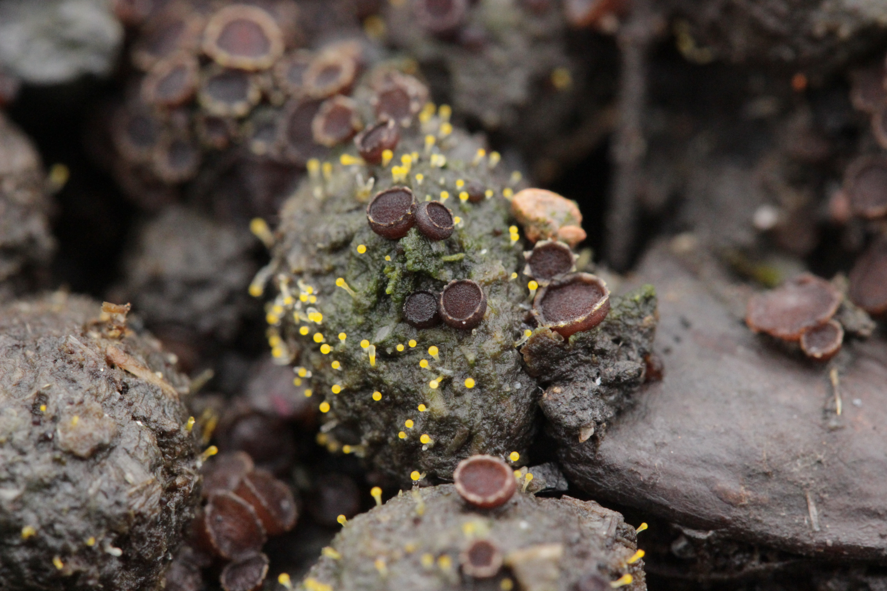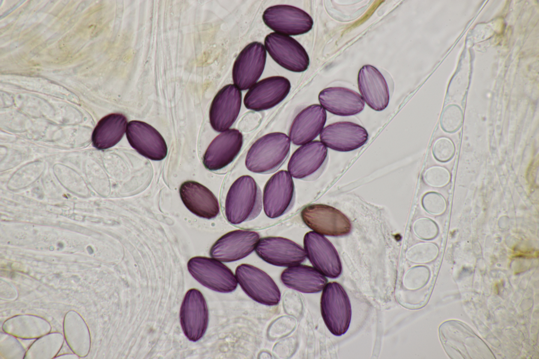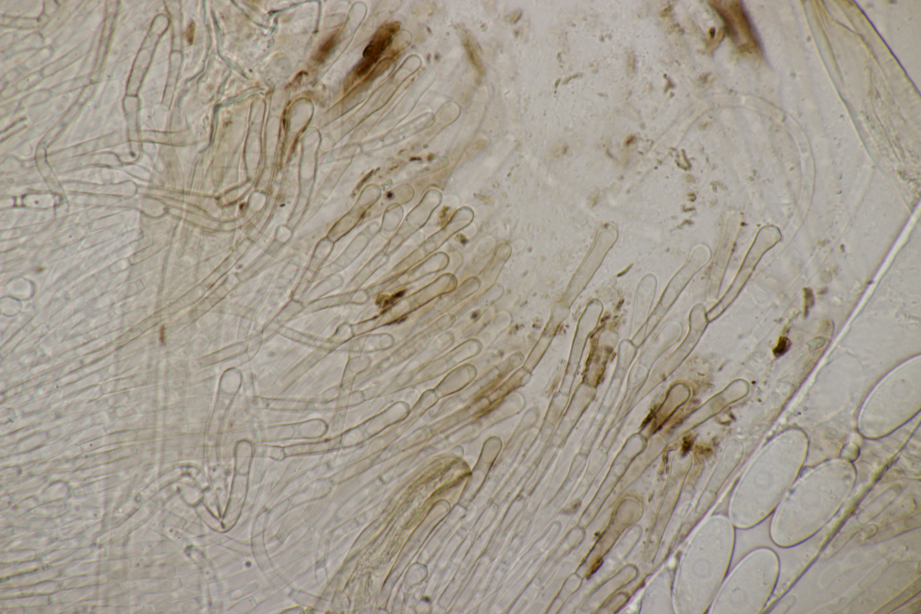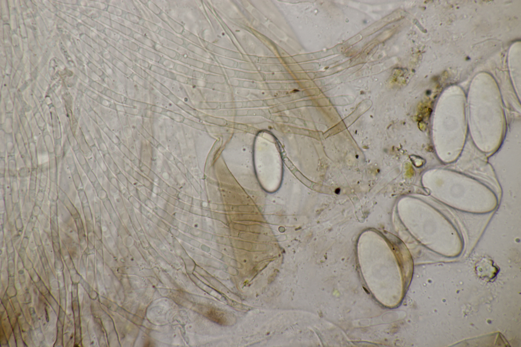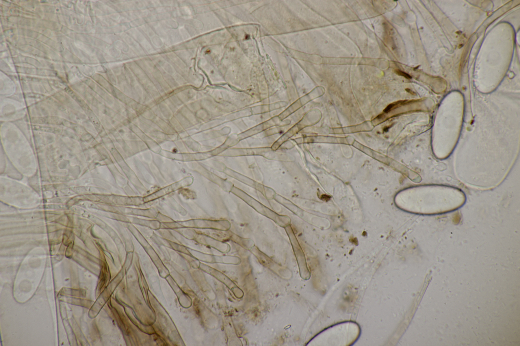 2. Oben erkennt man zwischen den Pseudombrophilas auch einige ganz junge Pilobolusse. In Kultur haben die sich dann prächtig entwickelt. Die Sporen messen (5.3+-0.3) µm x (3.6+-0.3) µm, Q=1.5+-0.1, (4.8-5.9) µm x (3.1-4.2) µm, Q=1.2-1.7, womit ich dann wegen fehlenden Buckels bei Pilobolus roridus lande.