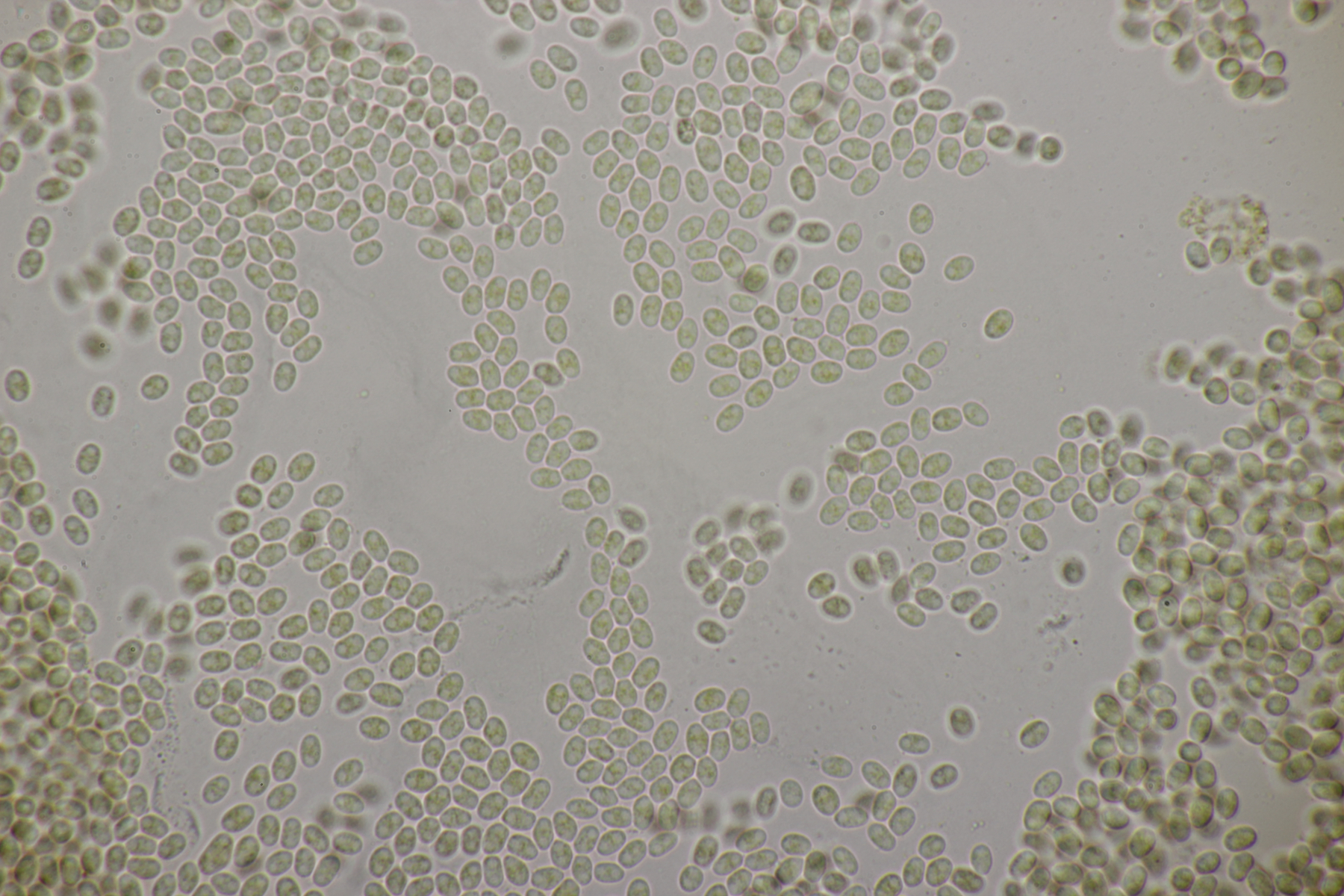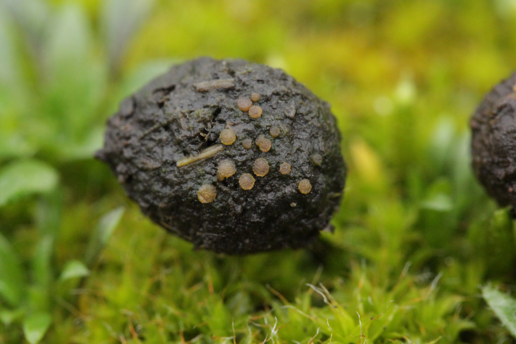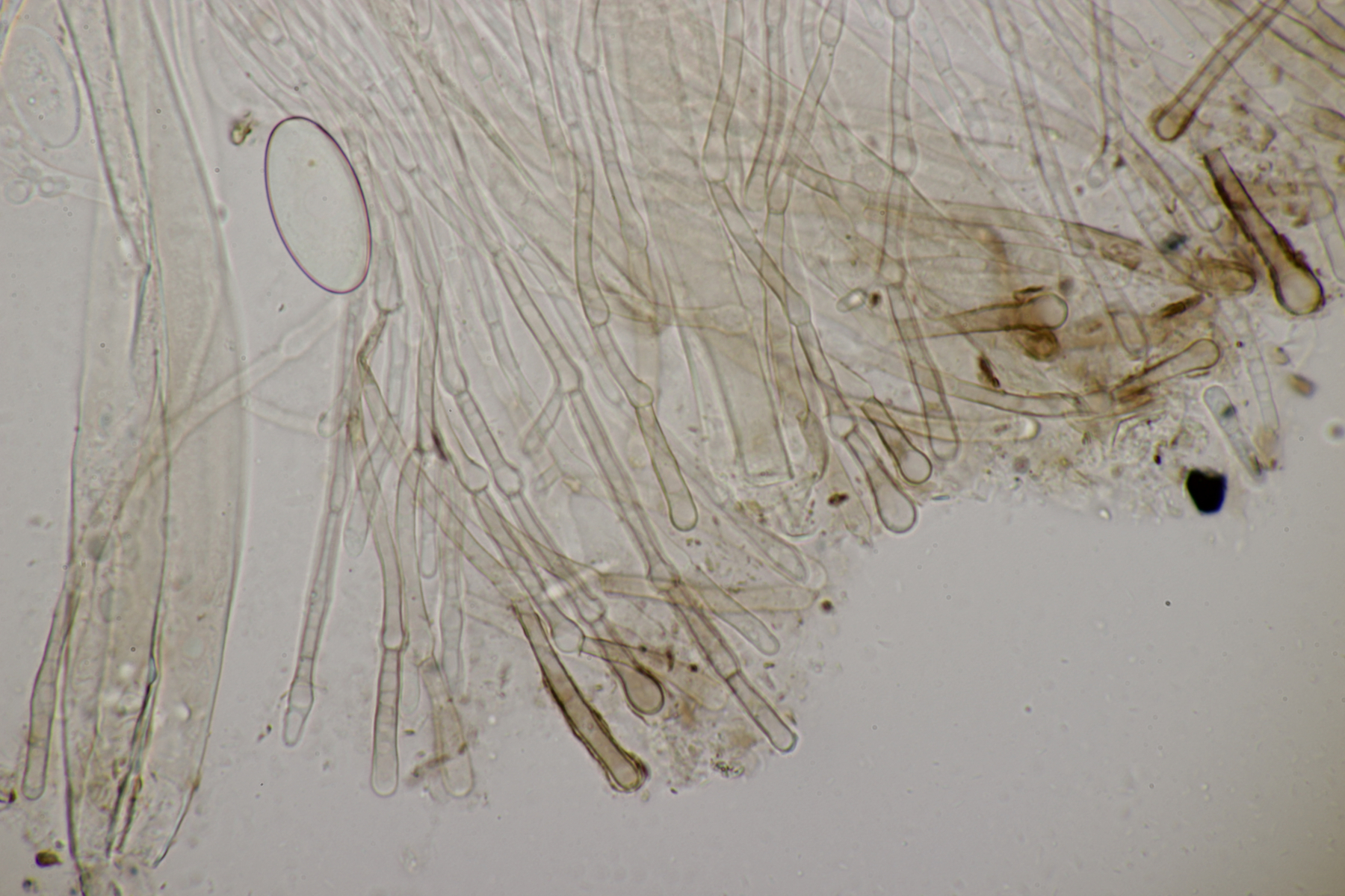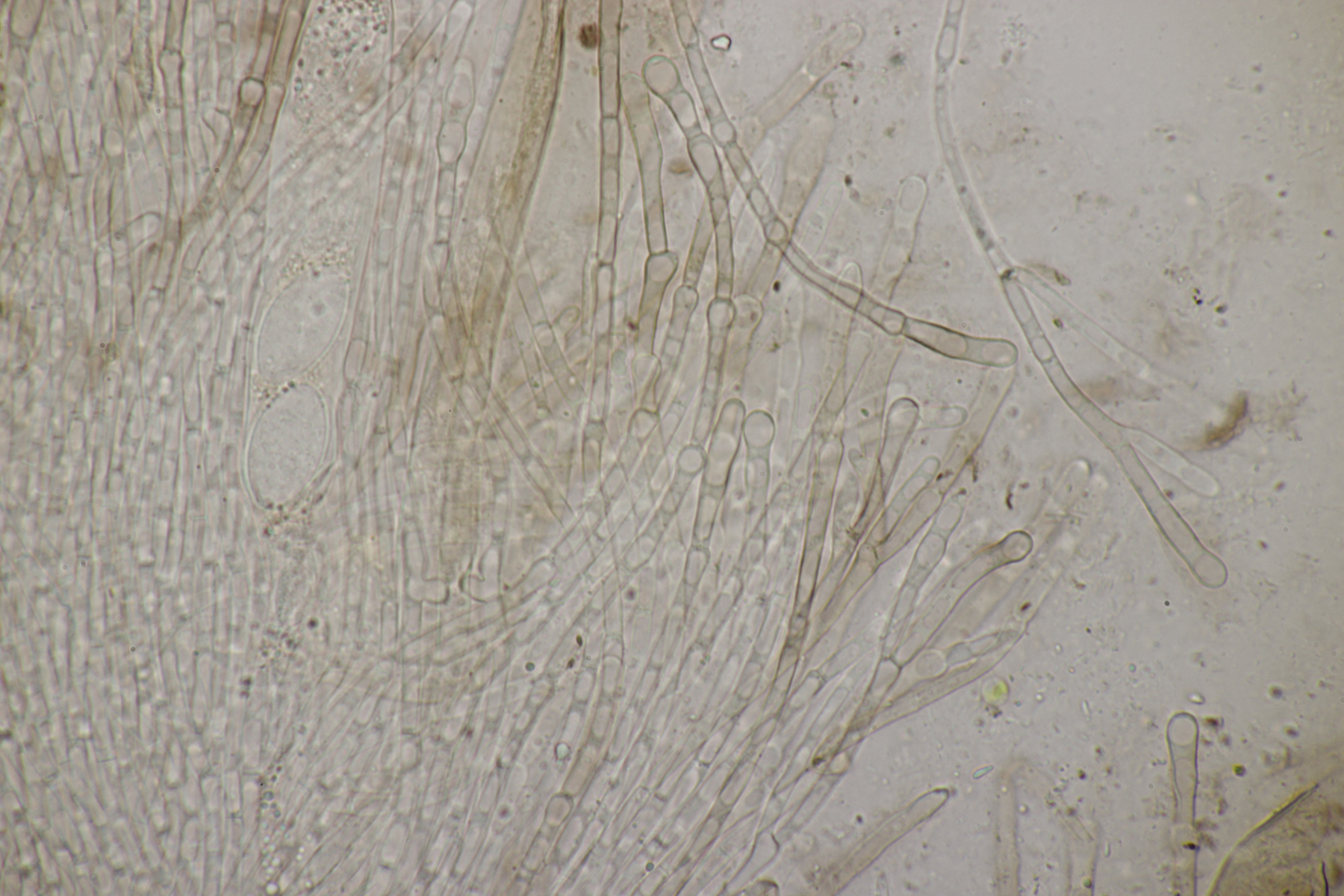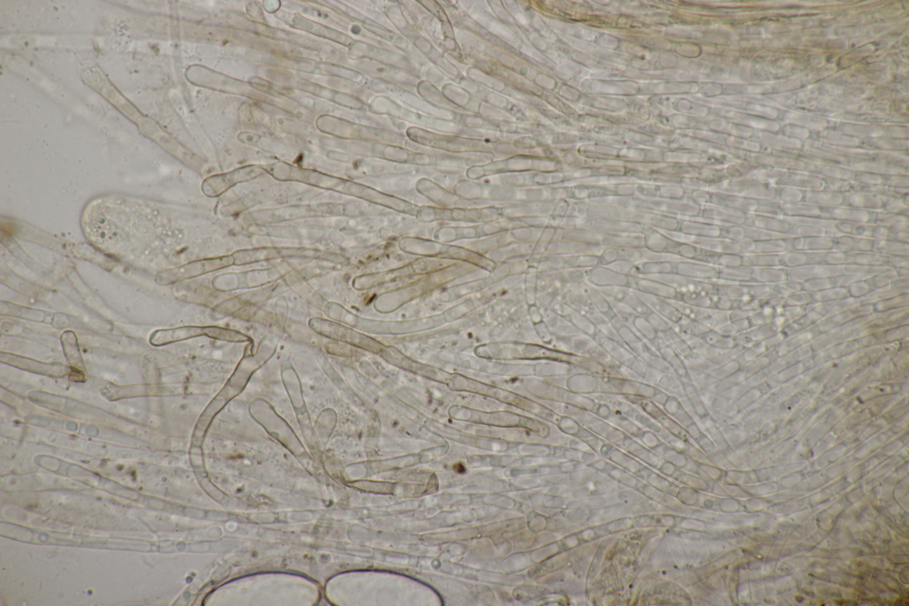 2. Oben erkennt man zwischen den Pseudombrophilas auch einige ganz junge Pilobolusse. In Kultur haben die sich dann prächtig entwickelt. Die Sporen messen (5.3+-0.3) µm x (3.6+-0.3) µm, Q=1.5+-0.1, (4.8-5.9) µm x (3.1-4.2) µm, Q=1.2-1.7, womit ich dann wegen fehlenden Buckels bei Pilobolus roridus lande.