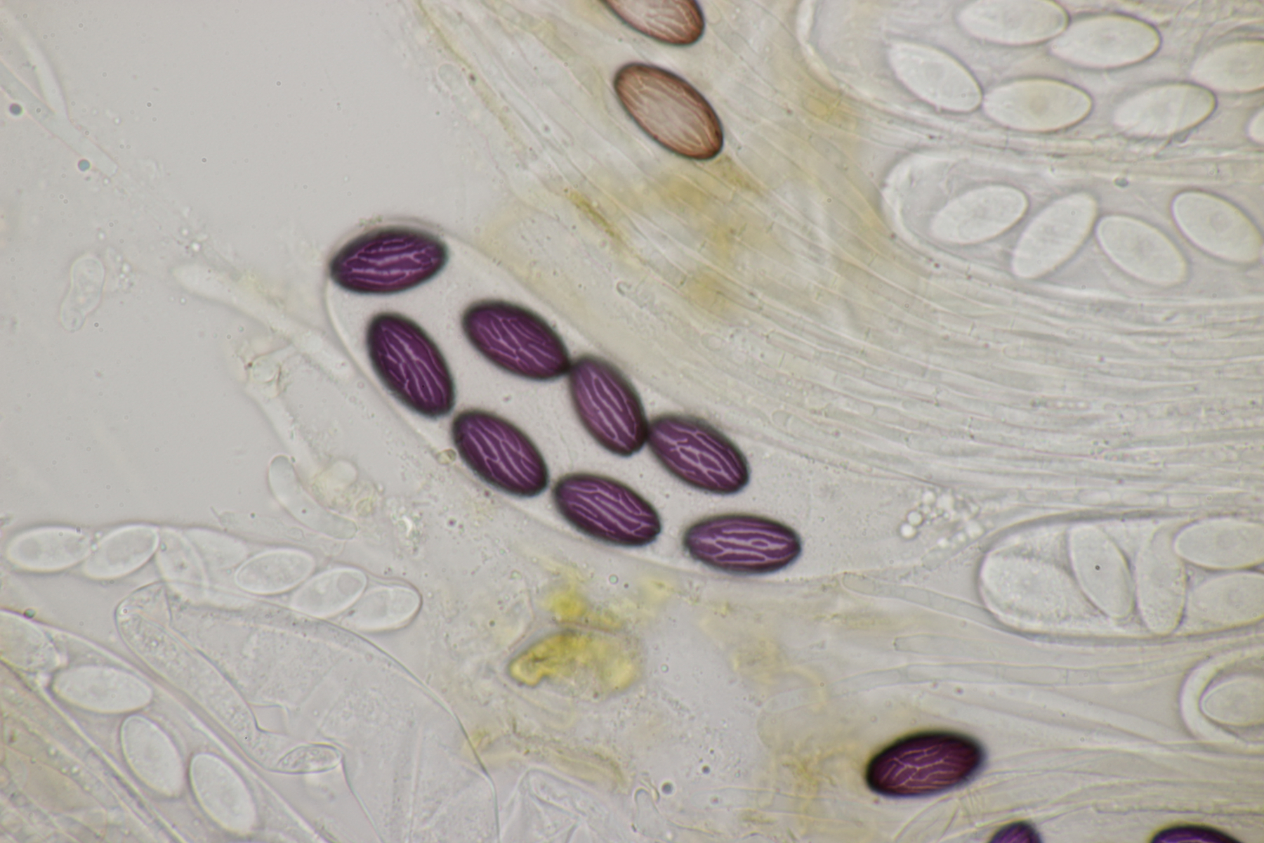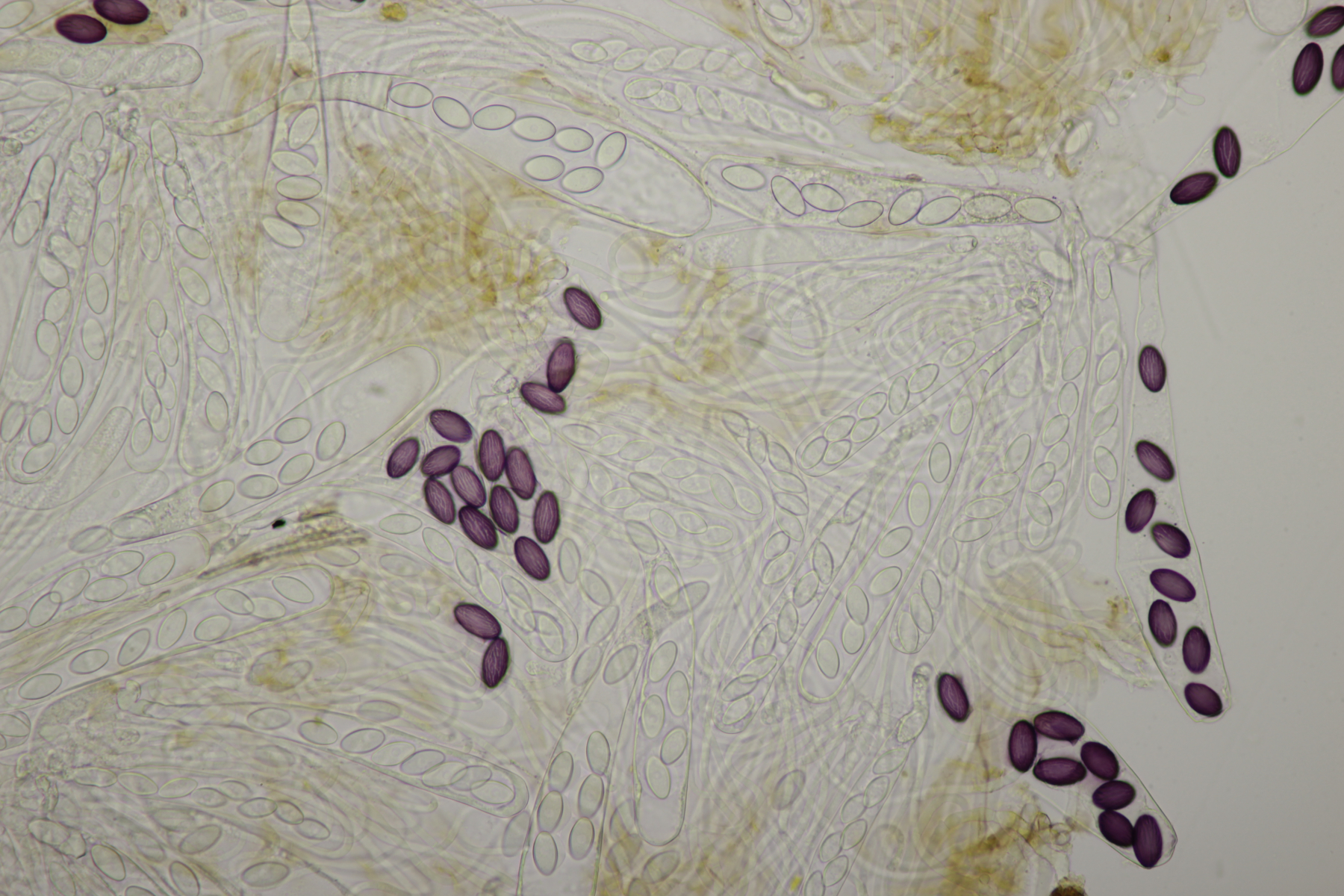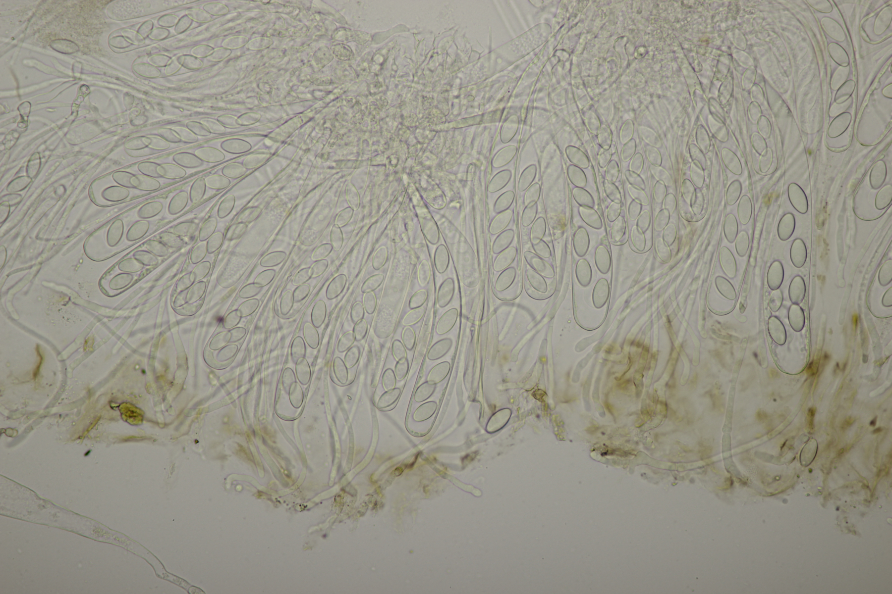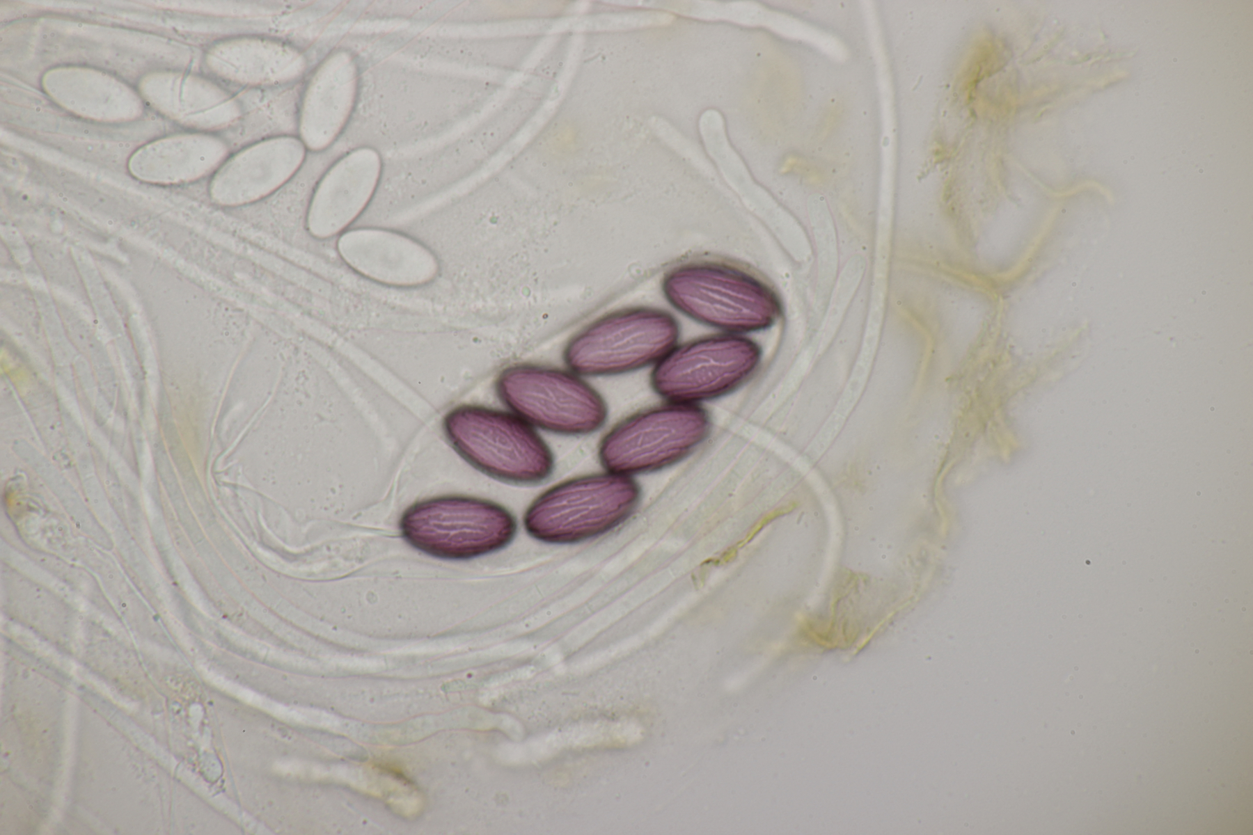 Recht dunkle Ascobolusse auf Kaninchendung. Sporen messen (18.1-22.5) µm x (10.5-12.4) µm und haben parallele Riefen. Dann setze ich bei van Brummelen mit der Sect. Ascobolus an und schlüssele über 1* -> 4 -> 5* -> 8* -> 11* -> 12* zu Ascobolus albidus. Geht ihr da mit?